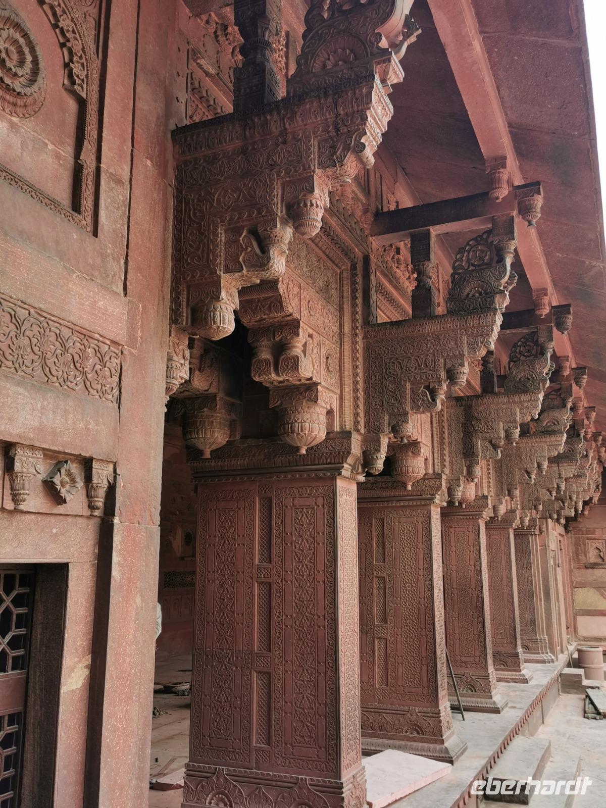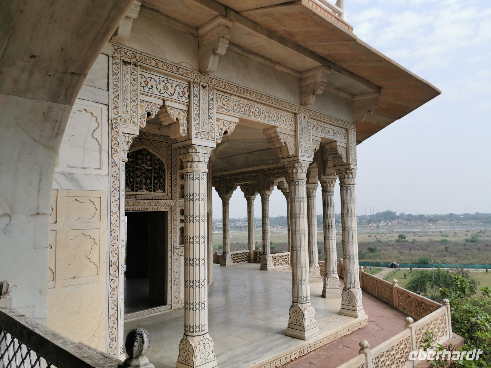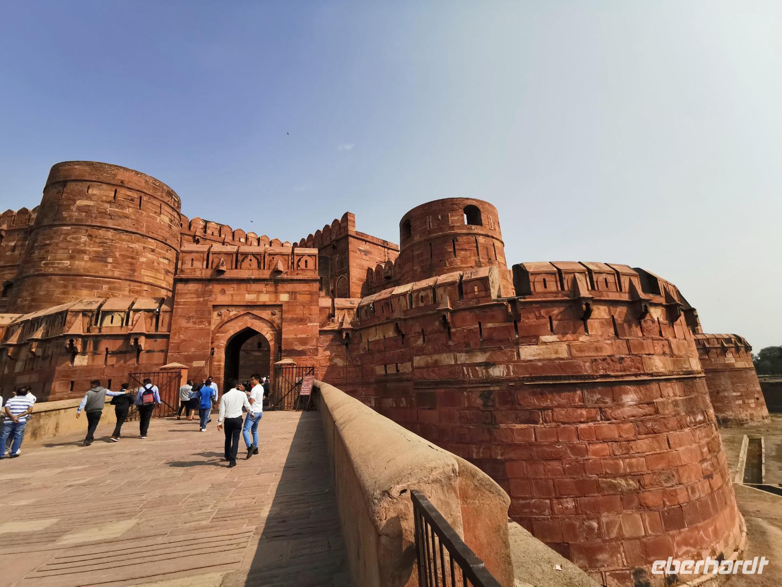 Diese halbmondförmig angelegte Palastanlage, die von bis zu 21 Meter hohen Mauern umgeben wird, besteht aus Ziegelsteinen und wurde mit roten Sandsteinplatten verkleidet. Dieser gigantische Bau wurde 1565 unter Mogul Akbar dem Großen begonnen, der die damalige Hauptstadt aus Delhi hierher nach Agra verlegen ließ. Shah Jahan, der Erbauer des Taj Mahal, ließ Innenbauten aus weißem Marmor mit Verzierungen aus Glas und Halbedelsteinen einbauen. Leider wurden alle Intarsien von den englischen Kolonialherren entfernt und geraubt und nur an wenigen Stellen, die langsam liebevoll saniert werden, kann man die einstige Pracht dieser Anlage erahnen.