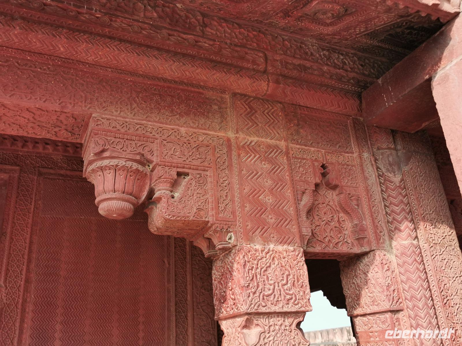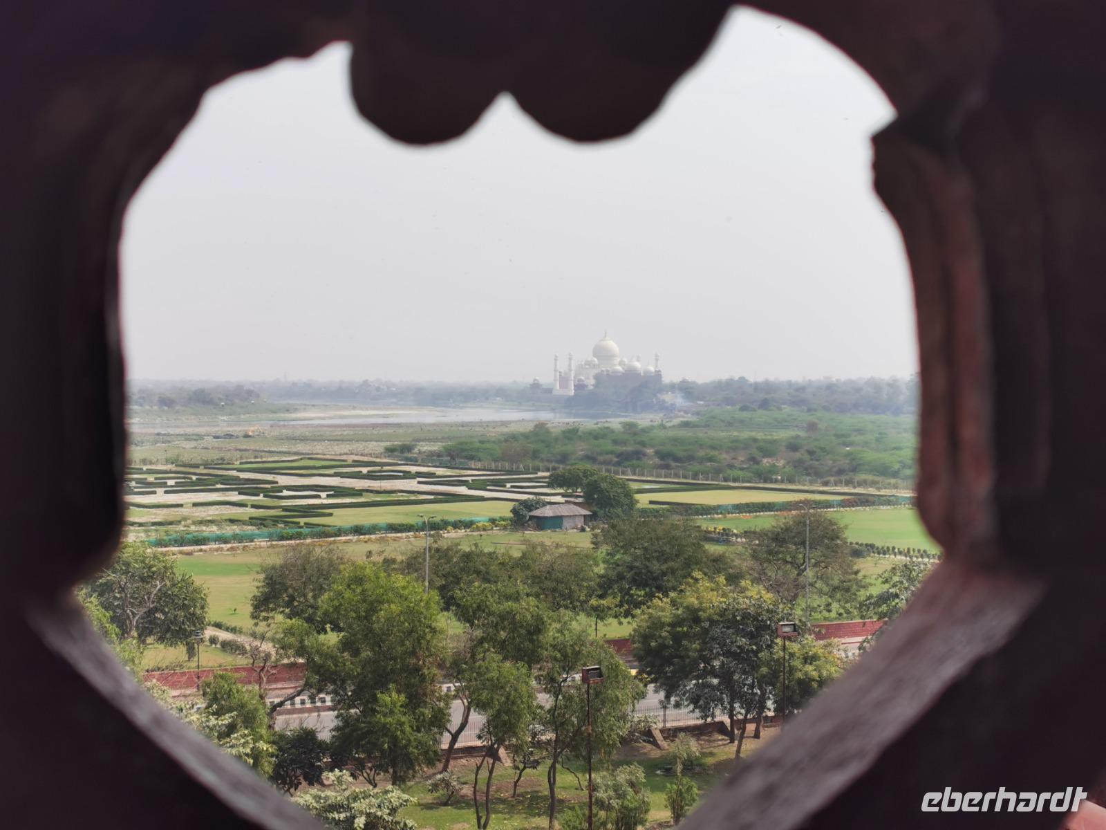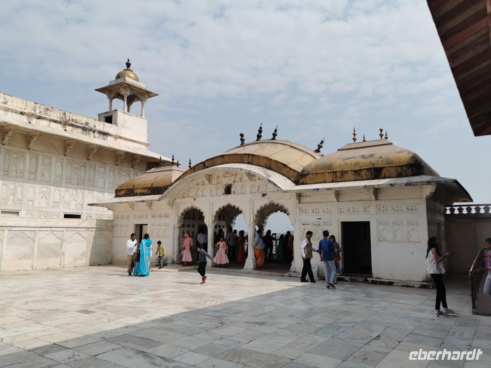 Diese halbmondförmig angelegte Palastanlage, die von bis zu 21 Meter hohen Mauern umgeben wird, besteht aus Ziegelsteinen und wurde mit roten Sandsteinplatten verkleidet. Dieser gigantische Bau wurde 1565 unter Mogul Akbar dem Großen begonnen, der die damalige Hauptstadt aus Delhi hierher nach Agra verlegen ließ. Shah Jahan, der Erbauer des Taj Mahal, ließ Innenbauten aus weißem Marmor mit Verzierungen aus Glas und Halbedelsteinen einbauen. Leider wurden alle Intarsien von den englischen Kolonialherren entfernt und geraubt und nur an wenigen Stellen, die langsam liebevoll saniert werden, kann man die einstige Pracht dieser Anlage erahnen.