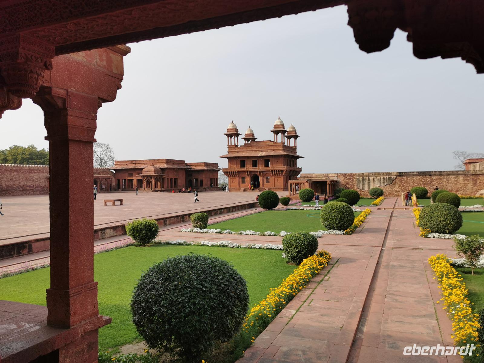 In der "Stadt des Sieges" gibt es filigrane Sandsteinpaläste, erbaut vom Großmogul Akhbar im Jahre 1571. Diese karminroten Paläste ragen verlassen aus der kargen Ebene auf und müssen zur Zeit der Erbauung wie ein Märchenschloß in der umliegenden Wüste gewirkt haben. Prächtig sind die Fenster mit vielen zierlichen Steinmetzarbeiten gefertigt, die vielen Höfe, Harems- und Herrschaftsgebäude mit persischen Kuppeln. Einige kennen vielleicht den schwülstigen, bildgewaltigen indischen Film Jodha Akbar, der gern zur Weihnachtszeit im deutschen Fernsehen läuft. Dieser Film handelt vom Leben genau dieses Moguls, der als erster muslimischer Herrscher eine Hindufrau ehelichte.