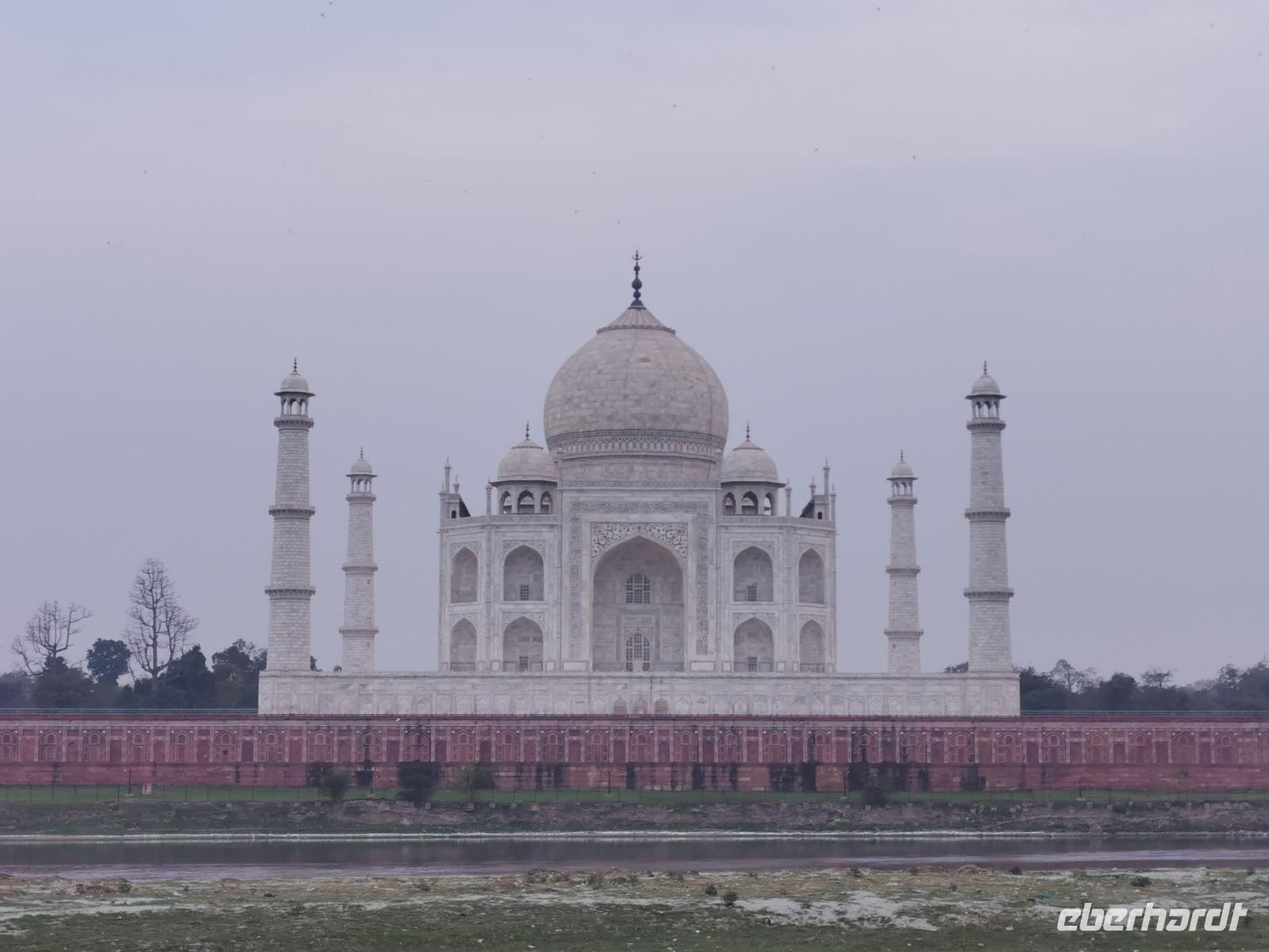 Wohl kaum ein anderes Bauwerk verkörpert für Gäste aus aller Welt so sehr Indien wie die in den Jahren 1631 bis 1648 errichtete "Krone des Palastes", was Taj Mahal übersetzt bedeutet. Mogulkaiser Shah Jahan ließ diesen Bau zum Gedenken an seine bei der Geburt des 13. Kindes verstorbene Liebe Mumtaz Mahal errichten. 20.000 Handwerker aus allen Teilen Süd- und Zentralasiens waren am Bau beteiligt, die Materialien wurden mühevoll mit über 1.000 Elefanten herangeschafft. Verwendet wurden Ziegelsteine, die innen und außen mit Marmor überzogen wurden. Vor allem im Innenraum des Grabmals kann der Besucher bis heute die hervorragende Handwerkskunst der damaligen Intarsienkünstler bewundern: Jaspis aus dem Punjab, Achat aus dem Jemen, Kristall aus China, Lapislazuli und Saphire aus Ceylon und Korallen aus Arabien überziehen die Wände mit floralen Ornamenten. Rechts und links wird der weiße Bau von zwei Gebäuden eingerahmt, die aus rotem Sandstein mit Verzierungen aus weißem Marmor geschaffen wurden. Das westliche davon zeigt in Richtung Mekka und war eine Moschee und das im Osten liegende wurde früher als Gästehaus genutzt.