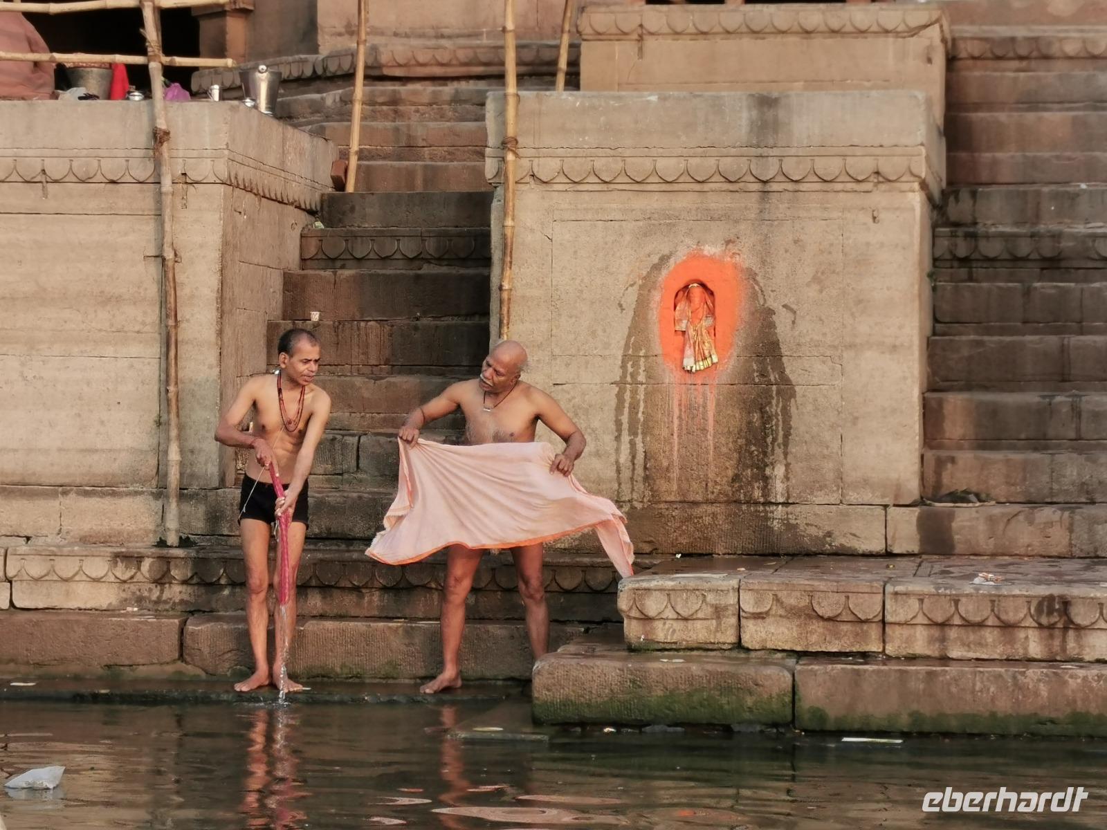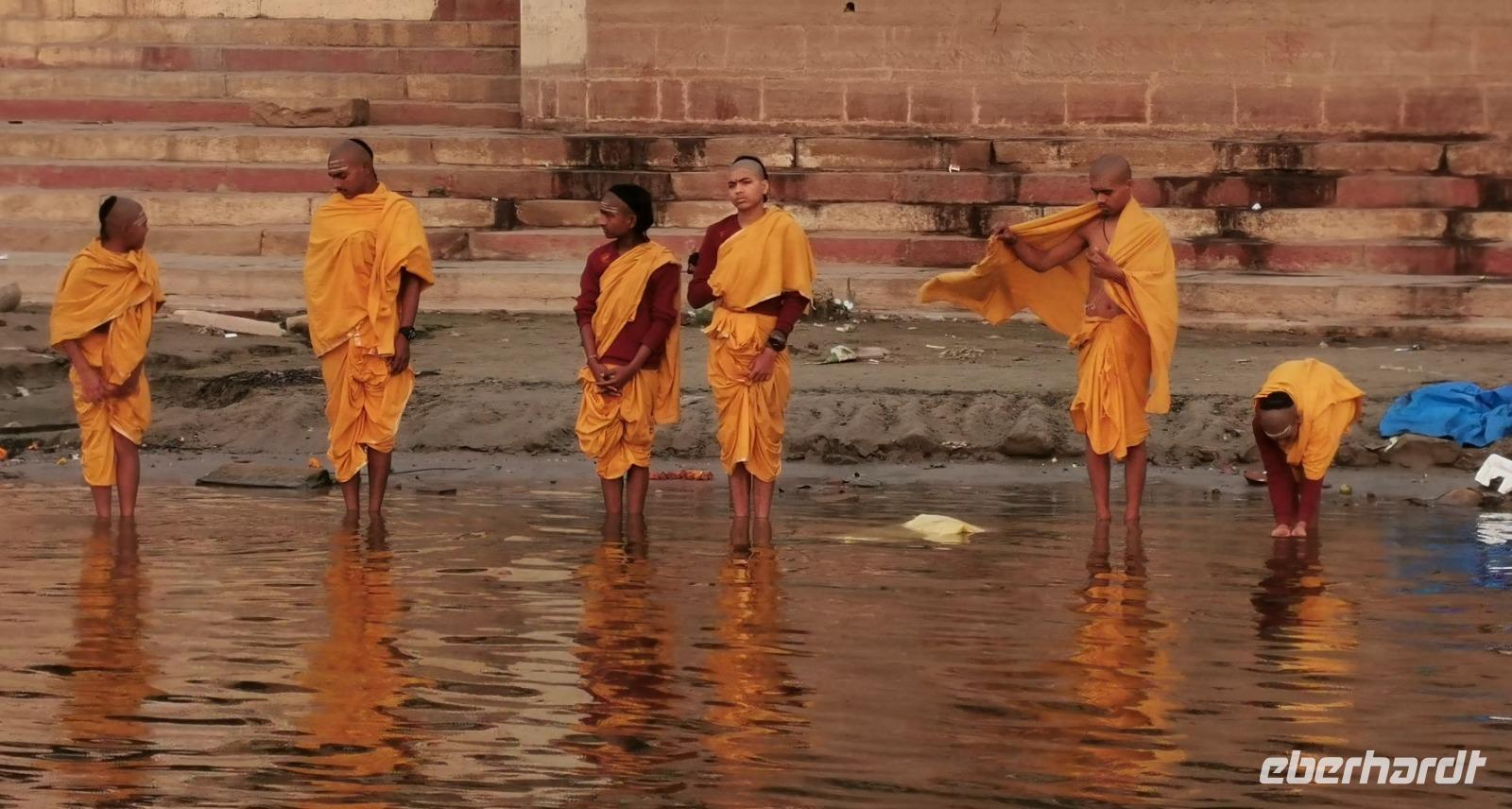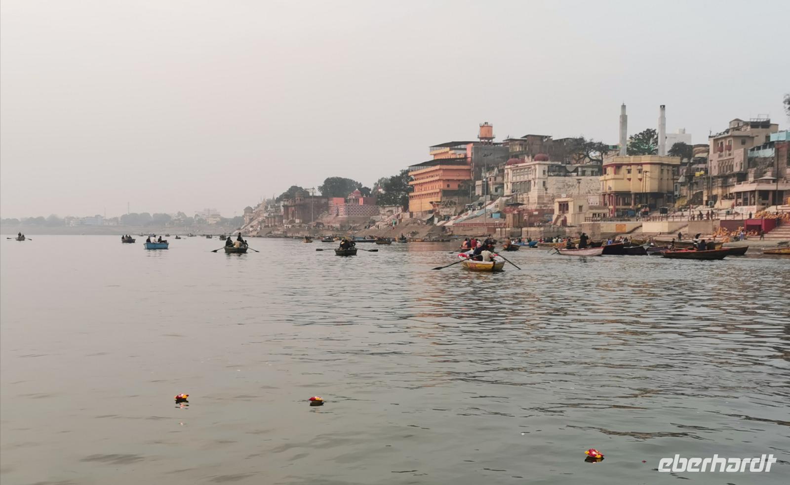 Im Boot gleiten wir auf den heiligen Fluten an der Kulisse von Varanasi vorbei, sehen einige der Ghats, schauen den Menschen bei ihren rituellen Waschungen und Gebeten zu. Wir erblicken eine Gruppe Priester-Schüler, die ihre Zeremonie am Ufer abhält und auch für die ganz irdischen Freuden ist gesorgt. Boote mit Souvenirs holen uns mehrmals ein und bieten uns ihre Waren feil. Shopping on water - sozusagen.