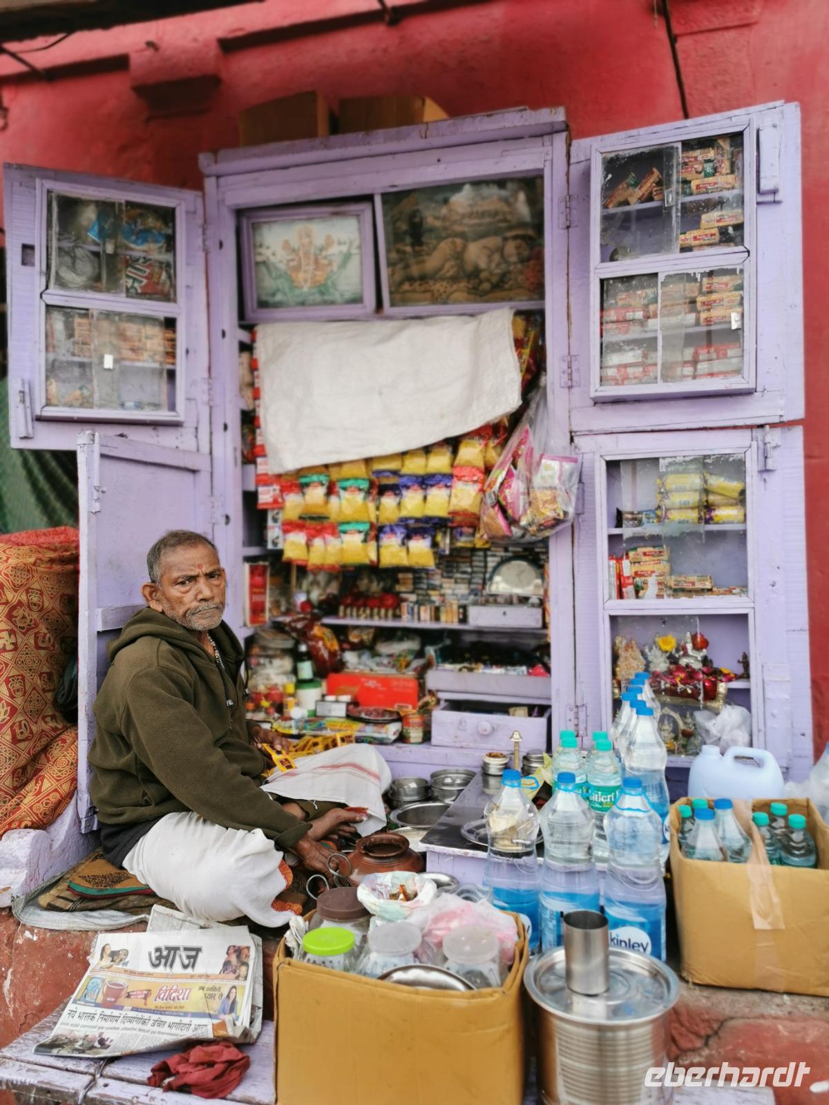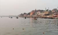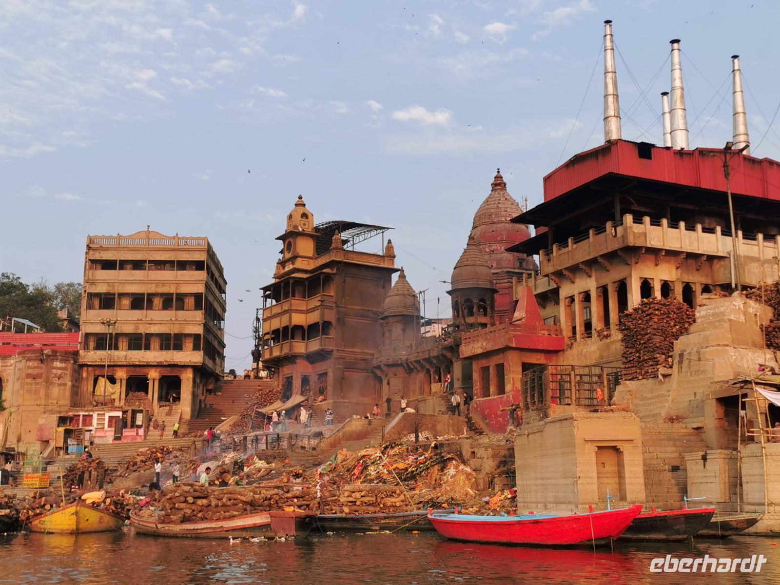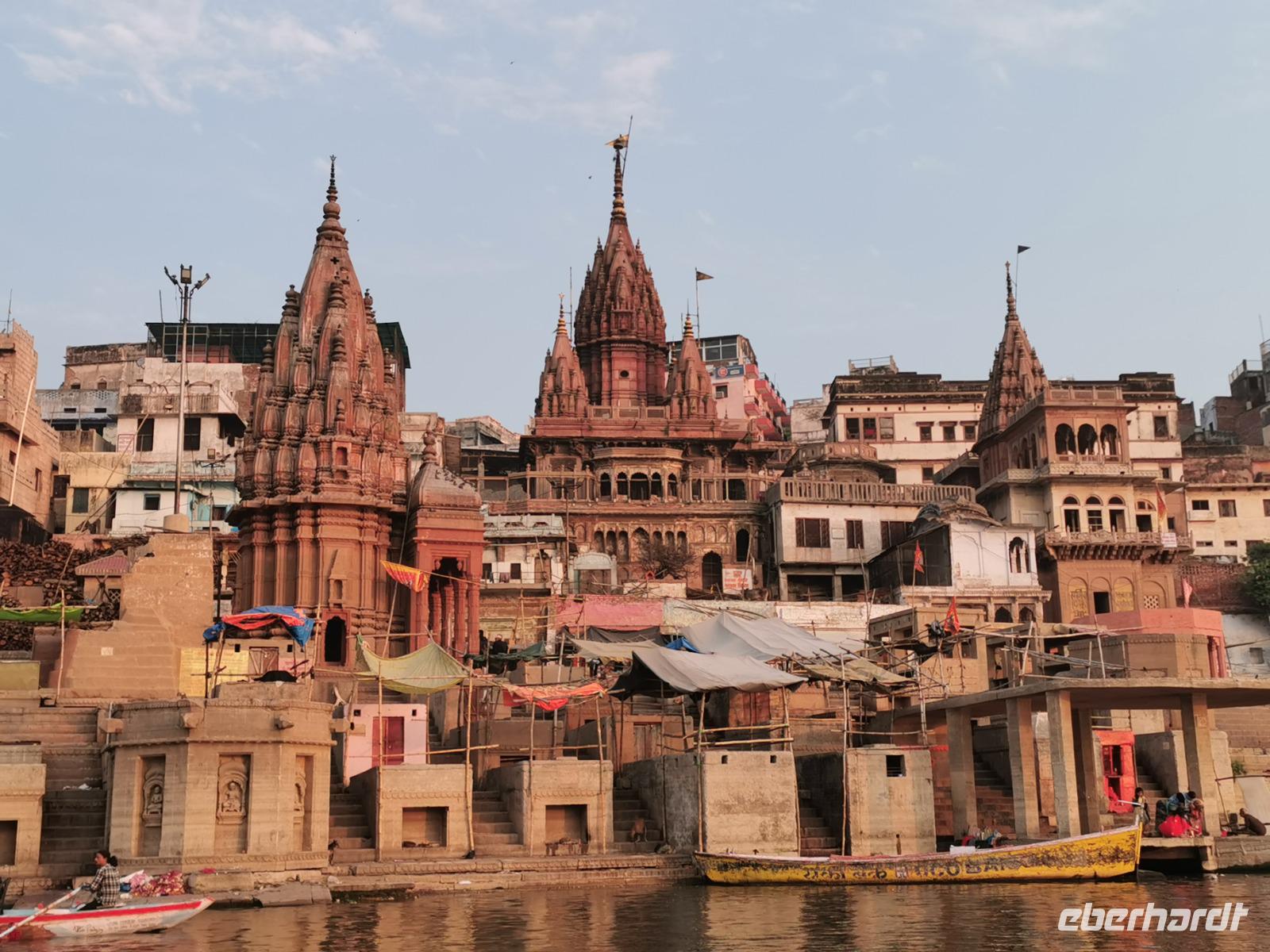 Im Boot gleiten wir auf den heiligen Fluten an der Kulisse von Varanasi vorbei, sehen einige der Ghats, schauen den Menschen bei ihren rituellen Waschungen und Gebeten zu. Wir erblicken eine Gruppe Priester-Schüler, die ihre Zeremonie am Ufer abhält und auch für die ganz irdischen Freuden ist gesorgt. Boote mit Souvenirs holen uns mehrmals ein und bieten uns ihre Waren feil. Shopping on water - sozusagen.