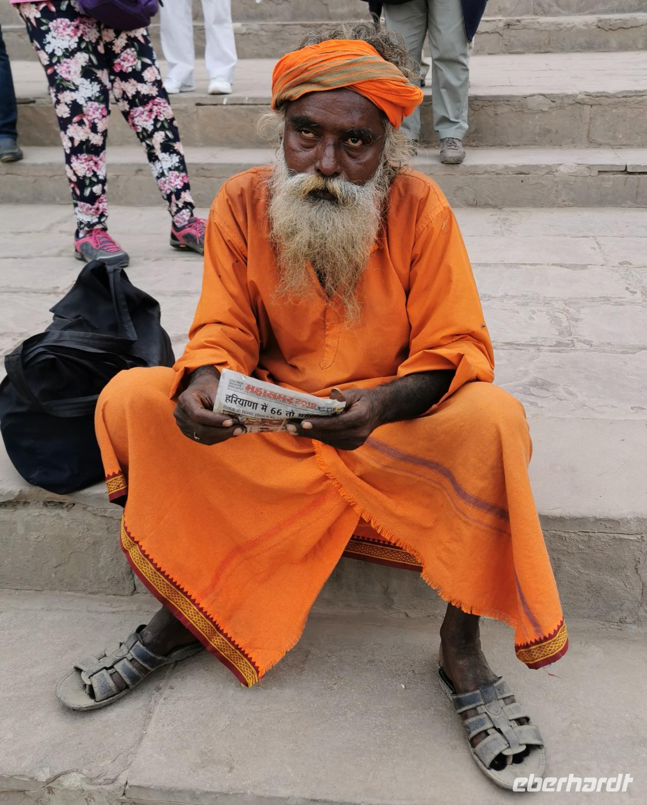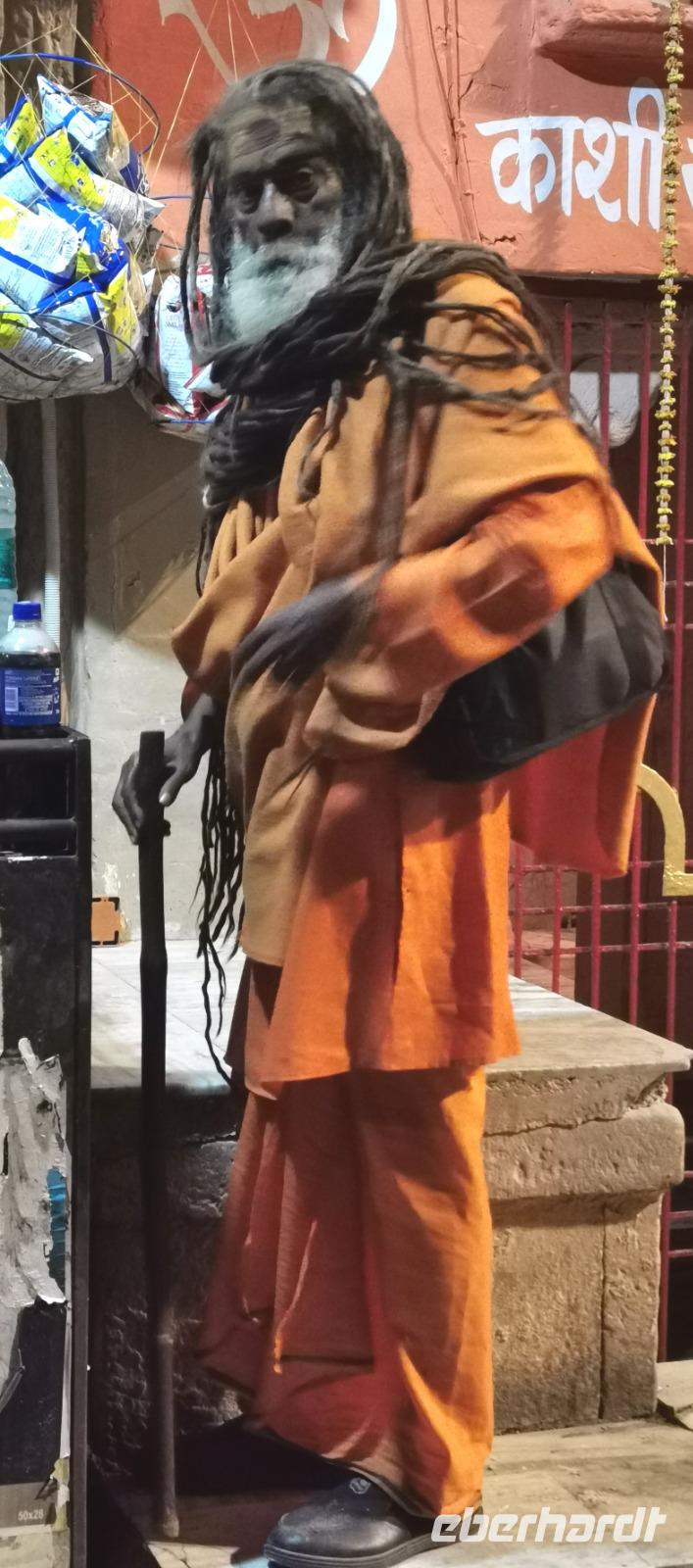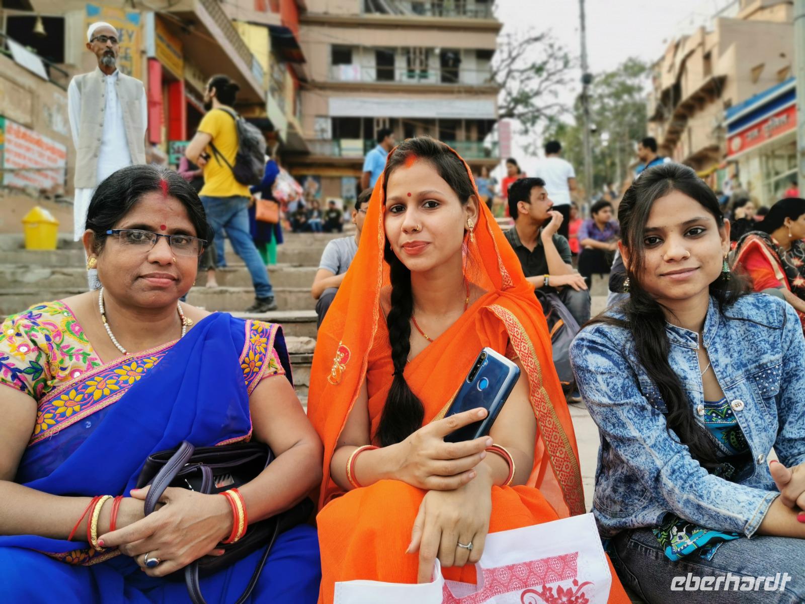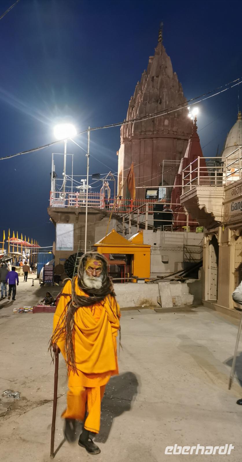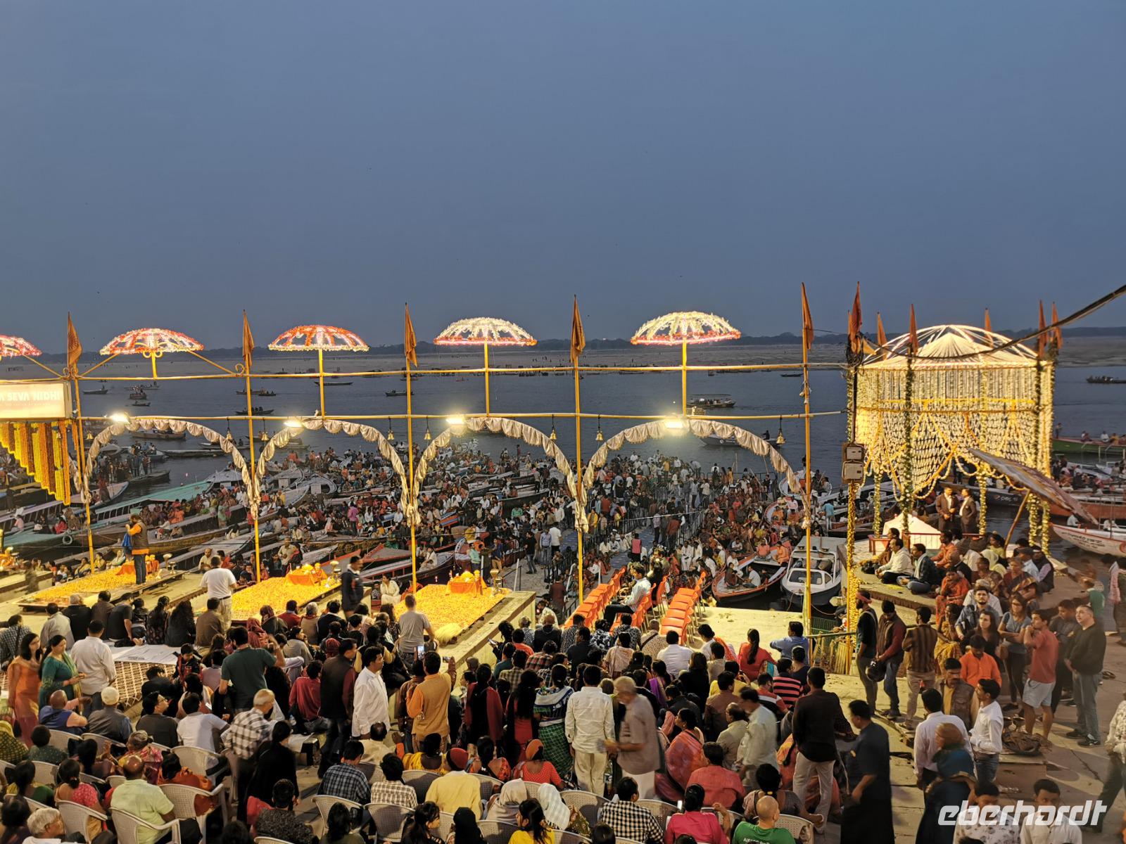 Wir sind fasziniert von Devs Ausführungen und wollen nun unbedingt selbst miterleben, wie das Leben am Flußufer spielt. Mit einer Elektro-Rikshah fahren wir in die Altstadt. Das letzte Stück zum Fluß müssen wir laufen und geraten wortwörtlich in einen Strom. Einen Bürgersteig gibt es nicht, auf dem unebenen Weg, der gleichzeitig die Straße ist, gibt es lockere große Steine und es tummeln sich unzählige indische Besucher, Pilger, Kühe, Hunde, Affen und Straßenhändler. Durch diese ohnehin schon zähe Masse quetschen sich noch Motorräder, Fahrräder und Mopeds. Damit letztere auch ja nicht etwa überhört oder übersehen werden, veranstalten sie gemeinsam ein ohrenbetäubendes Hupkonzert. Wir erreichen erleichtert eine verkehrsfreie Fläche am Flußufer, insgesamt gibt es 84 dieser sogenannten Ghats, und sind erstmal hoffnungslos überfordert von den Eindrücken, die auf uns einprasselten. Aber unser Dev hat mit Hilfe von Volker Plätze auf einer der Terrassen am Hauptghat organisiert und so können wir ungestört vom immer mehr werdenden Besucherstrom die Gebetszeremonie am Abend von oben beobachten.