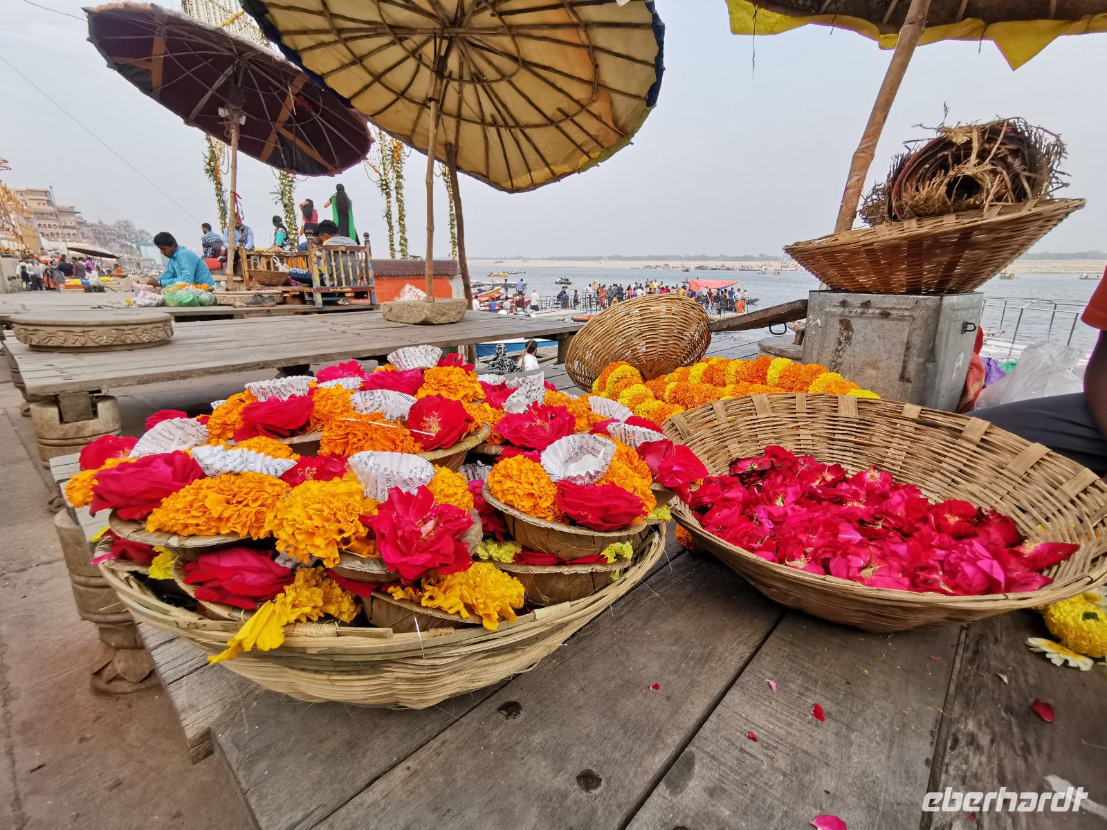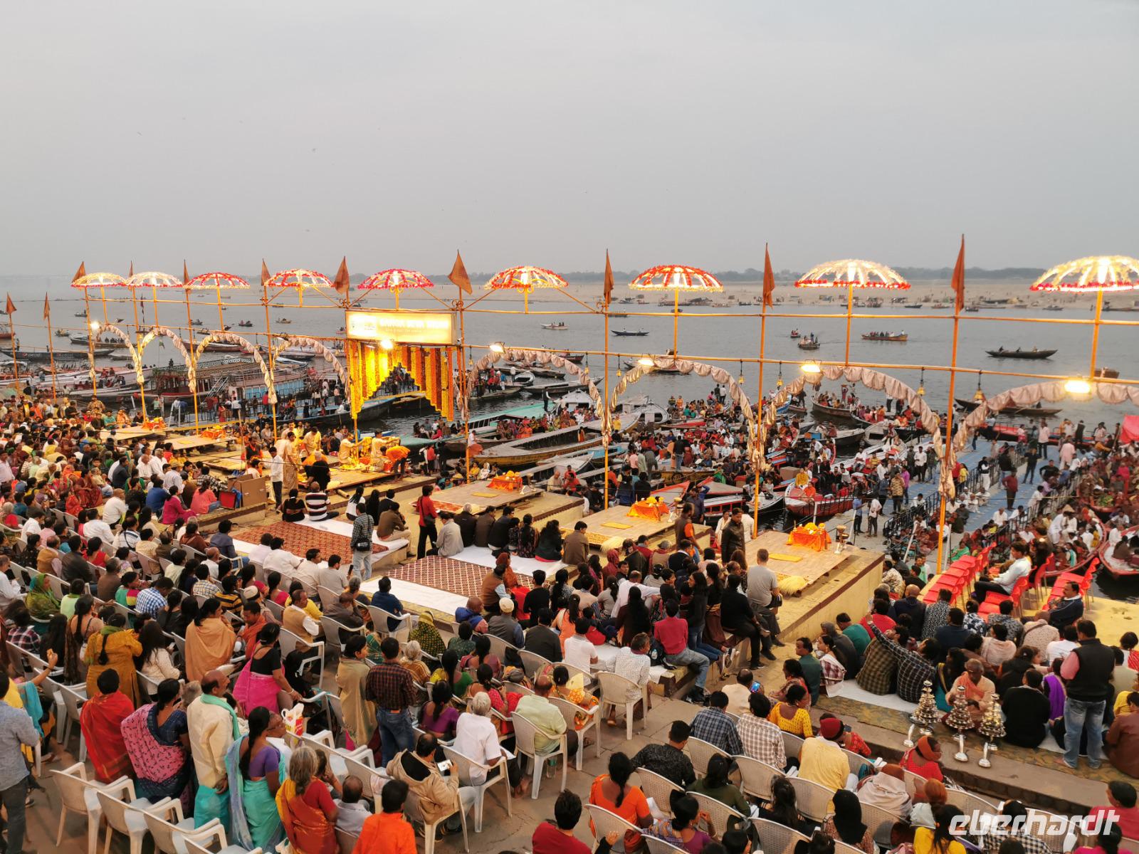Sieben Priester beten am Ufer in einem Meer aus Blumen, schwenken Feuer und Unmengen an Räucherstäbchen, unzählige gläubige Hindus schauen zu und beten gemeinsam mit. Ein Sänger begleitet alles mit seiner Musik. Der Magie dieser Szene kann sich wohl kaum jemand entziehen.