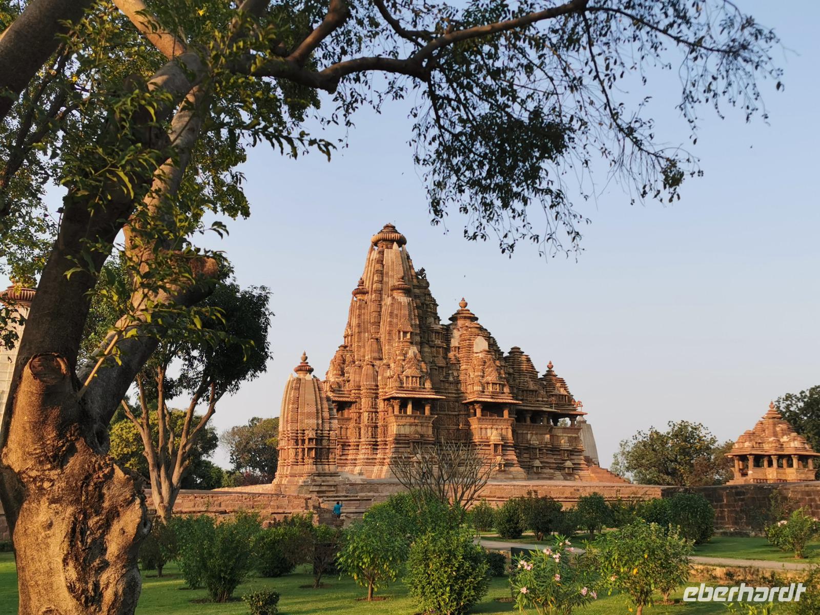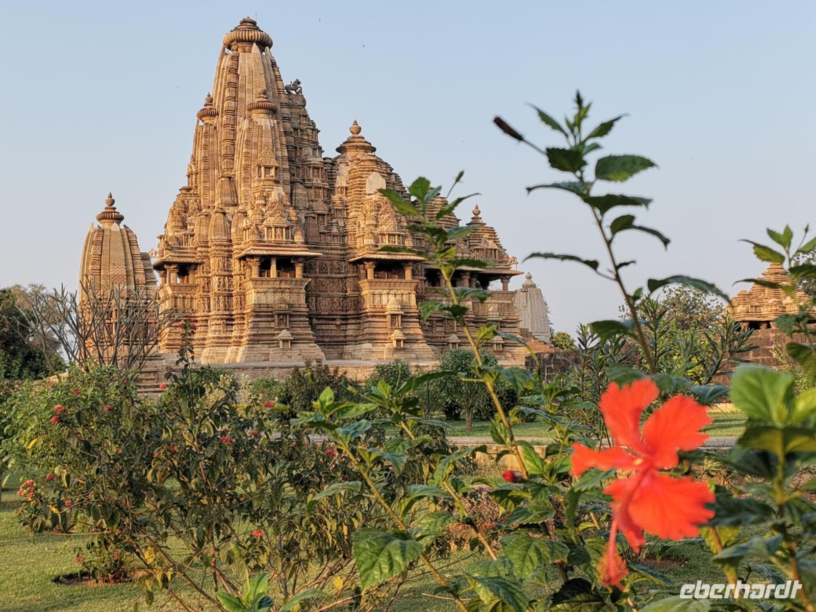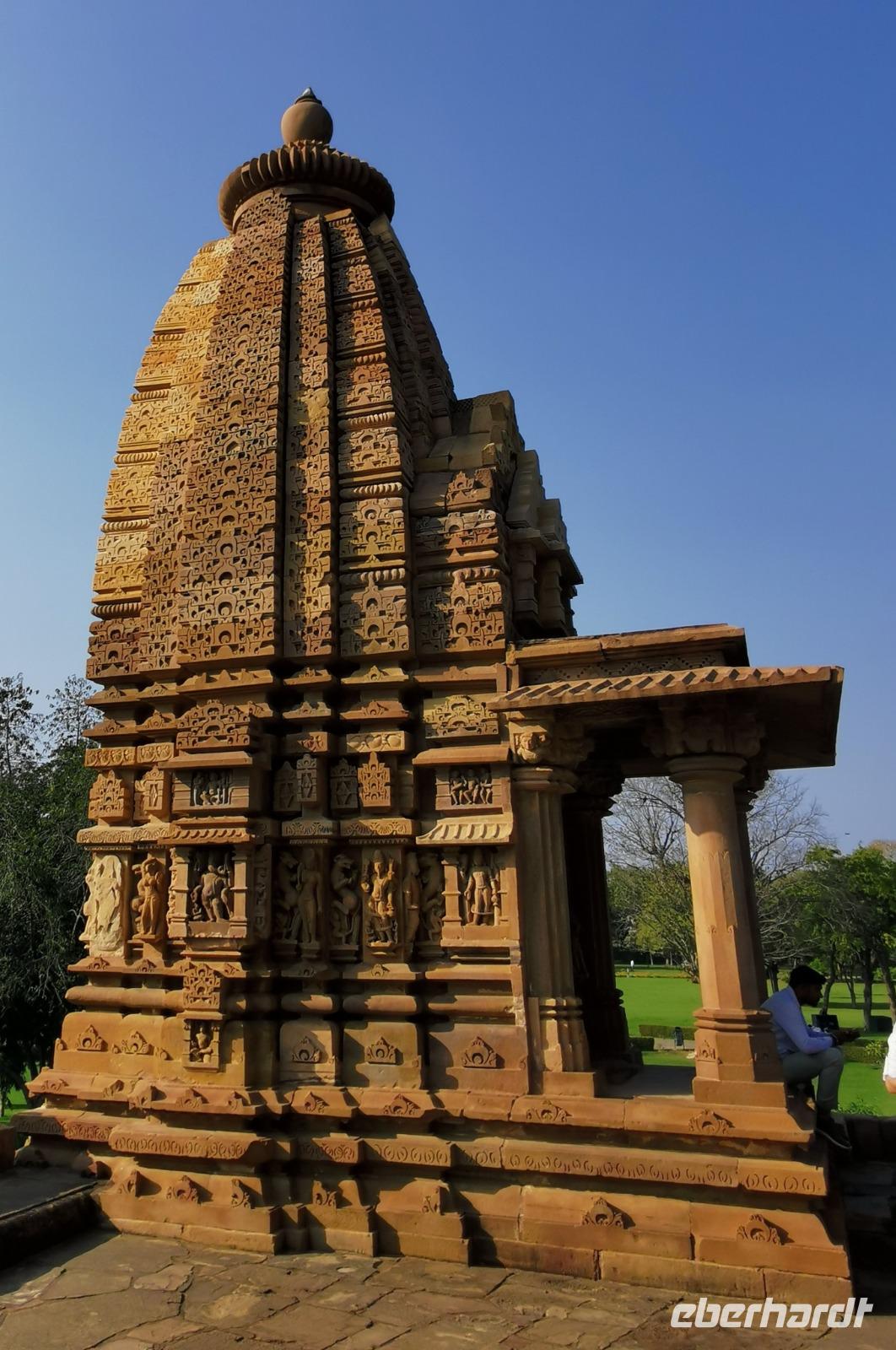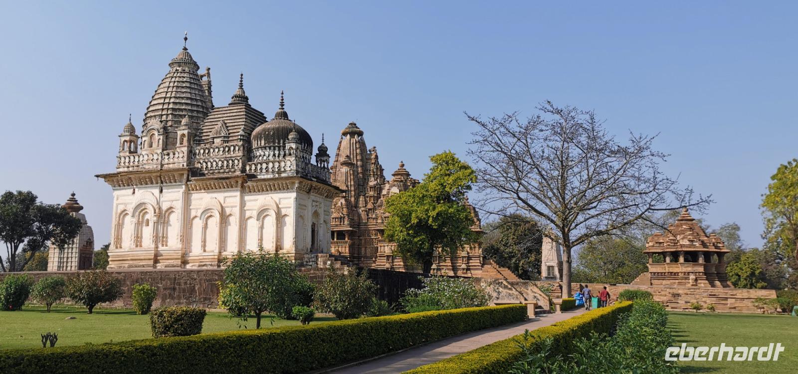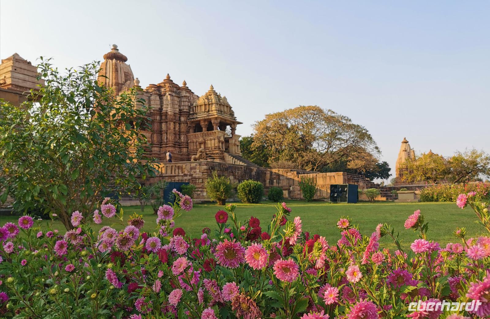 Unser Ziel ist der Besuch der Tempelanlage unweit unseres Hotels, die von den Herrschern der Chandella-Dynastie zwischen 950 und 1120 errichtet wurde. Die Anlage umfaßt eine Gruppe von etwa 20 Tempeln. Nach dem Niedergang der Dynastie, etwa im 12. Jahrhundert, blieben die Tempel nahezu ungenutzt und wurden im Laufe der Jahrhunderte von der Vegetation überwuchert. Da die Anlage jenseits aller politisch, militärisch und wirtschaftlich wichtigen Routen lag, blieb sie auch in der Zeit der islamischen Eroberungen unbeachtet und wurde von Zerstörungen verschont. Erst im 19. Jahrhundert waren es die Engländer, die diese Tempel mitten im Grün des Busches wieder entdeckten und mit Beginn des 20. Jahrhunderts begann man mit den umfangreichen Restaurierungsarbeiten. Heute zählt die Anlage zum UNESCO Weltkulturerbe und es ist ein Genuß, nach dem geräuschüberfluteten Gewaltmarsch in Varanasi fast unbehelligt von Verkehr und Händlern durch das Gartenparadies mit den malerisch schönen und mit Skulpturen überzogenen Tempeln zu spazieren.