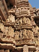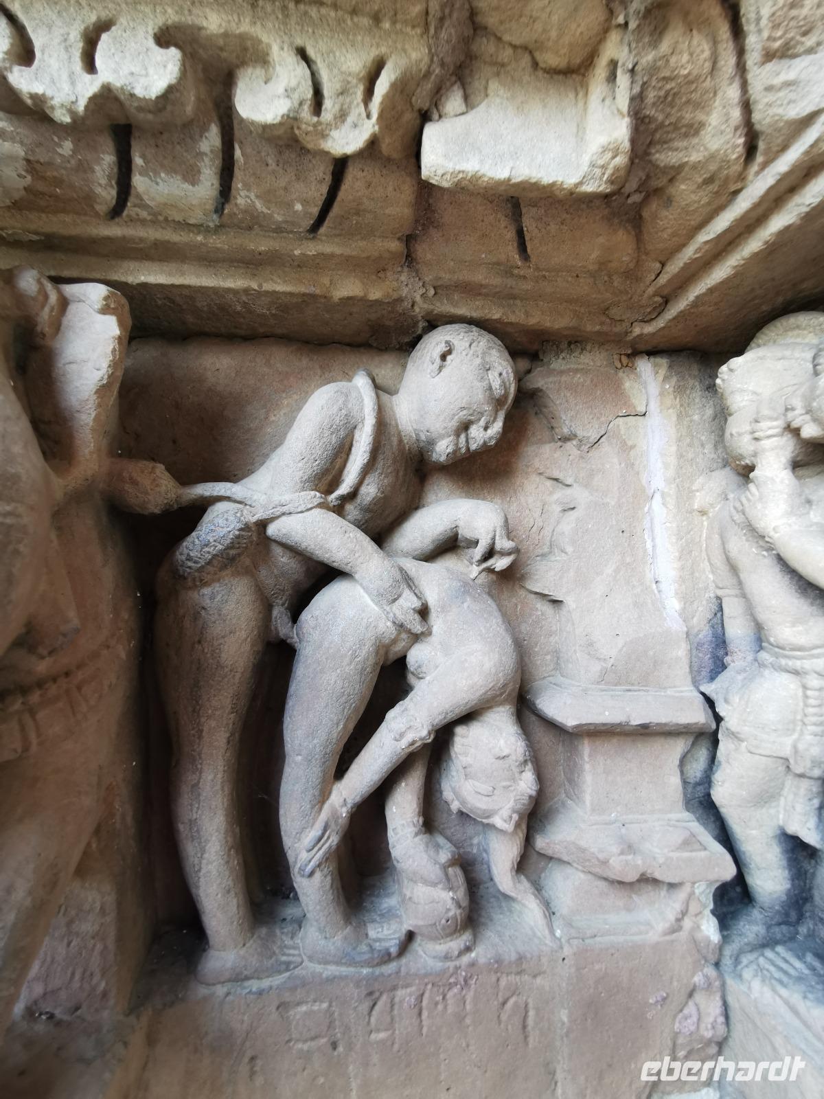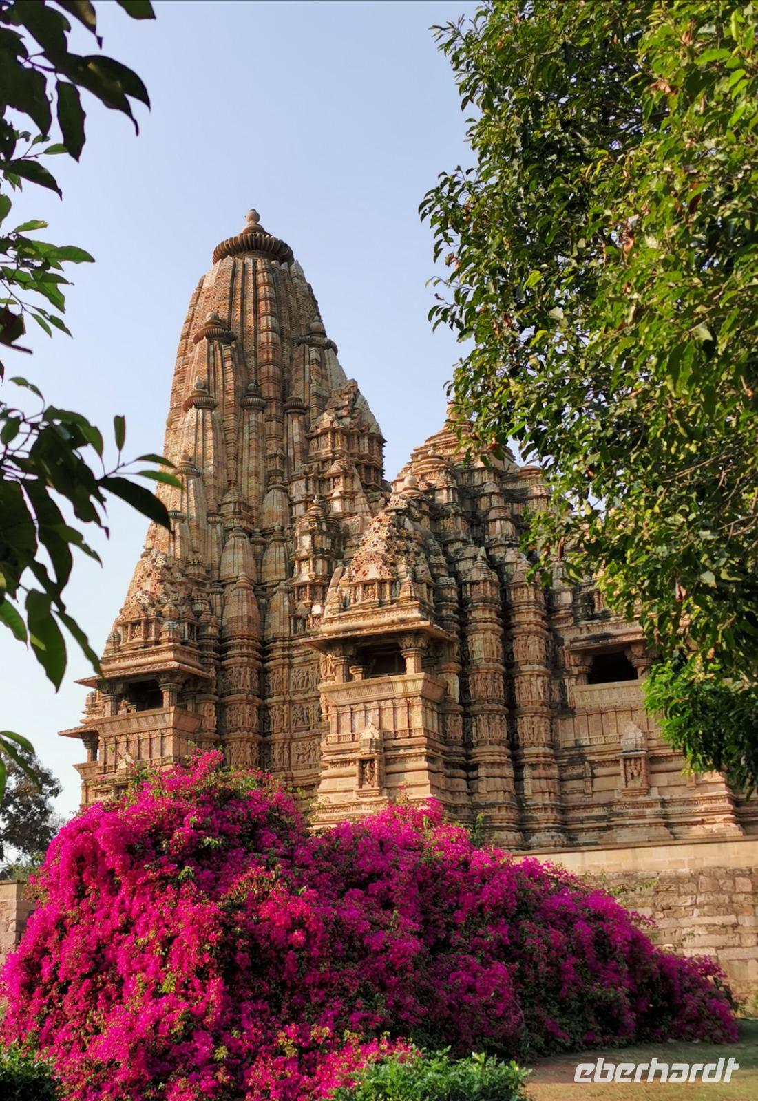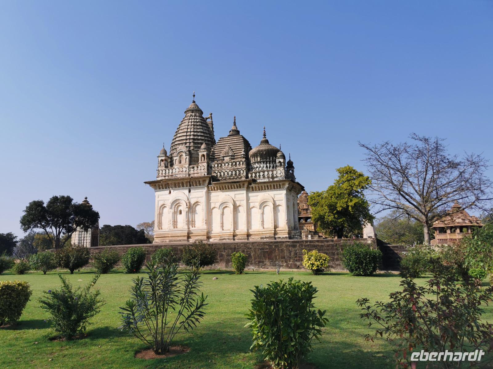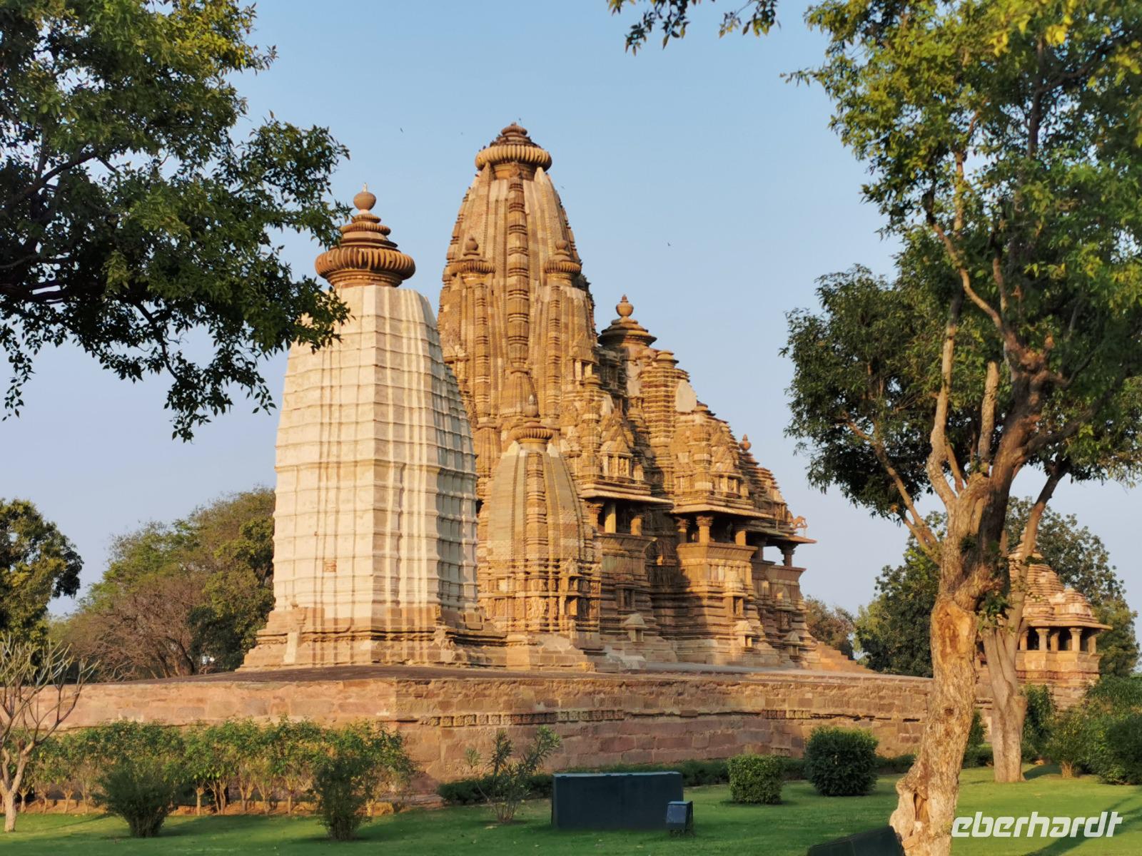 Unser Ziel ist der Besuch der Tempelanlage unweit unseres Hotels, die von den Herrschern der Chandella-Dynastie zwischen 950 und 1120 errichtet wurde. Die Anlage umfaßt eine Gruppe von etwa 20 Tempeln. Nach dem Niedergang der Dynastie, etwa im 12. Jahrhundert, blieben die Tempel nahezu ungenutzt und wurden im Laufe der Jahrhunderte von der Vegetation überwuchert. Da die Anlage jenseits aller politisch, militärisch und wirtschaftlich wichtigen Routen lag, blieb sie auch in der Zeit der islamischen Eroberungen unbeachtet und wurde von Zerstörungen verschont. Erst im 19. Jahrhundert waren es die Engländer, die diese Tempel mitten im Grün des Busches wieder entdeckten und mit Beginn des 20. Jahrhunderts begann man mit den umfangreichen Restaurierungsarbeiten. Heute zählt die Anlage zum UNESCO Weltkulturerbe und es ist ein Genuß, nach dem geräuschüberfluteten Gewaltmarsch in Varanasi fast unbehelligt von Verkehr und Händlern durch das Gartenparadies mit den malerisch schönen und mit Skulpturen überzogenen Tempeln zu spazieren.