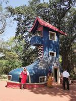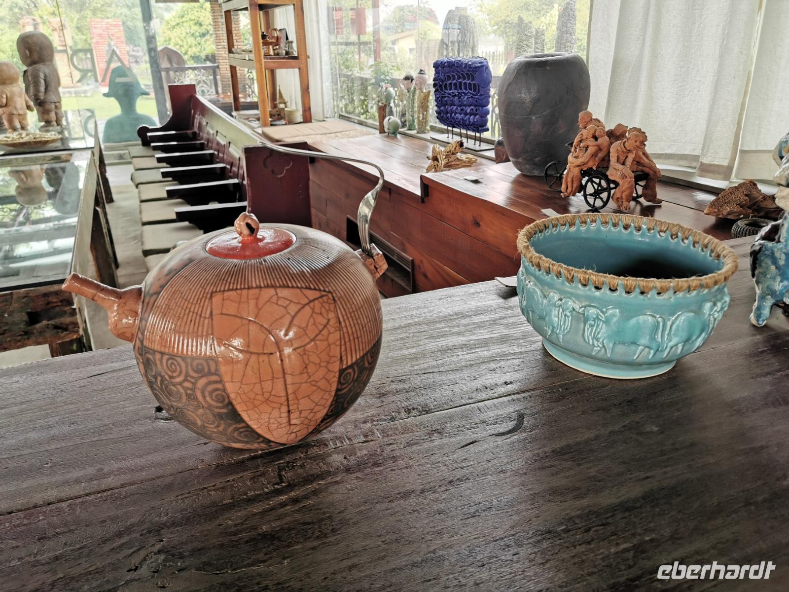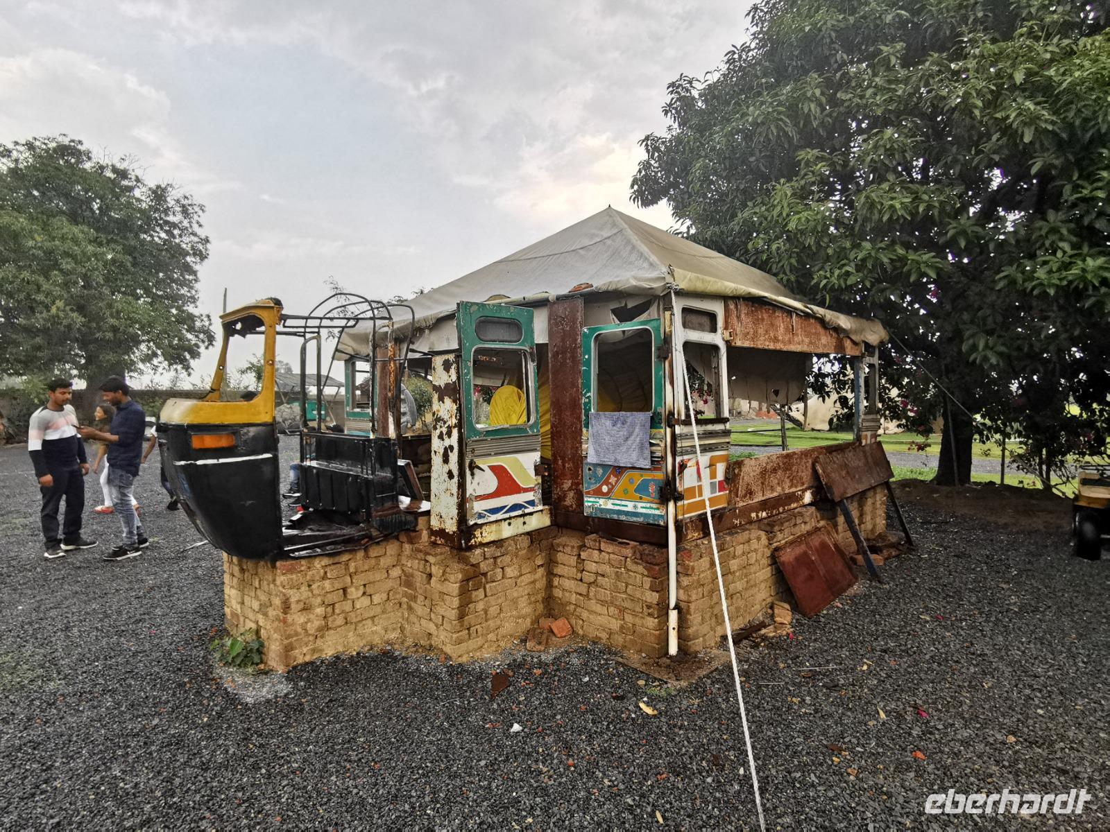 Bei einer Pause halten wir an einem Künstlercafé, wo alle Einrichtungsgegenstände aus alten Bahnhöfen stammen und durch upcycling stylisch zu einer faszinierenden Einrichtung umgestaltet wurden. Wir setzen uns vor ein traditionelles bäuerliches Lehmhaus, bewundern die Tische, die aus alten Eisenbahnrädern zusammengeschweißt wurden und trinken den berühmten Masalachai, einen Tee mit vielen Gewürzen. Ein Regenguß geht hernieder, wir genießen die Frische und fahren weiter.