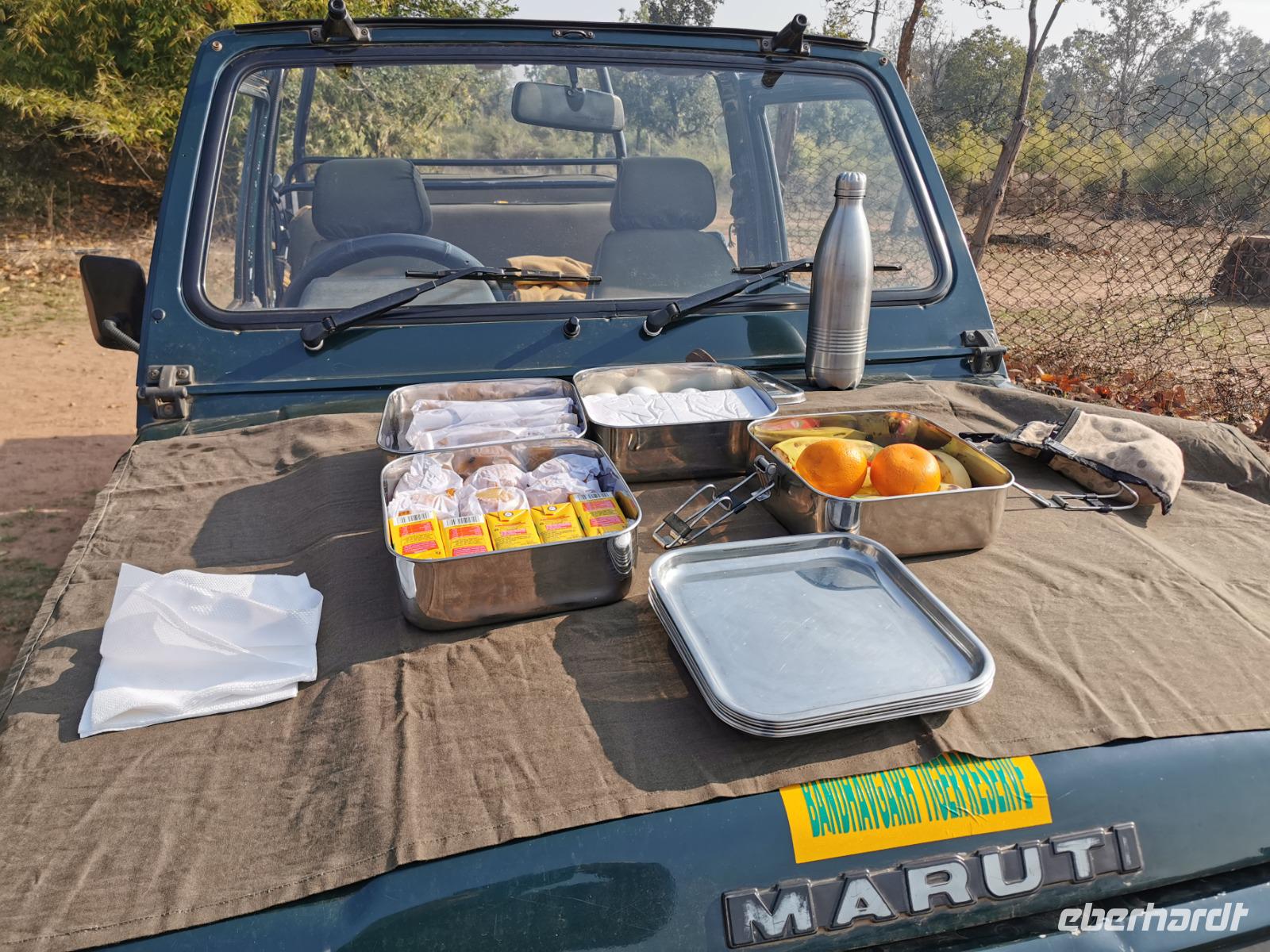 Unsere Frühstückspause auf der Motorhaube des Jeeps könnte uriger nicht sein. Am Mittag gehts zurück in unser gemütliches Camp und dort genießen wir einen freien Nachmittag in der üppig bewachsenen Anlage.