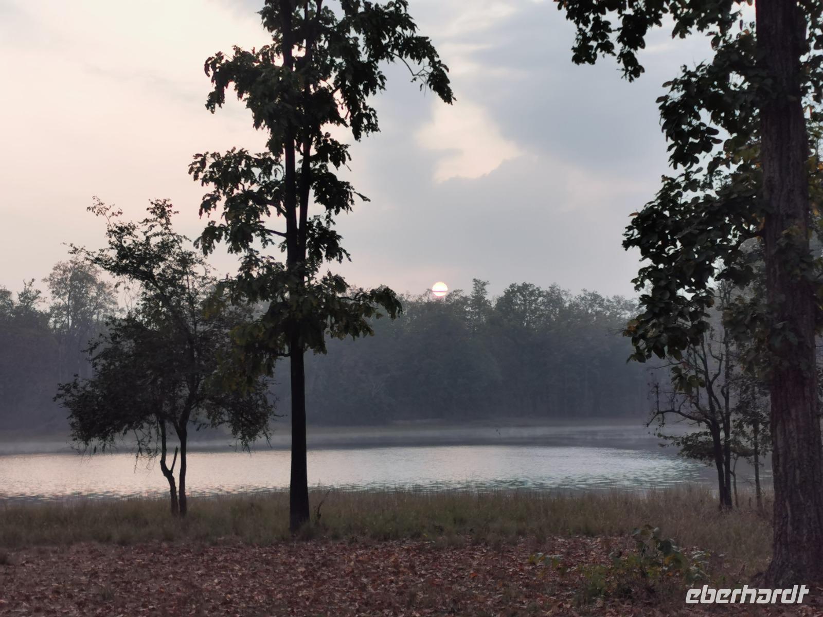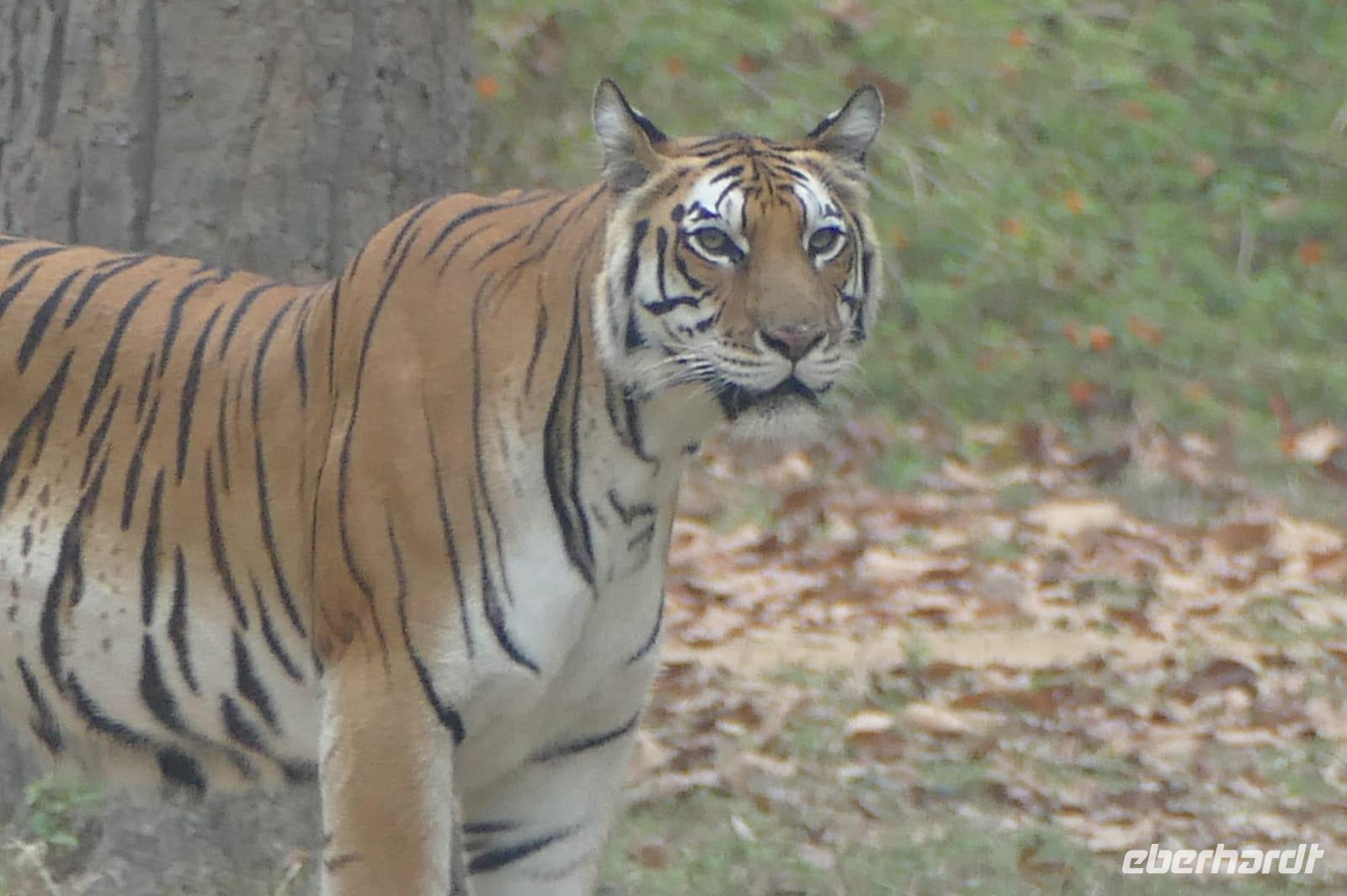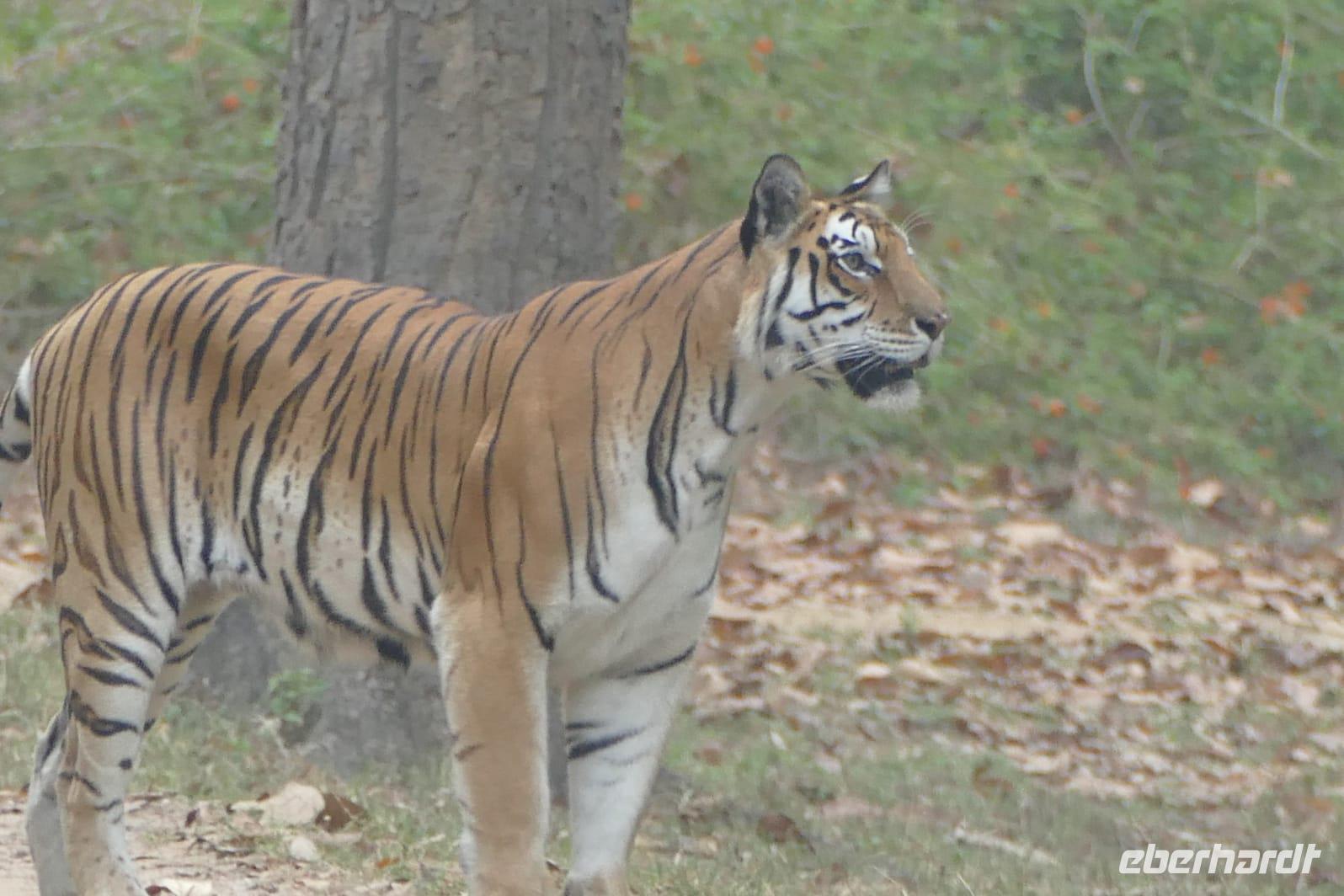 Dieser Park erinnert uns am meisten an die heimischen Wälder in Europa, am Morgen ziehen dicke Nebelschwaden über ausladende Wiesen, auf dem Boden liegt viel trockenes Laub, wie im Herbst in Deutschland. Wir genießen die Stille im Wald, die Spannung, wenn wieder ein Tiger naht und bleiben bis Mittag.