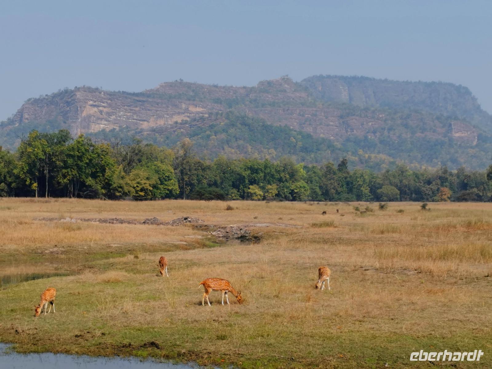 Wir erreichen am Abend unsere Lodge am Südende des Kanha Nationalparks und fühlen uns bereits beim letzten Wegstück wie in Kiplings Dschungelbuch versetzt. Keine Straßenbeleuchtung mehr weit und breit, im Wald sind die ersten Axishirsche in Licht unserer Scheinwerfer zu sehen, ein Gaur-Rind steht im Straßengraben, wir fahren auf unbefestigten Feldwegen und wollen gar nicht glauben, daß am Ende dieser Piste ins Nichts noch eine Lodge sein soll. Aber endlich ist Licht am Ende des Tunnels zu sehen, in der Lodge angekommen, serviert man uns sofort das Abendessen und schnell sind alle Gäste in ihren Hütten verschwunden, da es wieder vor dem Sonnenaufgang losgehen wird.