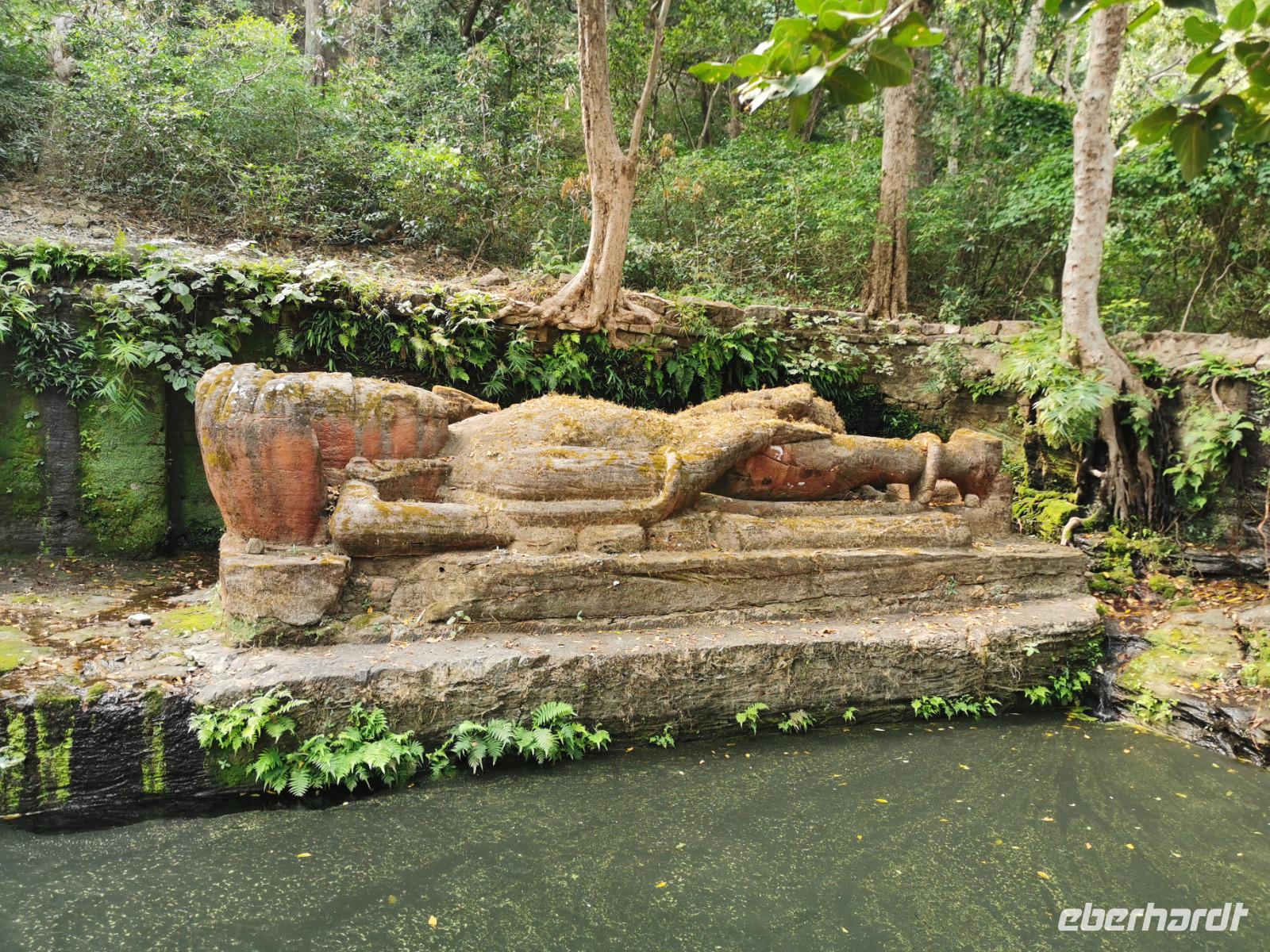 Beim Frühstück hatten wir einige Bananen übrig, die können wir jetzt gut gebrauchen, denn vor uns steht ein Parkwächter mit seinem Elefanten und der freut sich sehr, als er mit seinem Rüssel das Obst aus unseren Händen erhascht hat. Zum Abschluß dieser tollen Safari fahren wir hoch auf das Plateau, wo einst das Maharajafort stand, von dem heute nur noch Ruinen erhalten sind. Dort sehen wir mittem im Dschungel eine riesige liegende Vishnustatue aus dem 10. Jahrhundert. Ein magischer Moment für uns. Heute noch pilgern viele gläubige Hindus einmal im Jahr hier hinauf.