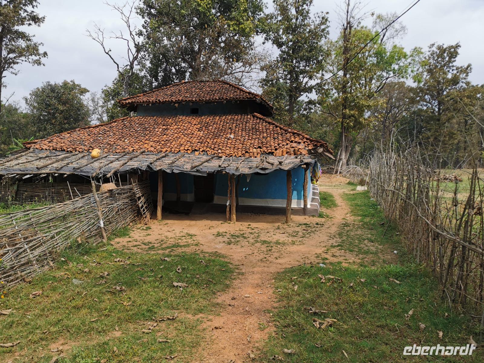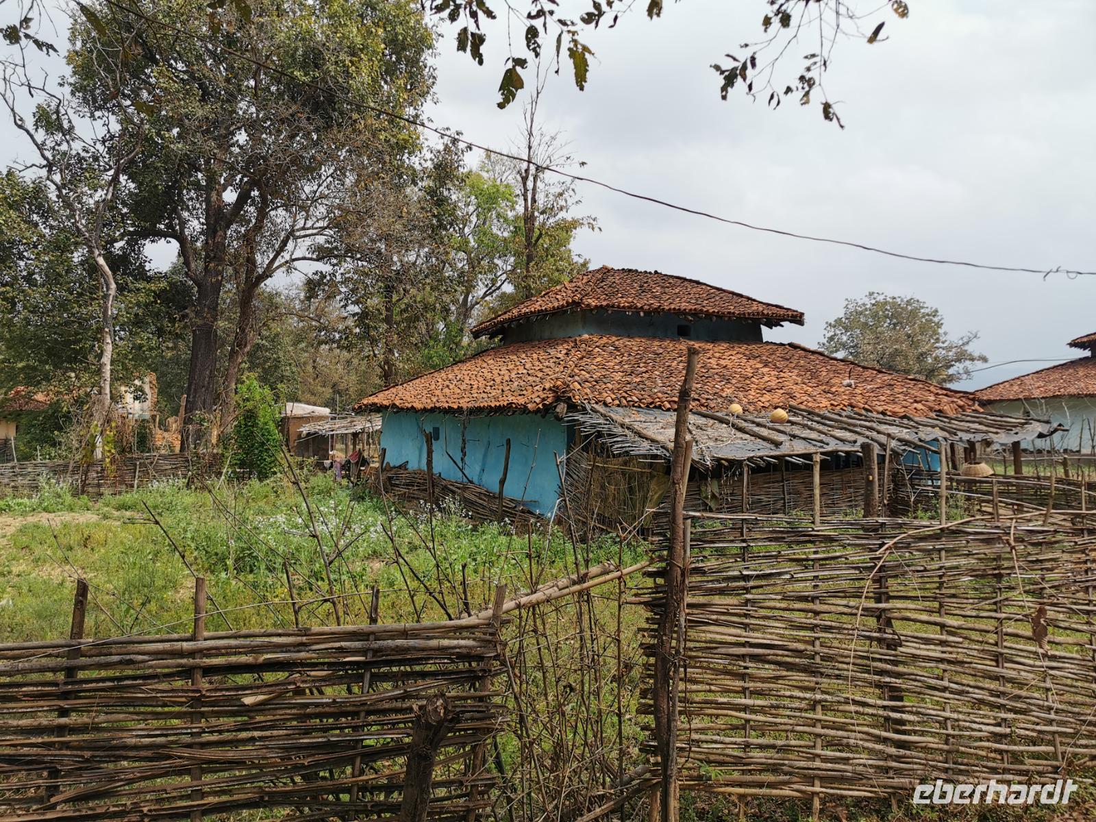Schon ist es Mittag geworden und nach einem Mahl in der wunderschönen Lodge gehts erneut weiter zum nächsten Nationalpark, diessmal nach Kanha. Die Strecke von etwa 280 km dauert bei indischen Straßenverhältnissen etwa sieben Stunden. Wir fahren an unzähligen Bauernhöfen und Reisfeldern vorbei. Viele der Häuser sind in leuchtendem Türkis gestrichen, das soll die Mücken abhalten. Madya Pradesch ist eines der ärmeren Bundesländer Indiens, es gibt wenig Industrie und kaum große Städte.