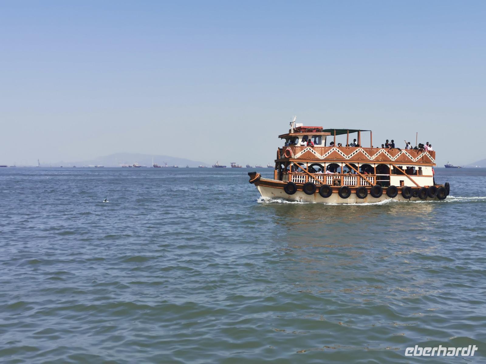 Unser offizielles Programm ist damit zu Ende, die Gäste wünschen sich aber einen gebührenden Abschluß bei einer Bootsfahrt vom Gateway of India vorbei an der Hafenkulisse Bombays und Simone spendiert eine gemeinsame Bootsfahrt. Auf dem Holzboot werden uns erst die riesigen Ausmaße der Stadt klar, wir sehen die Militärmarine, dahinter den Kreuzfahrthafen und werfen einen letzten Blick auf das Gateway of India vom Wasser aus.