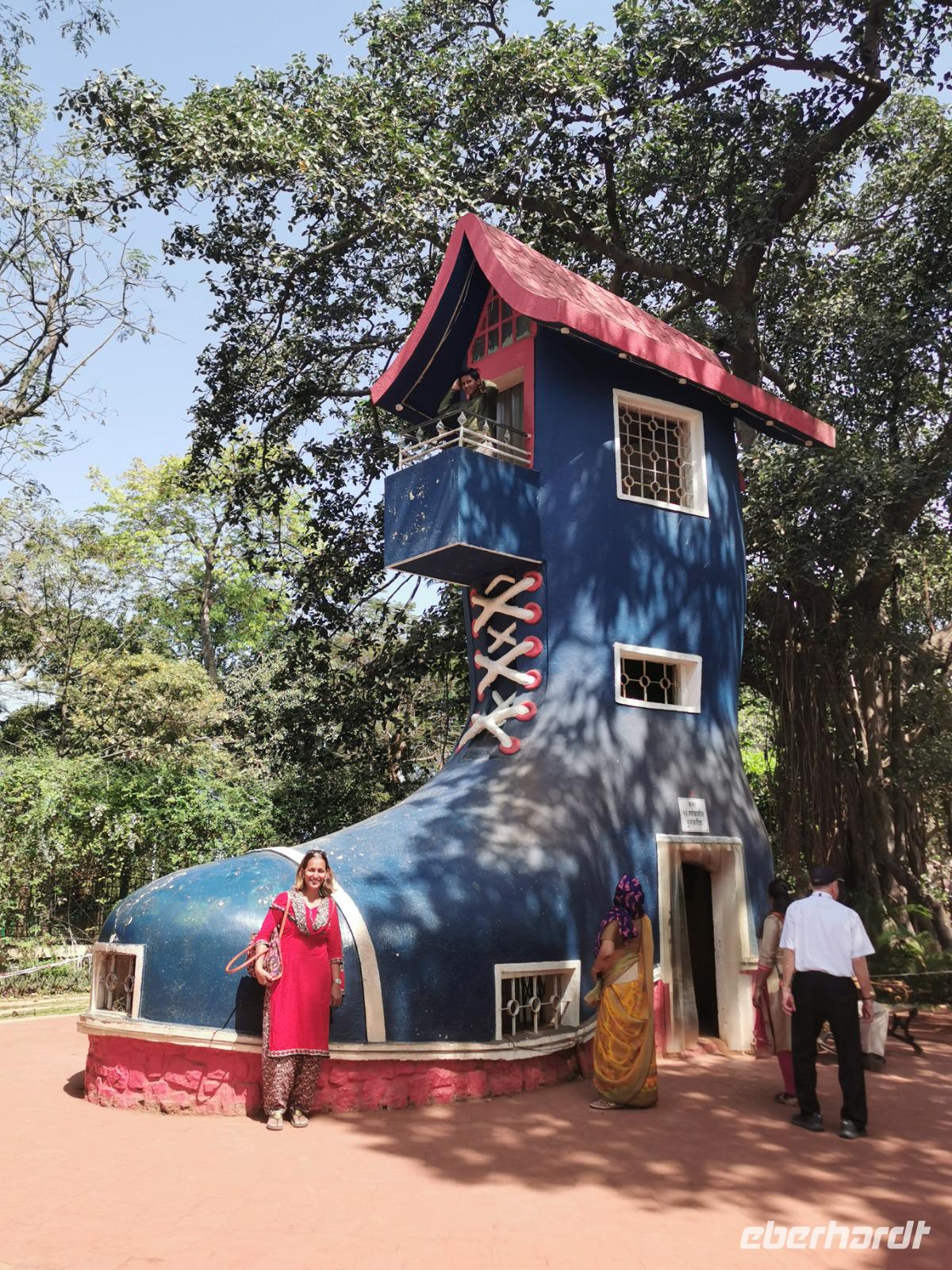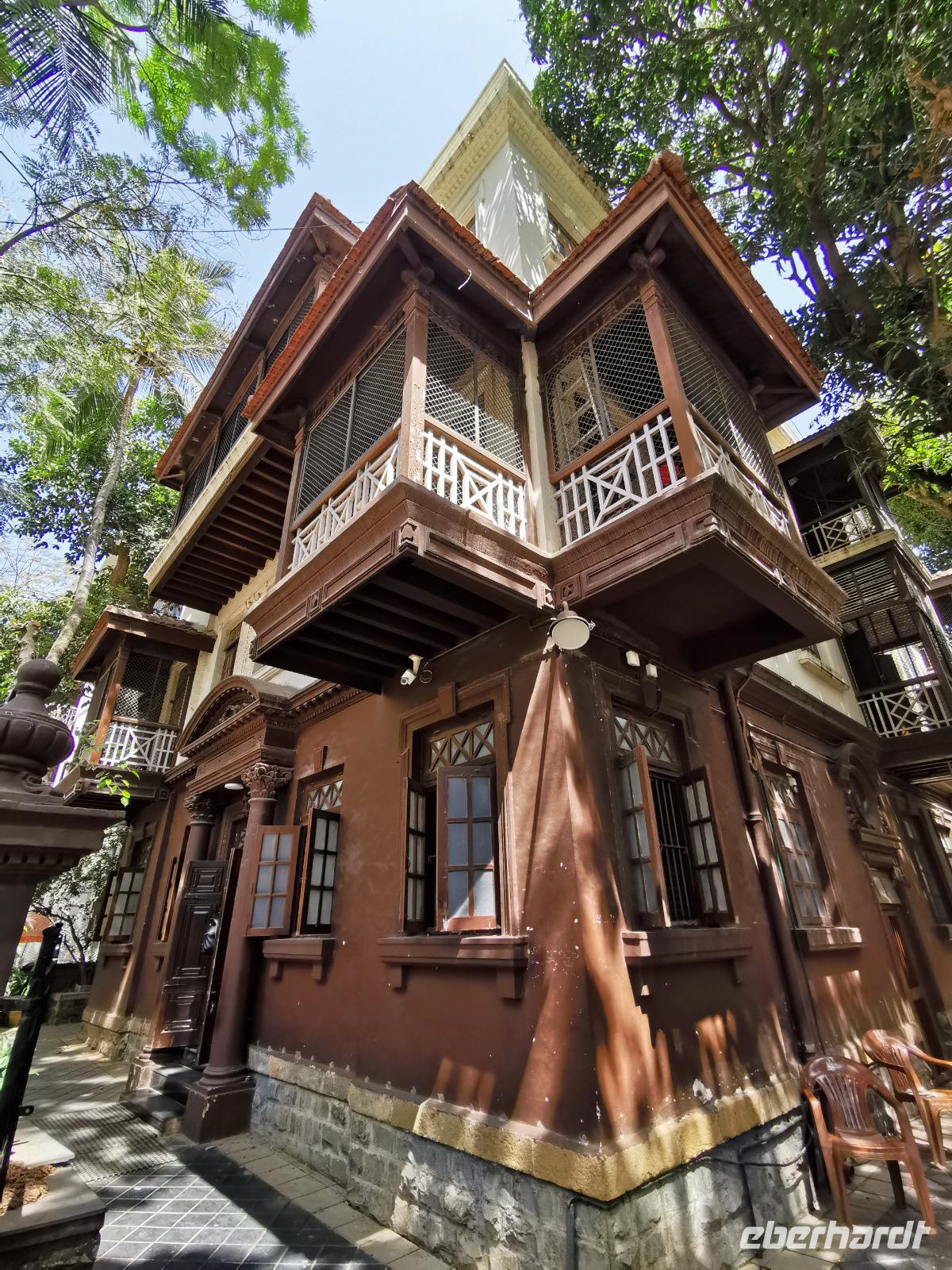 Danach bummeln wir durch zwei der herrlichen Gartenanlagen der Stadt, hier blüht der Frangipani, Mangobäume setzen gerade die ersten kleinen grünen Mangos an, die im Mai reif sein werden und ein Jackfruitbaum hat schon etliche melonengroße stachelige Früchte. Der laue Wind bläst uns um die Ohren und nach einem Spaziergang in den Anlagen fahren wir zu unserem letzten Besichtigungspunkt: dem Mani Bhavan.
