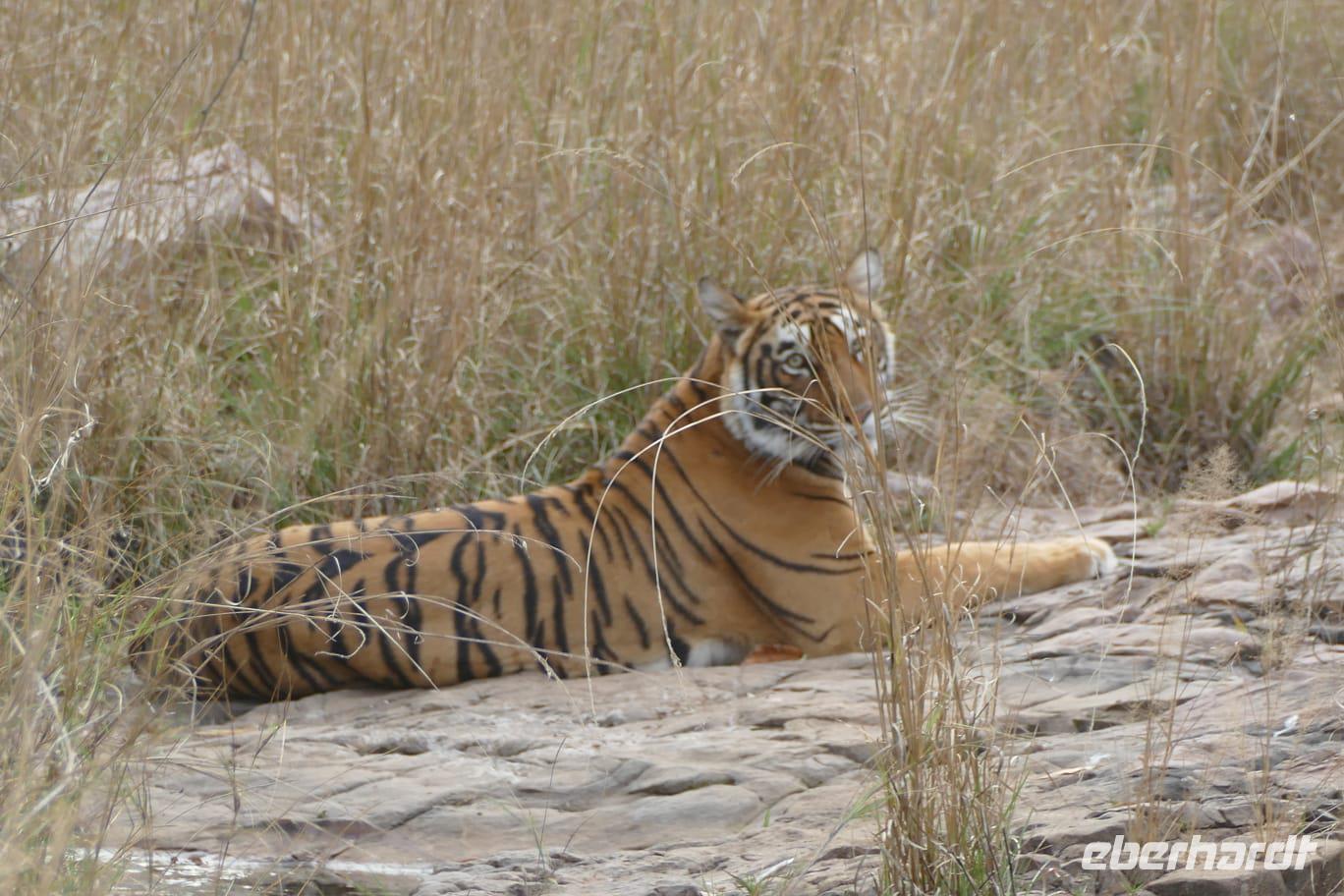 Zwei Schakale laufen durchs Unterholz und schon ist es so weit: EIN TIGER. Um genauer zu sein: EINE TIGERDAME. Sie läuft am Flußbett entlang und läßt sich durch uns überhaupt nicht stören. Sie legt sich auf einen Stein und wir haben den Traumblick auf dieses majestätische Tier. Alle Gäste sind hellauf begeistert.