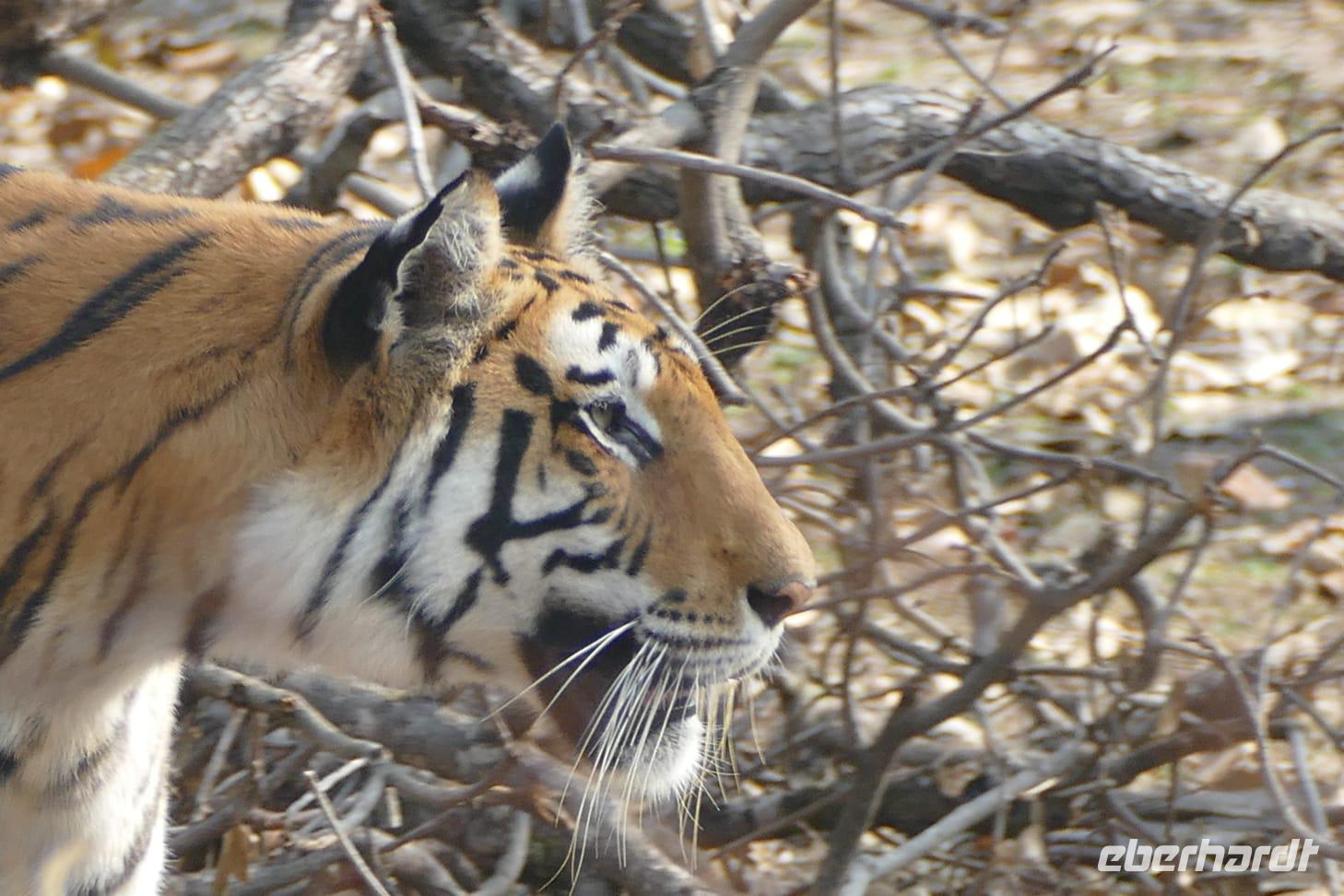 Wieder geht es vor dem Sonnenaufgang los mit einer wilden Fahrt durch den Park und wir haben erneut Glück. Eine Weile dauert es, zuerst hört man nur die Warnrufe der Affen und Sambarhirsche, die immer darauf hindeuten, daß ein Tiger nah und in Bewegung ist. Und nach etwa zwei Stunden Fahrt kreuzt ein Weibchen direkt vor unserem Jeep den Weg und ist sehr gut zu beobachten und zu fotografieren.