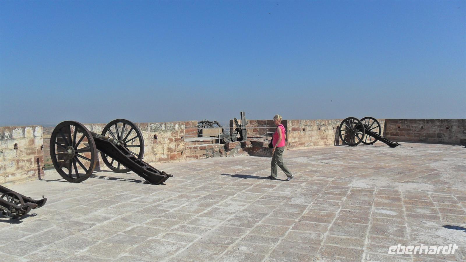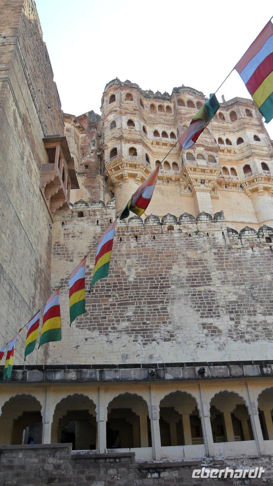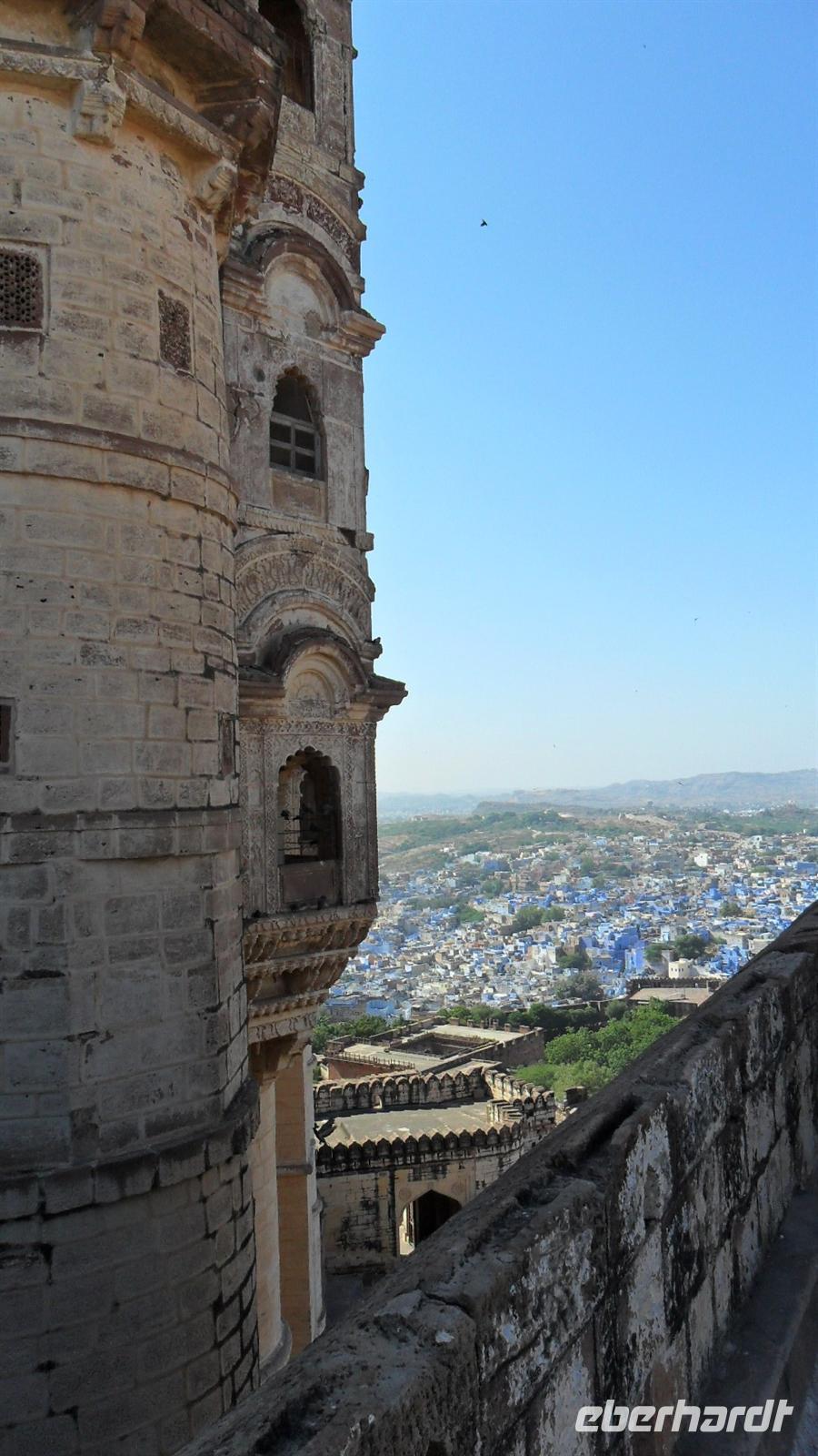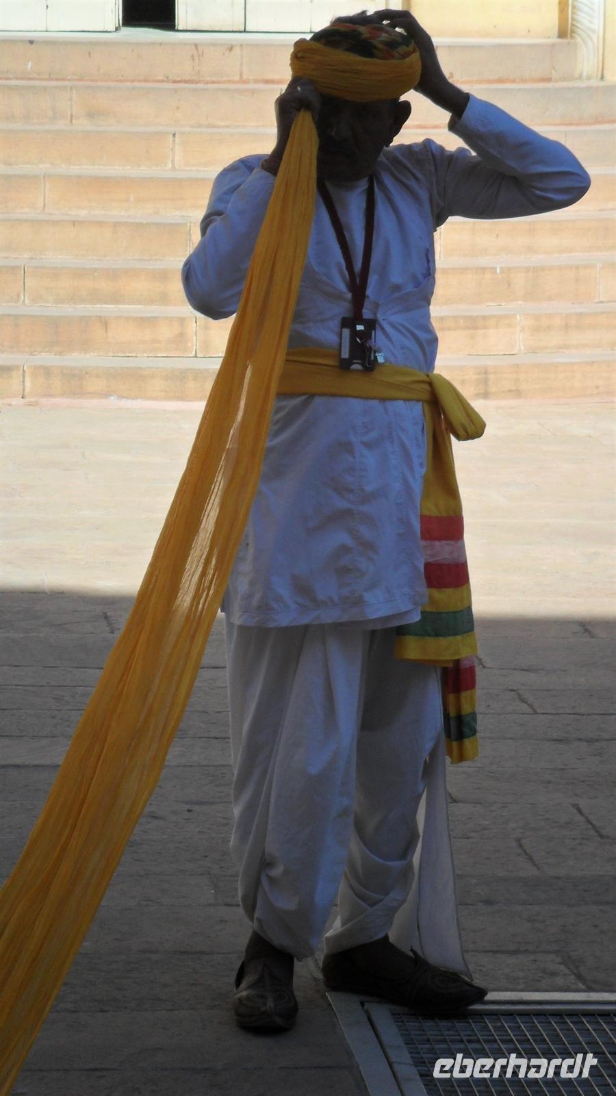 Hochinteressant war dann die Besichtigung von Residenzschloss und Felsenfeste - des nie eroberten wehrhaften Meherangarh Forts. Dem beschwerlichen Aufstieg konnten wir durch Nutzung des Aufzuges entgehen und in Ruhe den königlich ausgestatteten Palast; reich verziert und mit tollen Aussichtspunkten auf die „blaue“ Stadt besichtigen. Ganz nebenbei konnten wir sehen und fotografieren, wie ein Turban gewickelt wird, denn eine der Palastwachen führte solches gegen ein Trinkgeld vor. Acht bis neun Meter ist die Stoffbahn lang, die sich der Turbanträger gekonnt und mit großer Übung nach altbewährter Tradition um den Kopf legt.