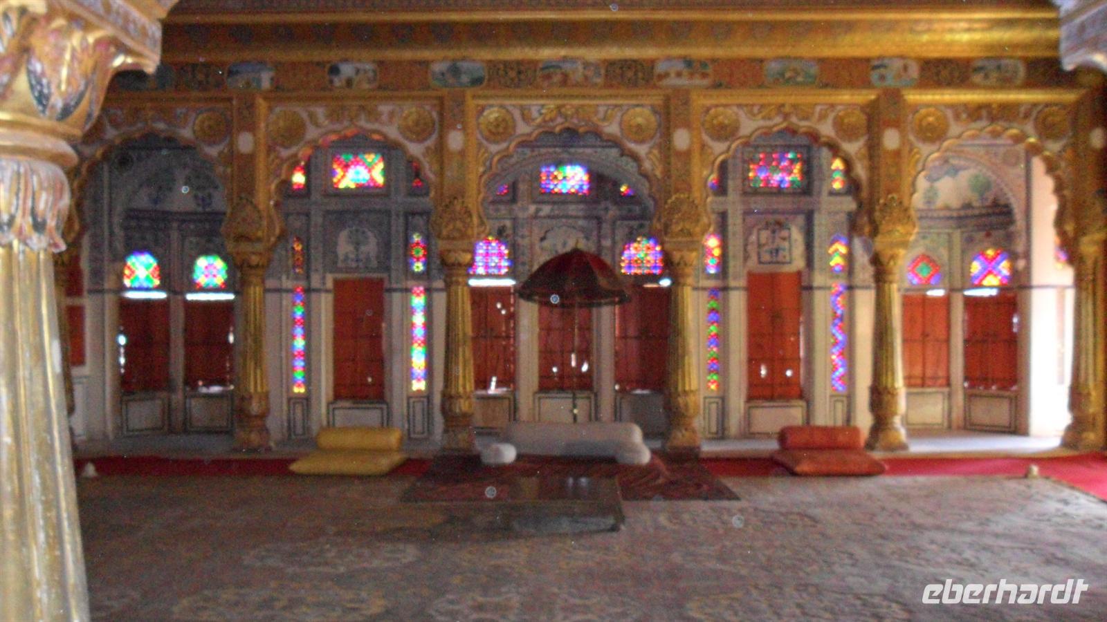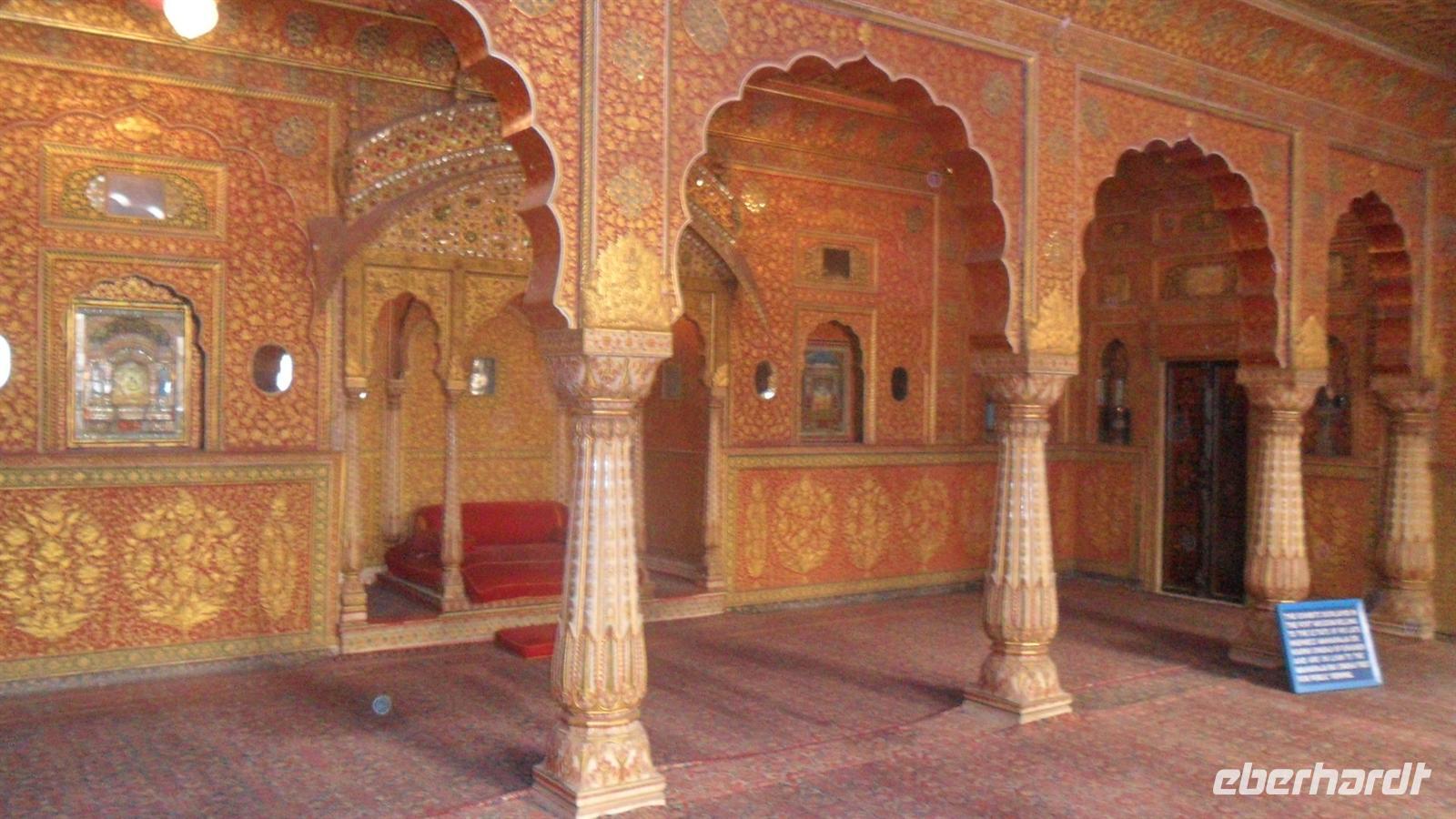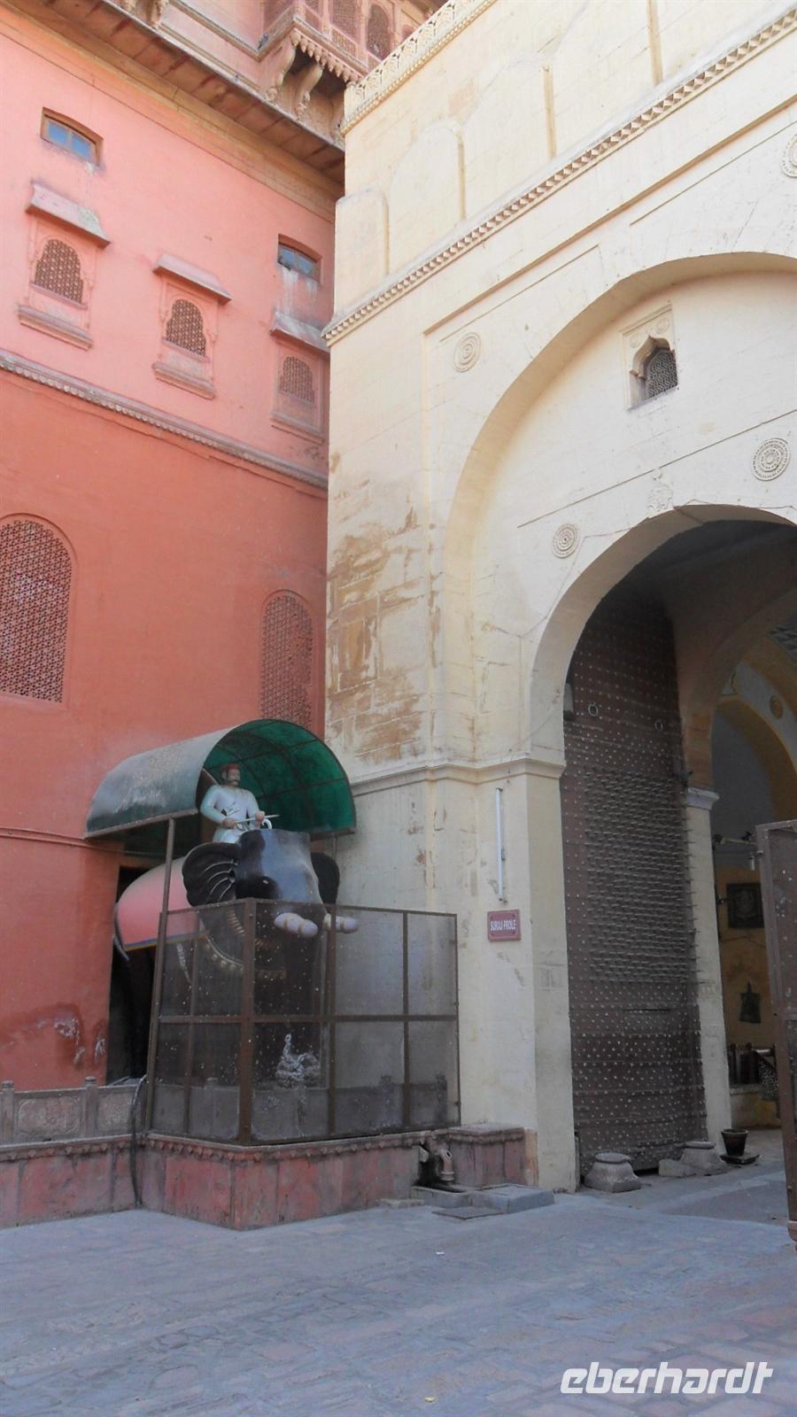 Am elften Reisetag, einem überwiegenden Bus-Fahr-Tag, mussten wir wieder einige Kilometer hinter uns bringen, denn die Strecke nach Bikaner hat es in sich. Dennoch waren wir recht früh in der alten Wüstenhauptstadt. Nach dem Mittagessen begann die Besichtigung des Stadtpalastes Junargarh Fort. Mehrere herrliche Palasträume, hübsche Innenhöfe, verzierte Brunnen und interessante Sammlungen beherbergt das gewaltige Stadtschloß, das an Größe und Pracht dem von Udaipur kaum nachsteht.