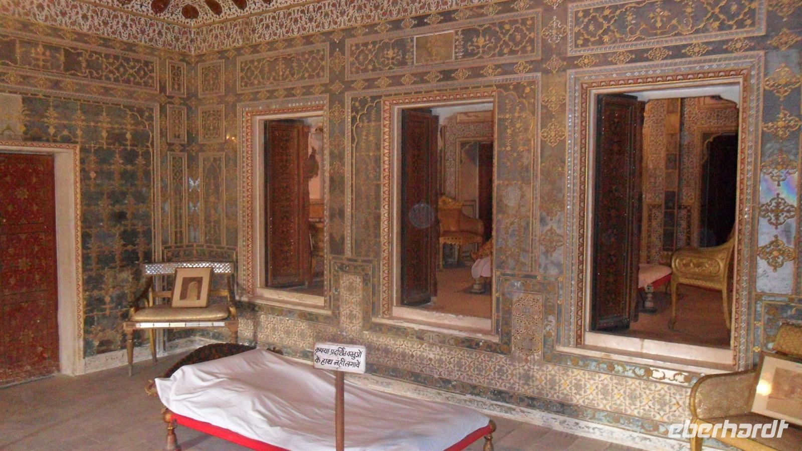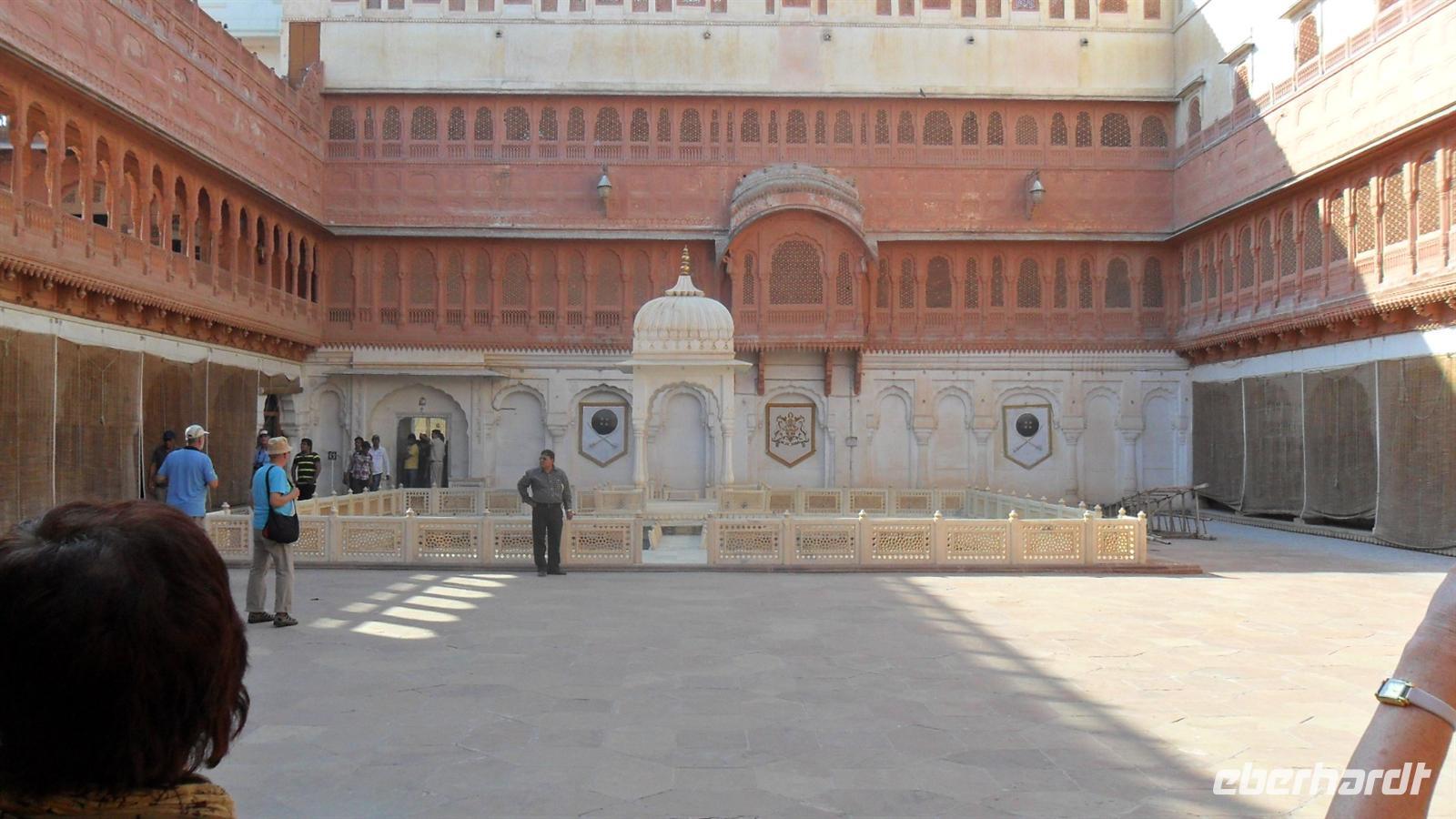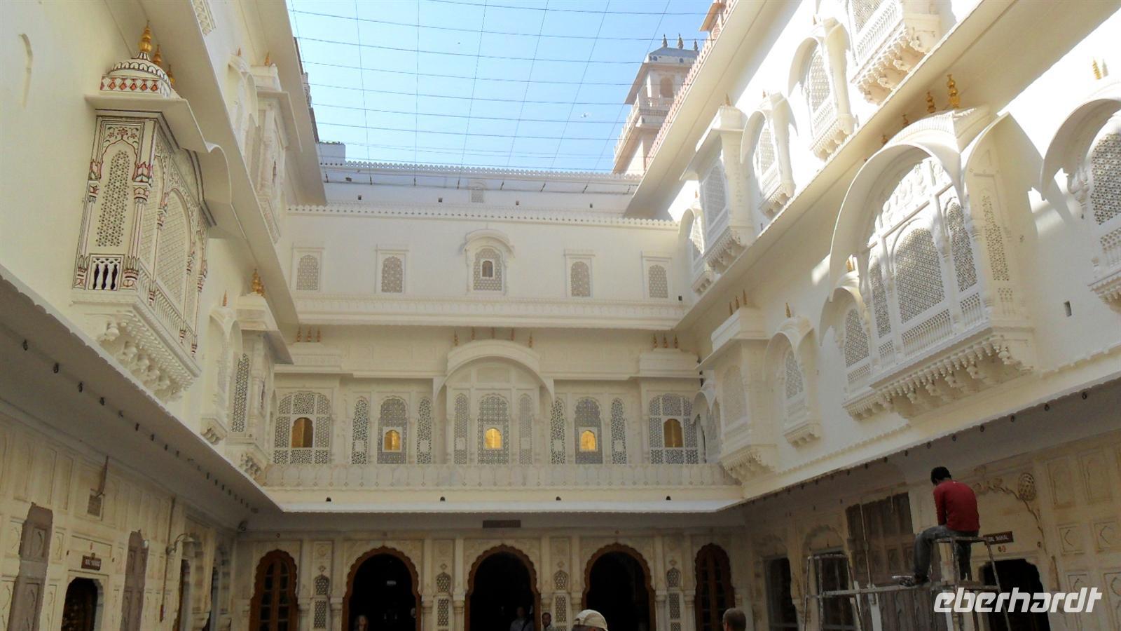 Am elften Reisetag, einem überwiegenden Bus-Fahr-Tag, mussten wir wieder einige Kilometer hinter uns bringen, denn die Strecke nach Bikaner hat es in sich. Dennoch waren wir recht früh in der alten Wüstenhauptstadt. Nach dem Mittagessen begann die Besichtigung des Stadtpalastes Junargarh Fort. Mehrere herrliche Palasträume, hübsche Innenhöfe, verzierte Brunnen und interessante Sammlungen beherbergt das gewaltige Stadtschloß, das an Größe und Pracht dem von Udaipur kaum nachsteht.