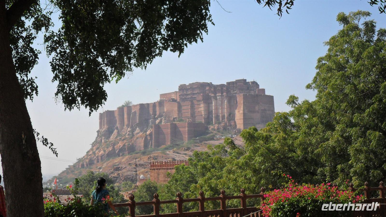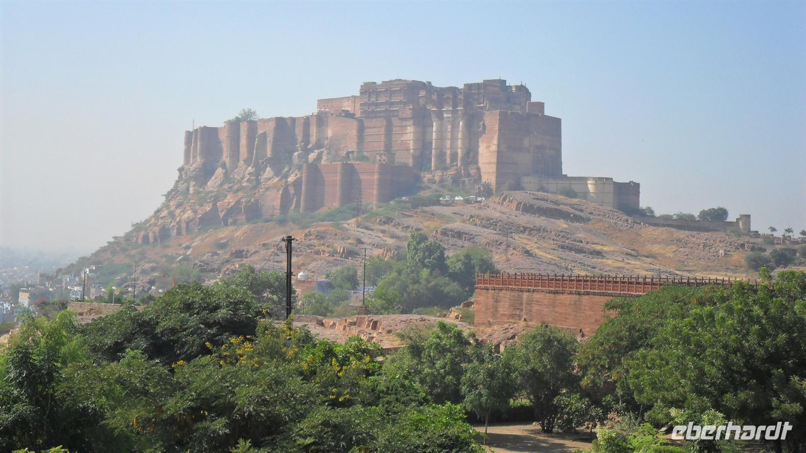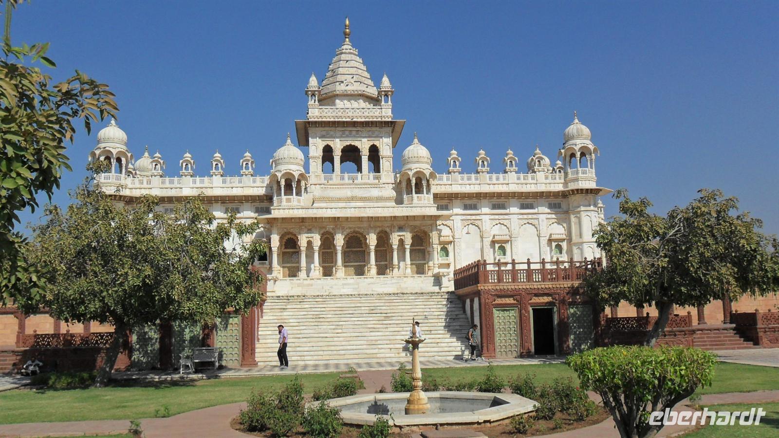 Der achte Reisetag führte in recht kurzer Fahrt nach Jodhpur, einer weiteren Hauptstadt des „Königsstaates“ Rajasthan. In der alten Hauptstadt des einstigen Königreiches Marwar besuchten wir zunächst das wundervolle Marmorgrabmal Jaswant Thada, in dem ein hochverehrter Maharadschah aus dem vorigen Jahrhundert begraben liegt. Auf seine Art gestaltet, aus weißem Marmor errichtet und auch als Grabmal zur Verehrung konzipiert, stellt es eine Art „Gegenstück“ zum Taj Mahal dar, denn auch wenn sein Erscheinungsbild gänzlich anders ist, sind doch die Grundgedanken von Liebe und Verehrung entscheidend.