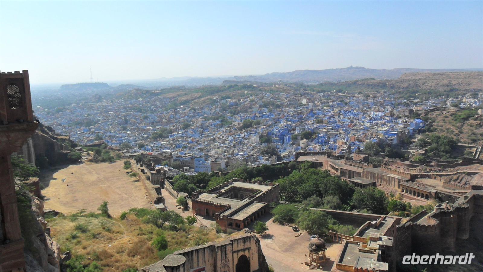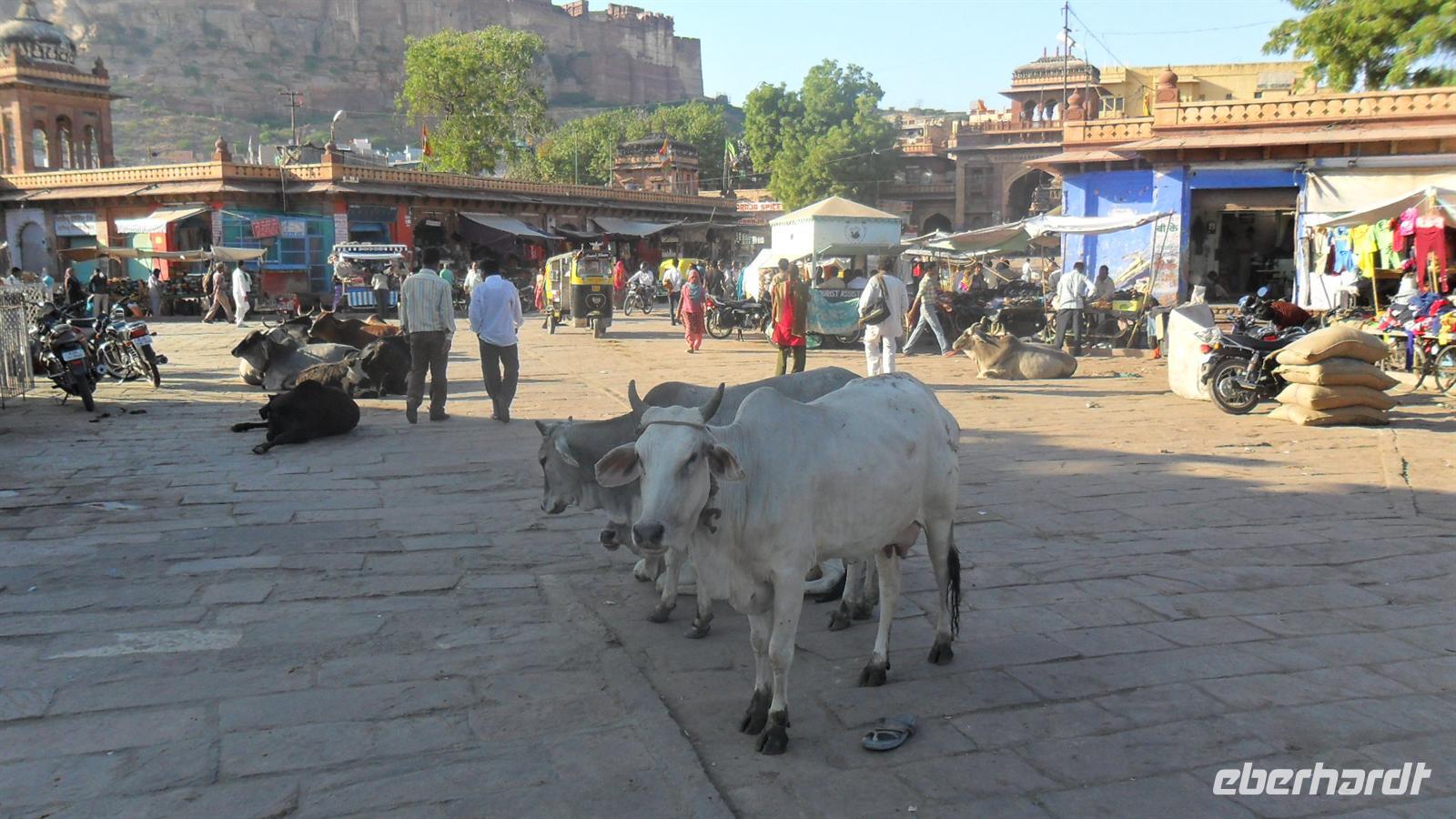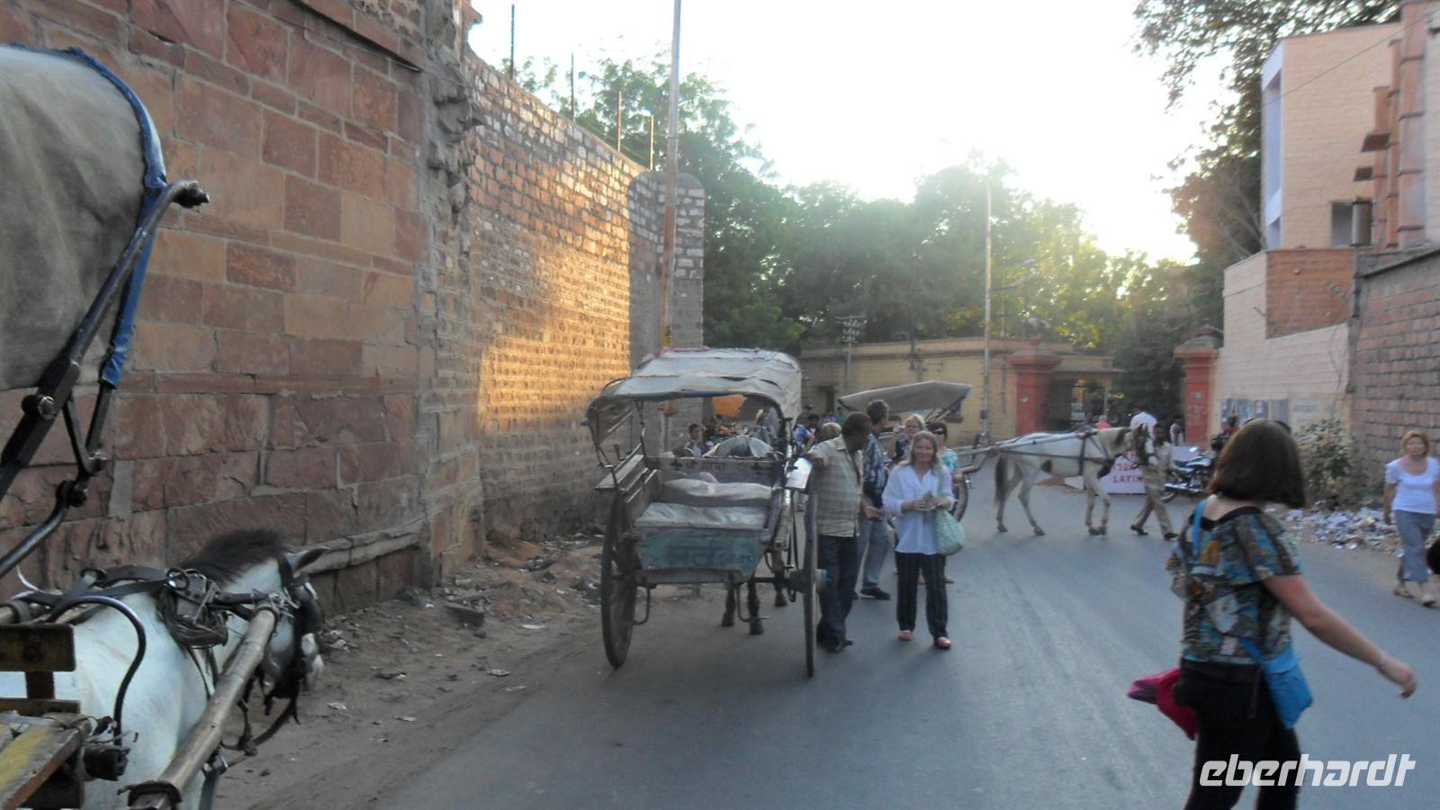 Der achte Reisetag führte in recht kurzer Fahrt nach Jodhpur, einer weiteren Hauptstadt des „Königsstaates“ Rajasthan. In der alten Hauptstadt des einstigen Königreiches Marwar besuchten wir zunächst das wundervolle Marmorgrabmal Jaswant Thada, in dem ein hochverehrter Maharadschah aus dem vorigen Jahrhundert begraben liegt. Auf seine Art gestaltet, aus weißem Marmor errichtet und auch als Grabmal zur Verehrung konzipiert, stellt es eine Art „Gegenstück“ zum Taj Mahal dar, denn auch wenn sein Erscheinungsbild gänzlich anders ist, sind doch die Grundgedanken von Liebe und Verehrung entscheidend.