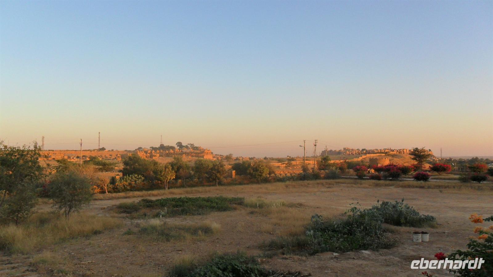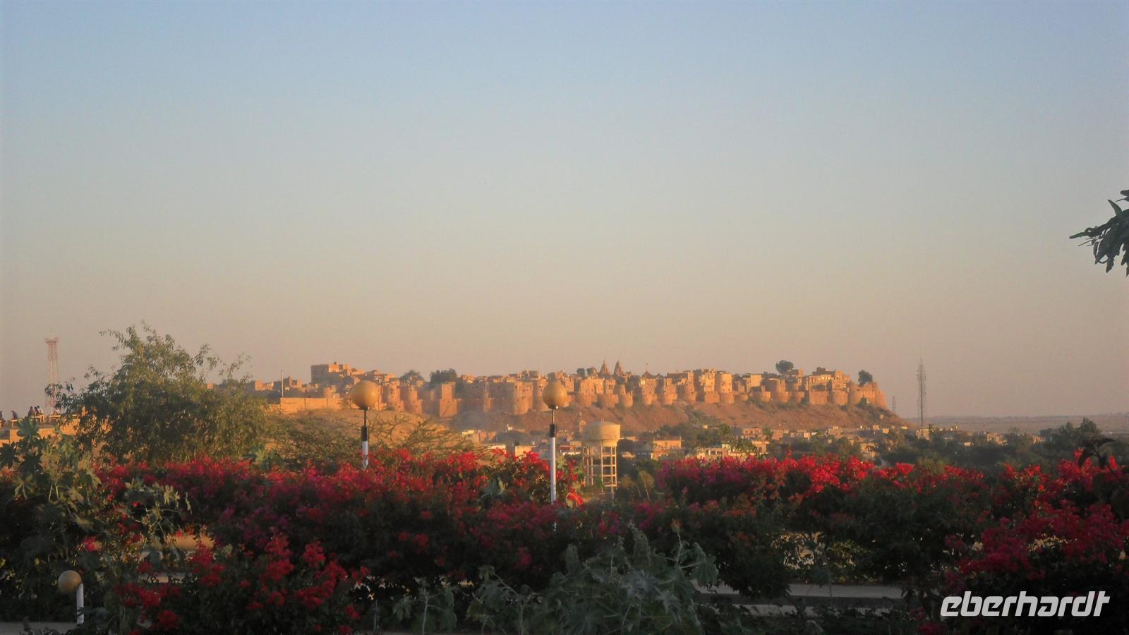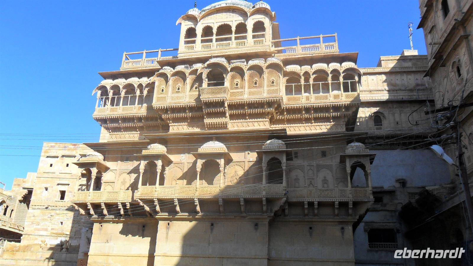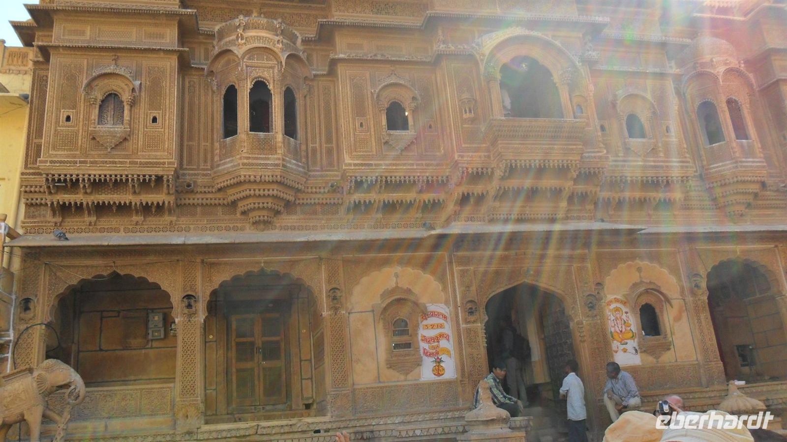 Ein weiteres Heiligtum - ein Jain-Tempel mit zahlreichen Hakenkreuzen als Verzierungen - (die Swastika ist in Indien ein oft verwendetes Fruchtbarkeitssymbol und hat ideell überhaupt nichts mit dem von Hitlers Nazis mißbrauchtem Symbol zu tun) gehörte auch zum Besichtigungsprogramm in Osyan. Abends erreichten wir dann, nach längerer Fahrt, die fantastische alte Wüstenfestung Jaisalmer. Traditionell wohnen unsere Gäste hier im schön gelegenen Himmathgarh-Hotel, in burgähnlichen kleinen Bungalows um einen herrlichen Hof mit Pool und Blick zur nachts erleuchteten Festung und zum Sonnenuntergang.