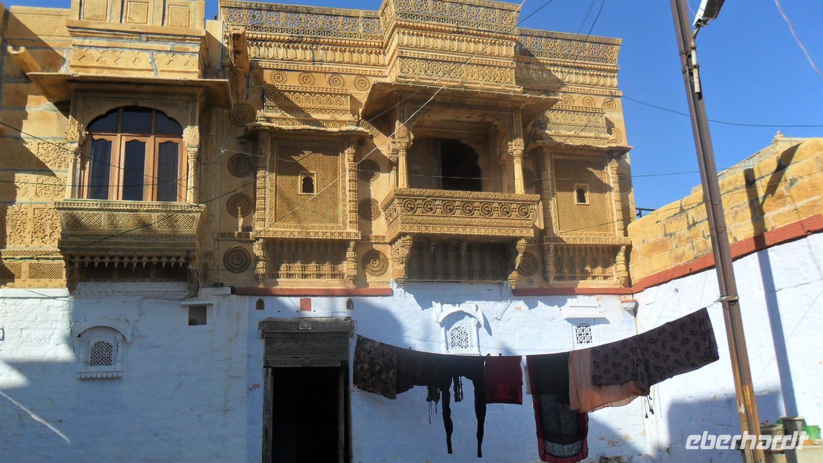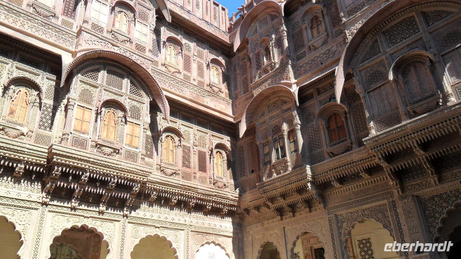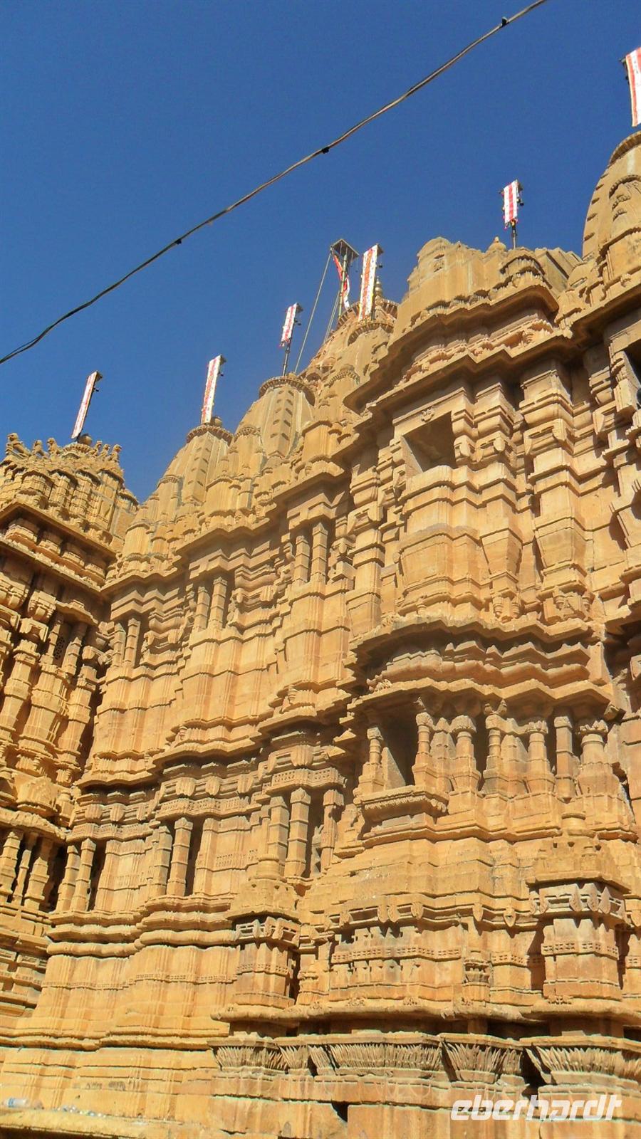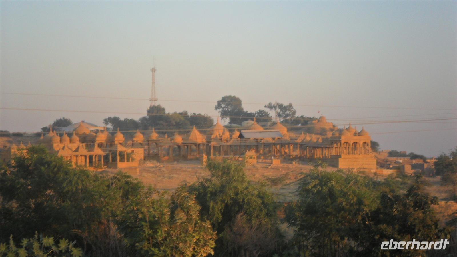 Ein weiteres Heiligtum - ein Jain-Tempel mit zahlreichen Hakenkreuzen als Verzierungen - (die Swastika ist in Indien ein oft verwendetes Fruchtbarkeitssymbol und hat ideell überhaupt nichts mit dem von Hitlers Nazis mißbrauchtem Symbol zu tun) gehörte auch zum Besichtigungsprogramm in Osyan. Abends erreichten wir dann, nach längerer Fahrt, die fantastische alte Wüstenfestung Jaisalmer. Traditionell wohnen unsere Gäste hier im schön gelegenen Himmathgarh-Hotel, in burgähnlichen kleinen Bungalows um einen herrlichen Hof mit Pool und Blick zur nachts erleuchteten Festung und zum Sonnenuntergang.