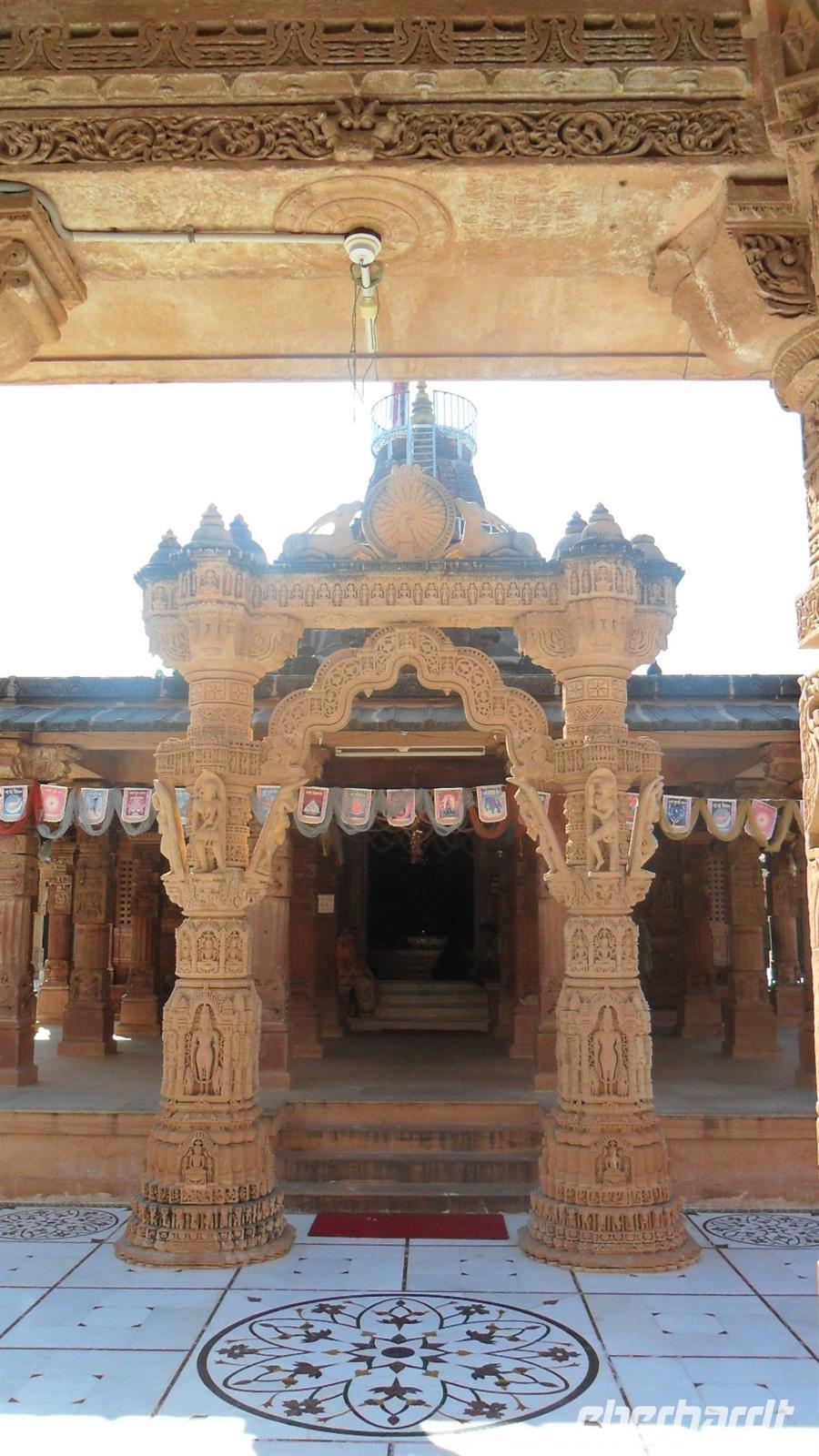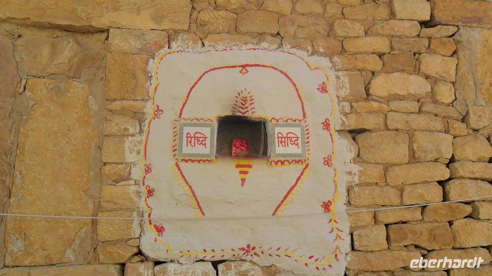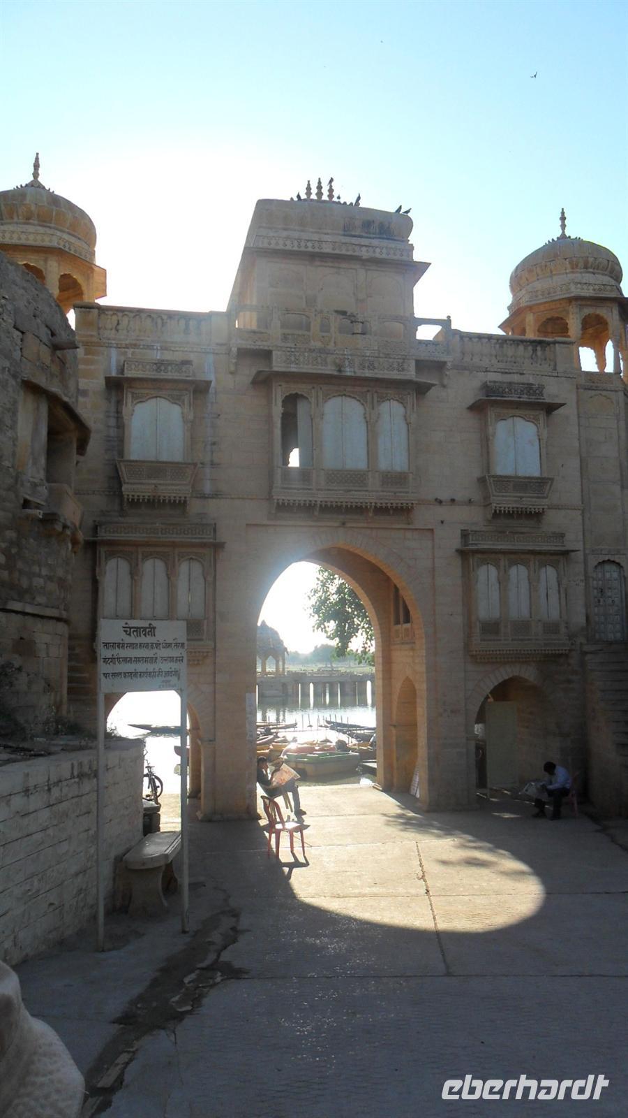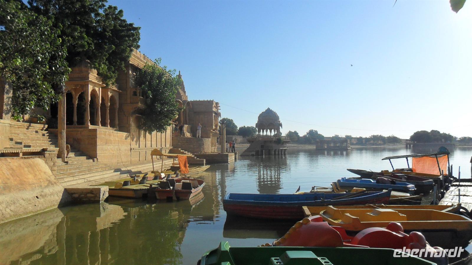 Ein weiteres Heiligtum - ein Jain-Tempel mit zahlreichen Hakenkreuzen als Verzierungen - (die Swastika ist in Indien ein oft verwendetes Fruchtbarkeitssymbol und hat ideell überhaupt nichts mit dem von Hitlers Nazis mißbrauchtem Symbol zu tun) gehörte auch zum Besichtigungsprogramm in Osyan. Abends erreichten wir dann, nach längerer Fahrt, die fantastische alte Wüstenfestung Jaisalmer. Traditionell wohnen unsere Gäste hier im schön gelegenen Himmathgarh-Hotel, in burgähnlichen kleinen Bungalows um einen herrlichen Hof mit Pool und Blick zur nachts erleuchteten Festung und zum Sonnenuntergang.