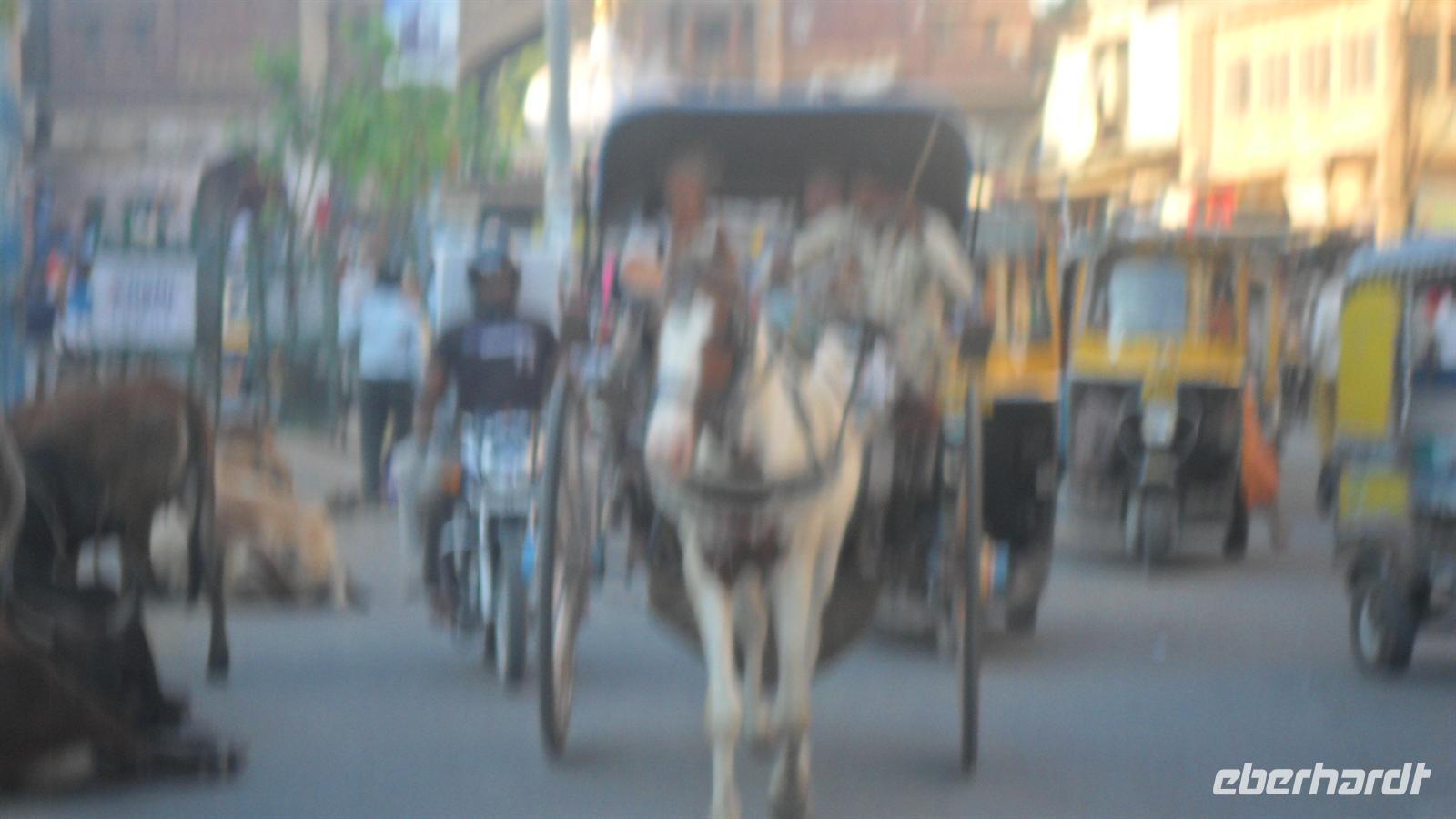 Danach besorgten wir einige Pferdekutschen, die uns aus der engen Innenstadt hinausbrachten zur Ausfallstraße, wo uns nach etwas Warterei der Bus abholte
