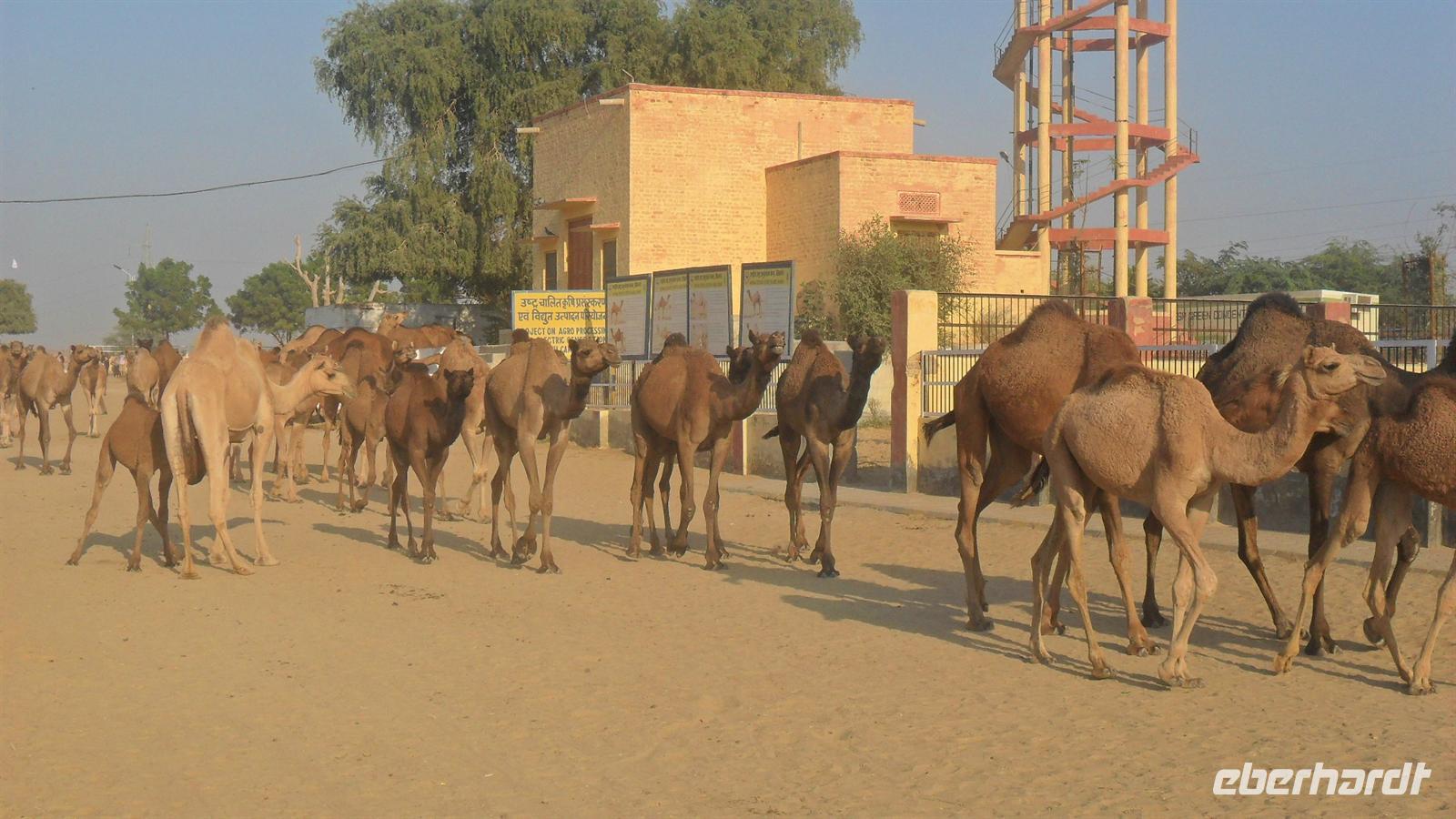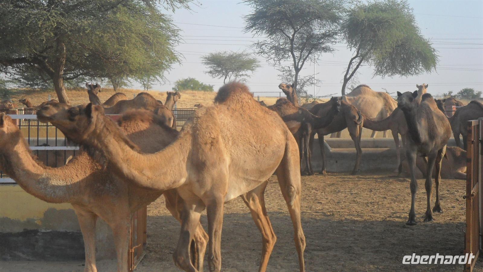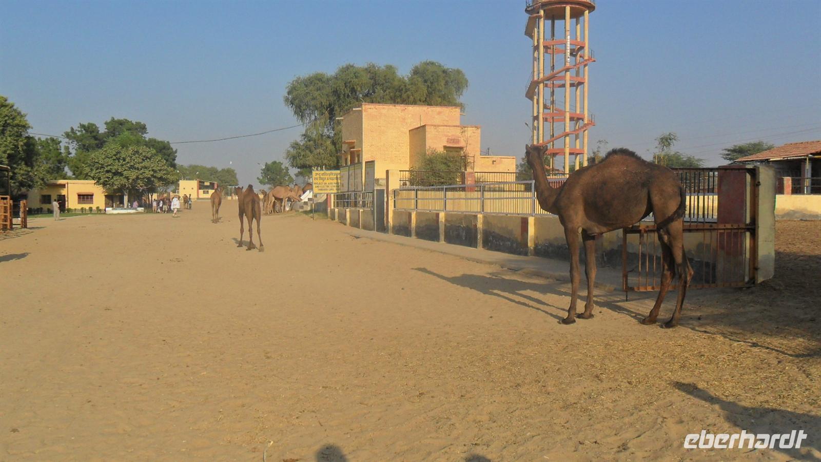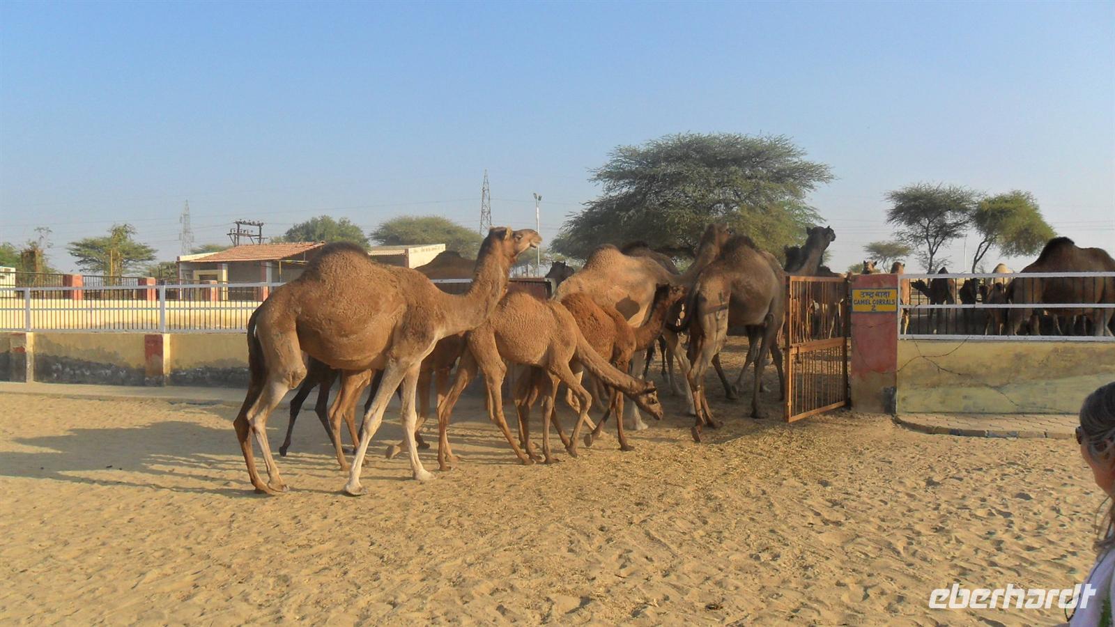Pünktlich gegen 15.30 Uhr erreichten wir dann Indiens einzige Kamelfarm - genau dann, als die Dromedare von den Weiden in die Ställe und zur Tränke geholt wurden. Rennkamele für die indischen Grenztruppen werden hier gezüchtet und wir hatten Gelegenheit, Jungtiere, ein Kamelbaby und Mutter- und Zuchttiere zu beobachten. Außerdem hatten wir neben dm Besuch der Zuchtstation die Gelegenheit zur Verkostung von Kamelmilch.