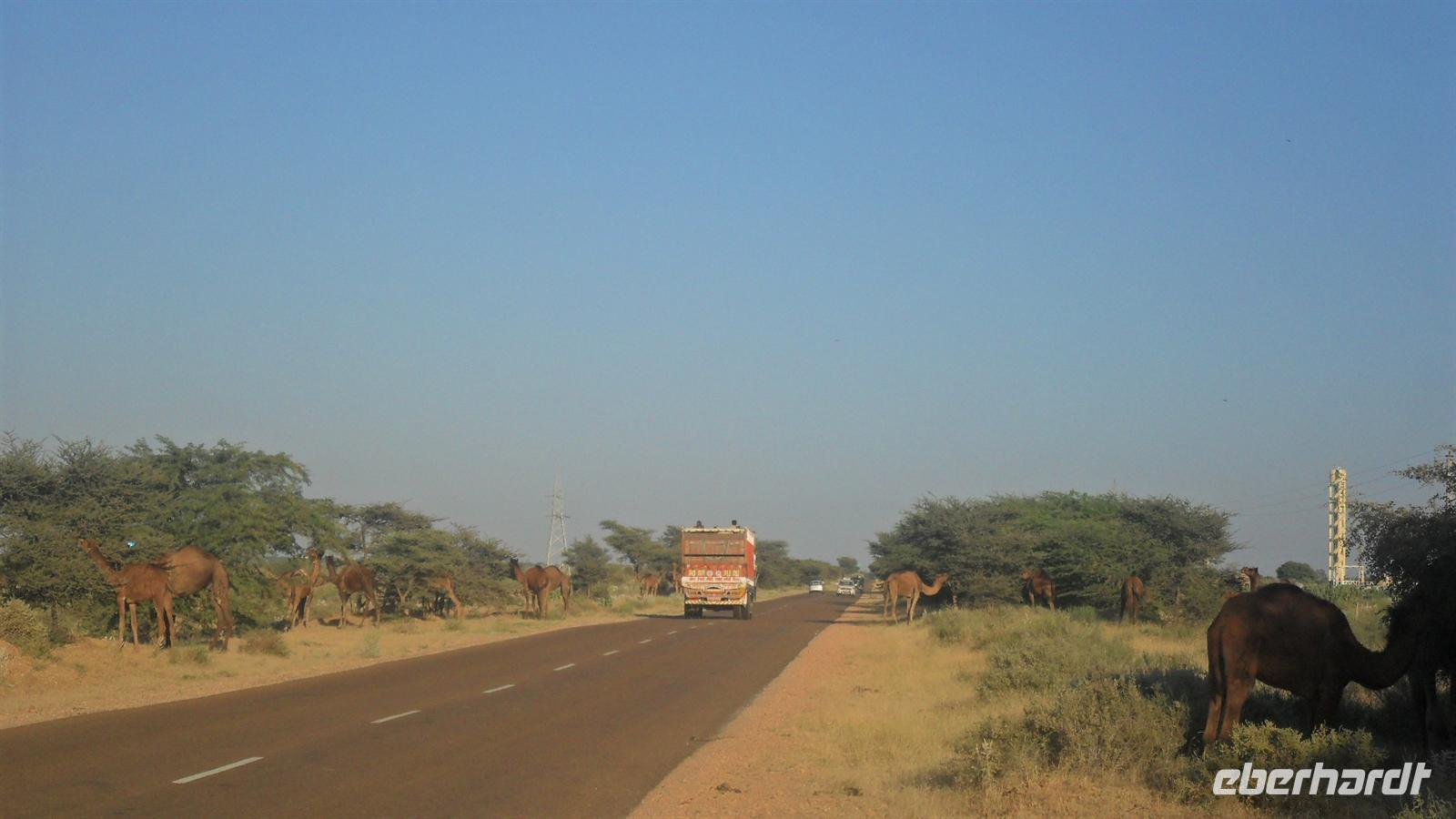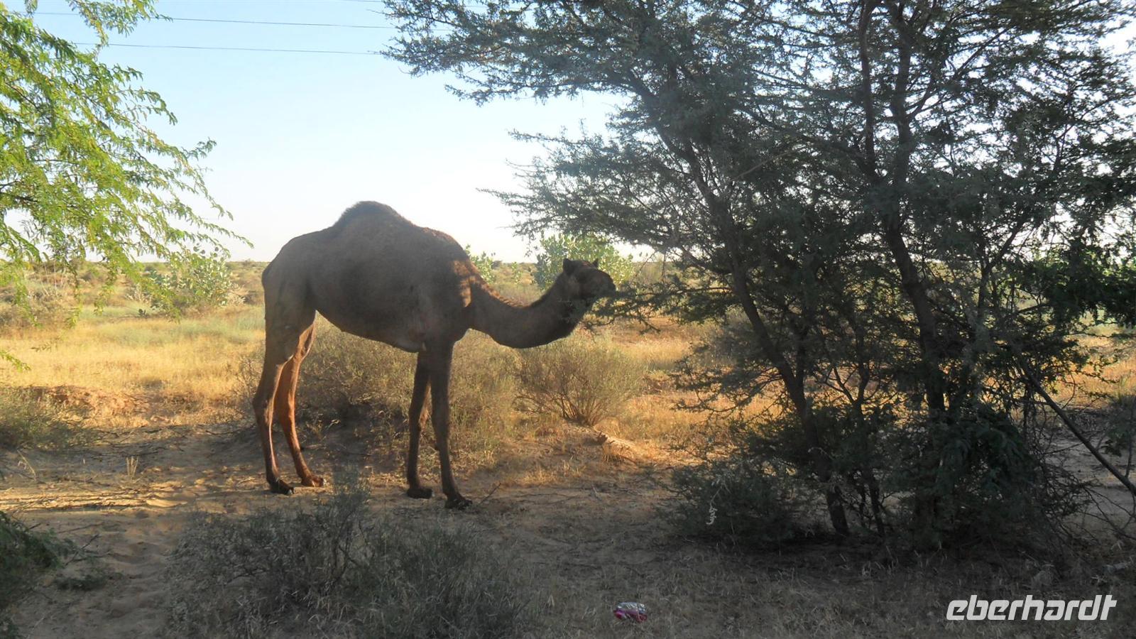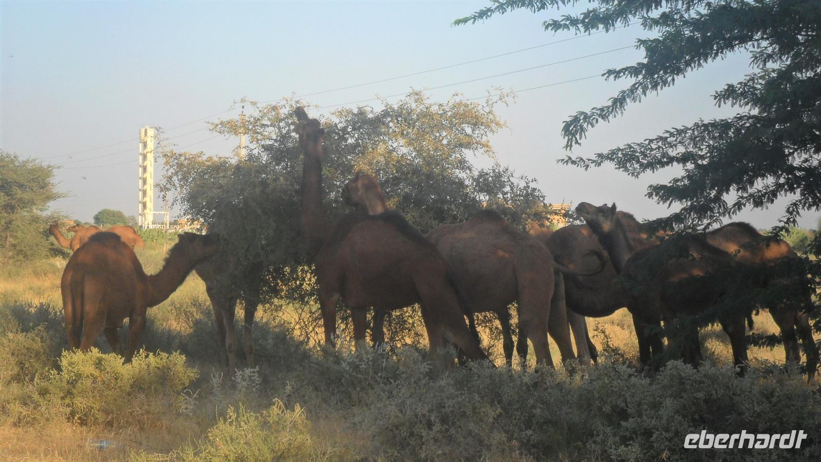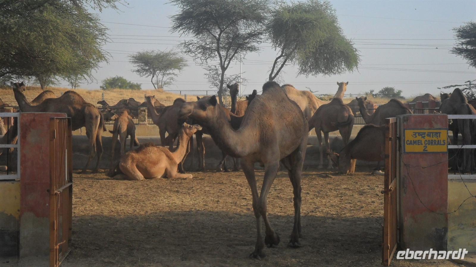Pünktlich gegen 15.30 Uhr erreichten wir dann Indiens einzige Kamelfarm - genau dann, als die Dromedare von den Weiden in die Ställe und zur Tränke geholt wurden. Rennkamele für die indischen Grenztruppen werden hier gezüchtet und wir hatten Gelegenheit, Jungtiere, ein Kamelbaby und Mutter- und Zuchttiere zu beobachten. Außerdem hatten wir neben dm Besuch der Zuchtstation die Gelegenheit zur Verkostung von Kamelmilch.
