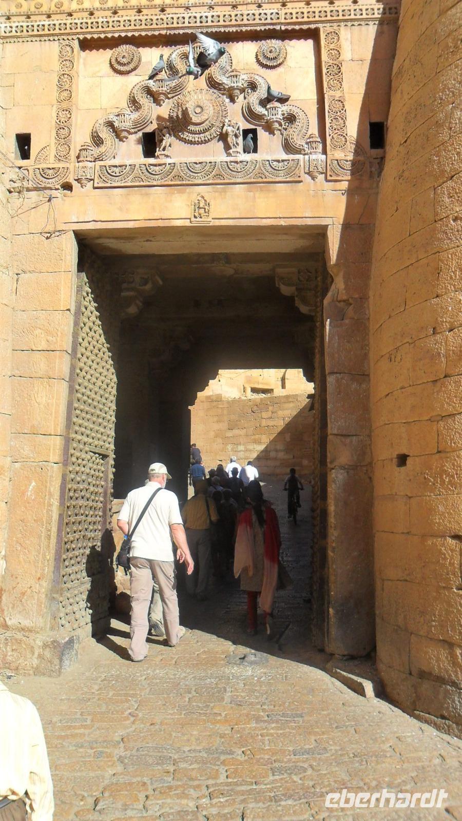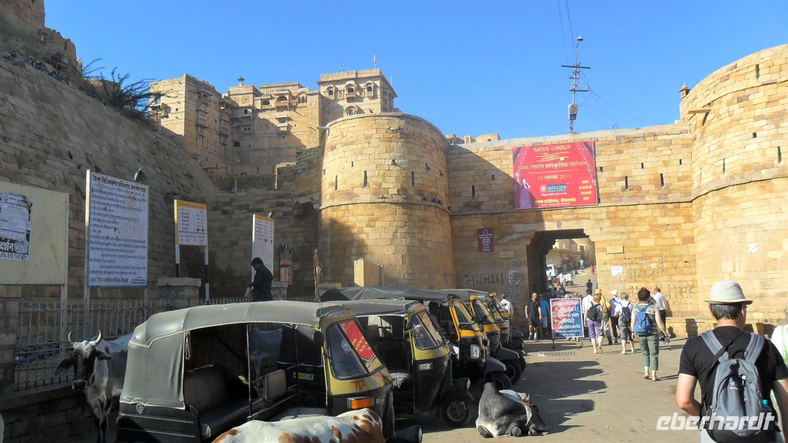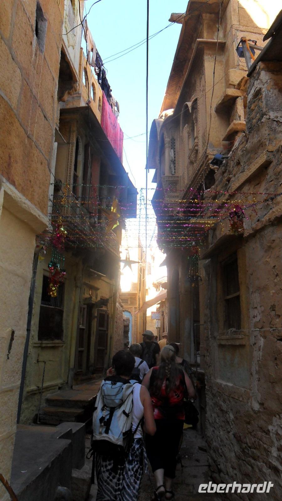 Den zehnten Reisetag verbrachten wir zunächst mit einer ausführlichen Stadtbesichtigung in Jaisalmer. Die „goldene Stadt“ hat ihren Beinamen vom honigfarbenen Sandstein, aus dem die Festung errichtet wurde. Die immer noch von den historischen Festungsmauern umgebene Innenstadt Jaisalmers gilt als die größte permanent bewohnte Festung der Welt. Zweihundert Türme und doppelte, dutzende Meter hohe Mauern umgeben die Innenstadt, die man durch ein beeindruckendes Tore-System erreicht.