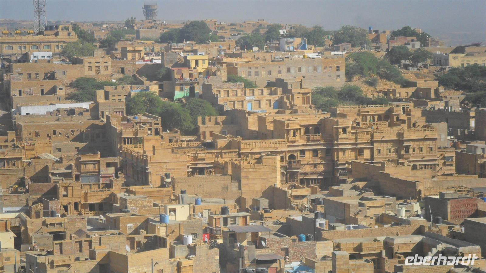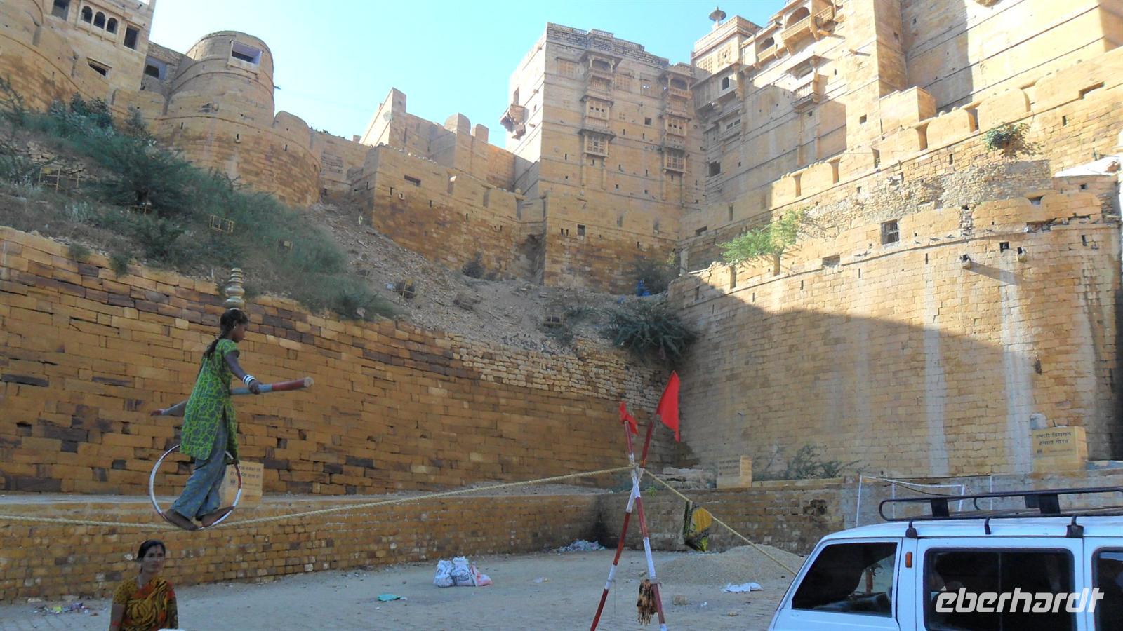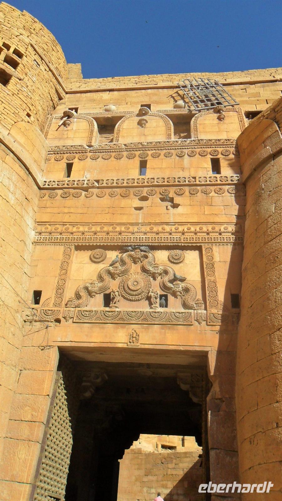 Den zehnten Reisetag verbrachten wir zunächst mit einer ausführlichen Stadtbesichtigung in Jaisalmer. Die „goldene Stadt“ hat ihren Beinamen vom honigfarbenen Sandstein, aus dem die Festung errichtet wurde. Die immer noch von den historischen Festungsmauern umgebene Innenstadt Jaisalmers gilt als die größte permanent bewohnte Festung der Welt. Zweihundert Türme und doppelte, dutzende Meter hohe Mauern umgeben die Innenstadt, die man durch ein beeindruckendes Tore-System erreicht.