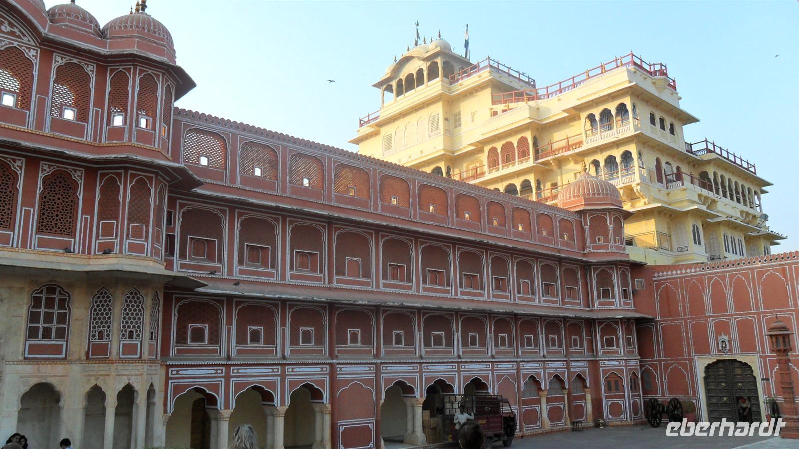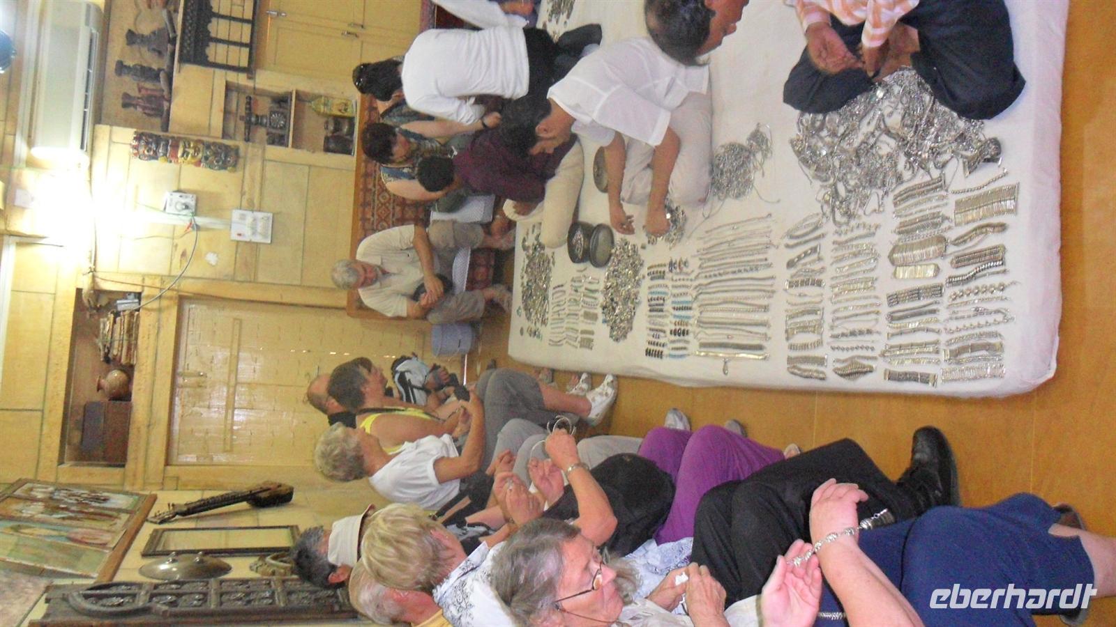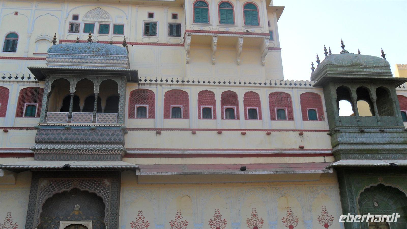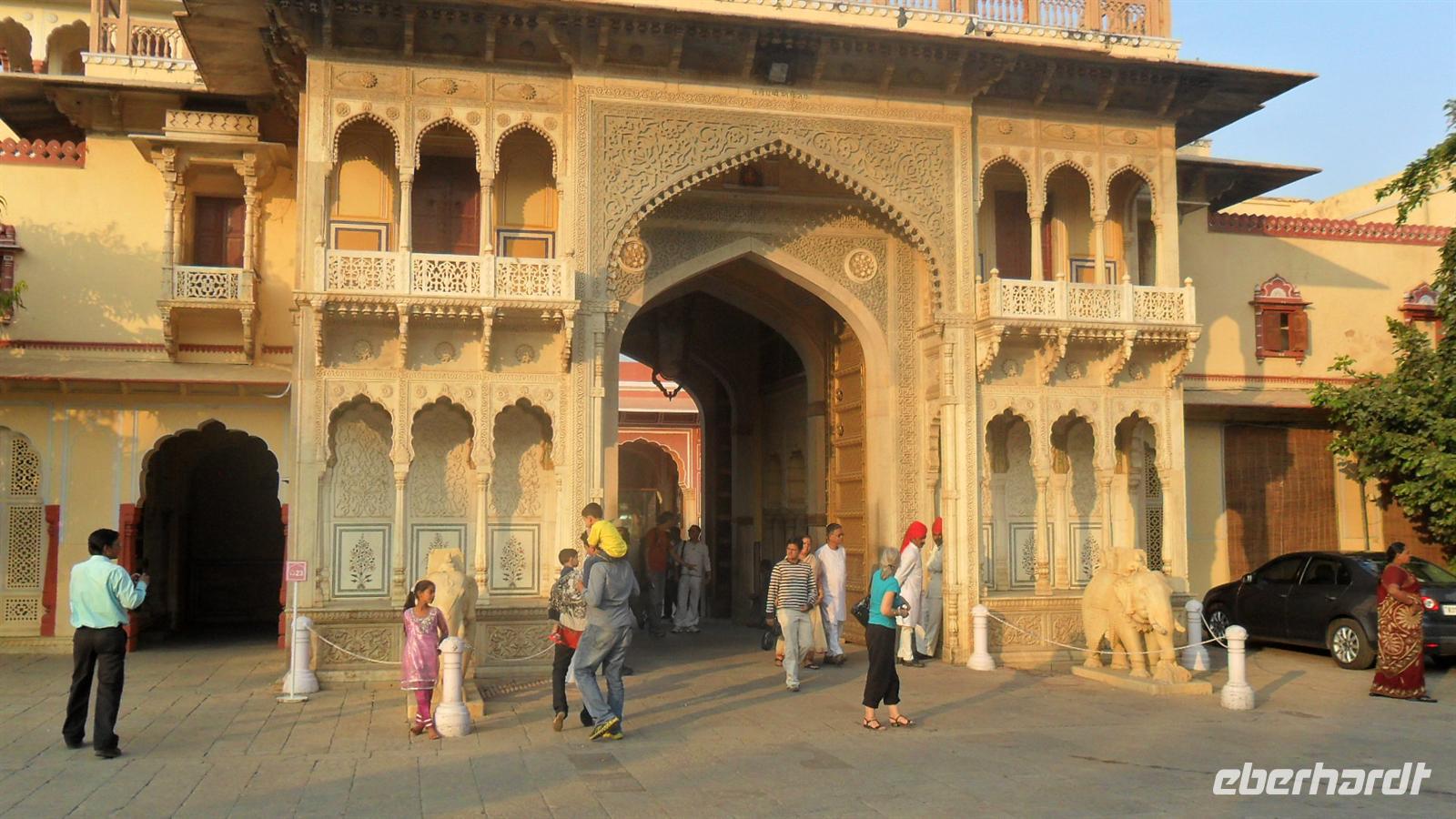 Nach Jai Singhs Observatorium besuchten wir noch den Stadtpalast. In einem Teil davon wohnt der Maharadschah von Jaipur noch immer. Der größte Teil des Gebäudekomplexes ist aber zu besichtigen und enthält eine Bilderausstellung, ein Textilmuseum und eine Kollektion historischer Waffen. Nach etwas Freizeit außerhalb des Palastes - letzte Gelegenheit für Fotos vom quirligen Leben in Rajasthans Metropole - fanden wir uns noch zusammen zu einem Besuch in einem Textilzentrum, in dem wir in die Geheimnisse des indischen Teppichknüpfens und des Vielfarbdrucks mit Pflanzenfarben eingeführt wurden,