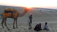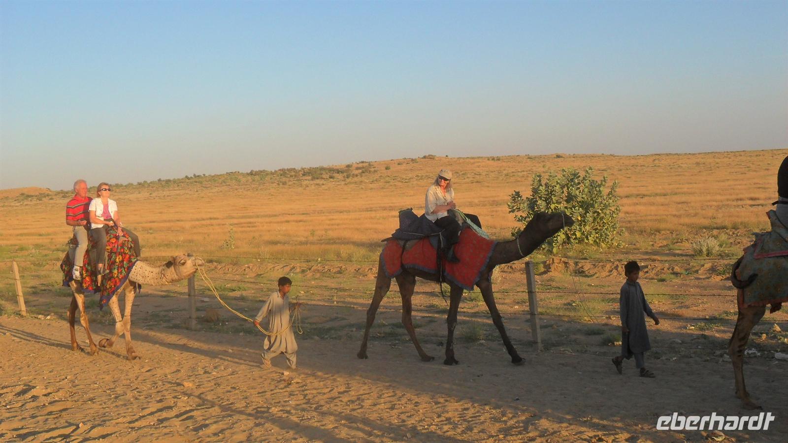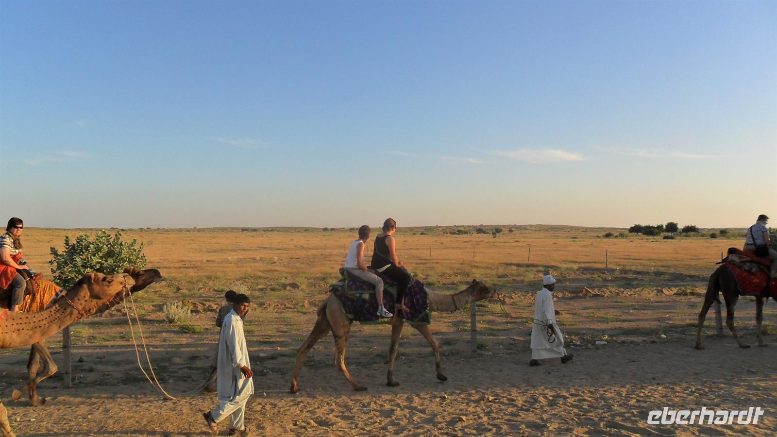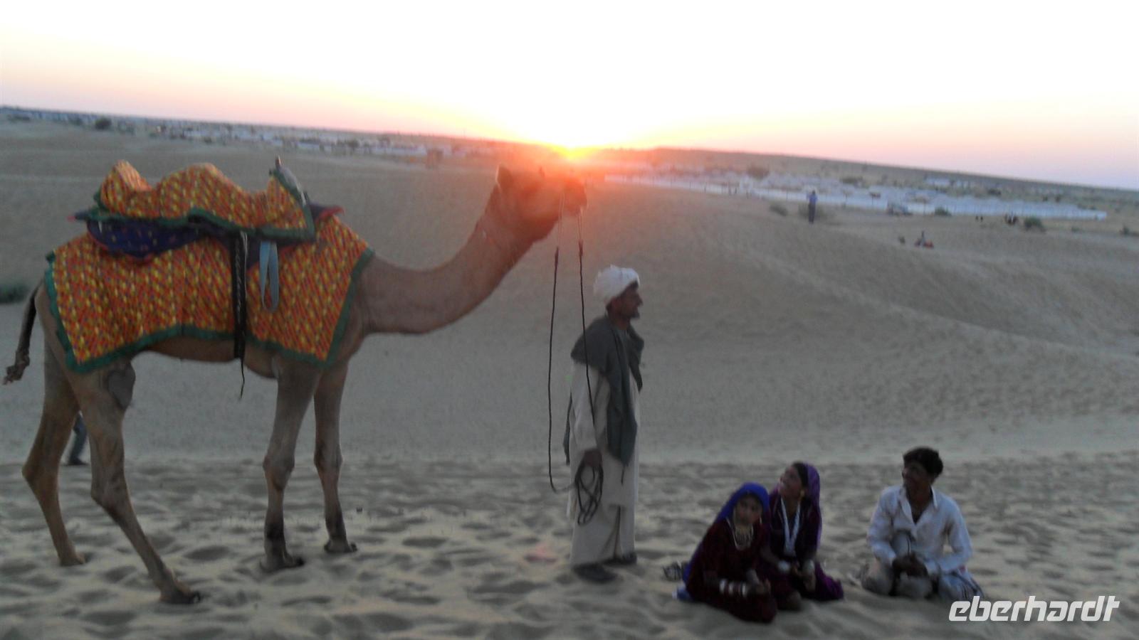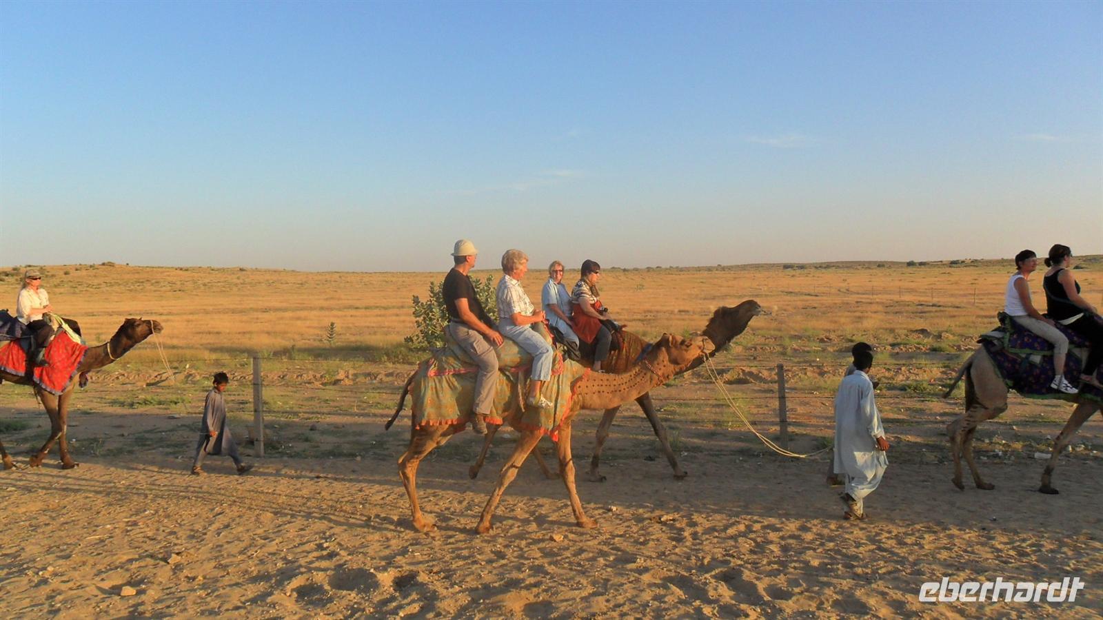 Abends ging es dann zum mit Spannung erwarteten Dromedarritt in die Thar-Wüste. Die Gäste bestiegen ihre Reittiere oder den gleichfalls bereitgestellten Kamelwagen und ließen sich mit wiegendem Gang auf die Sanddünen tragen. Das Ende des Tages nahte mit dem Erlebnis eines Sonnenunterganges und dem Genuß einer leckeren Rum-Cola untermalt durch eine kleine Gruppe indischer Musiker und Tänzerinnen.
