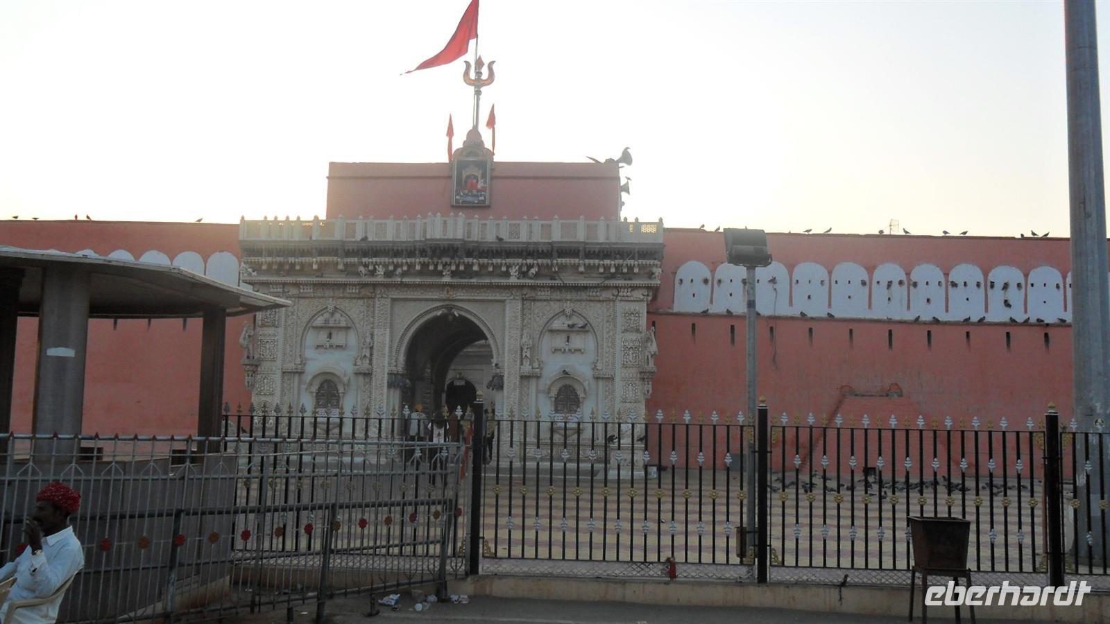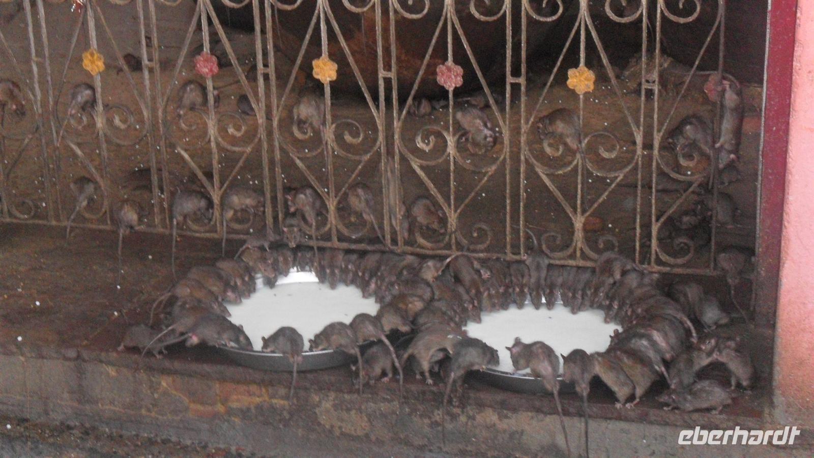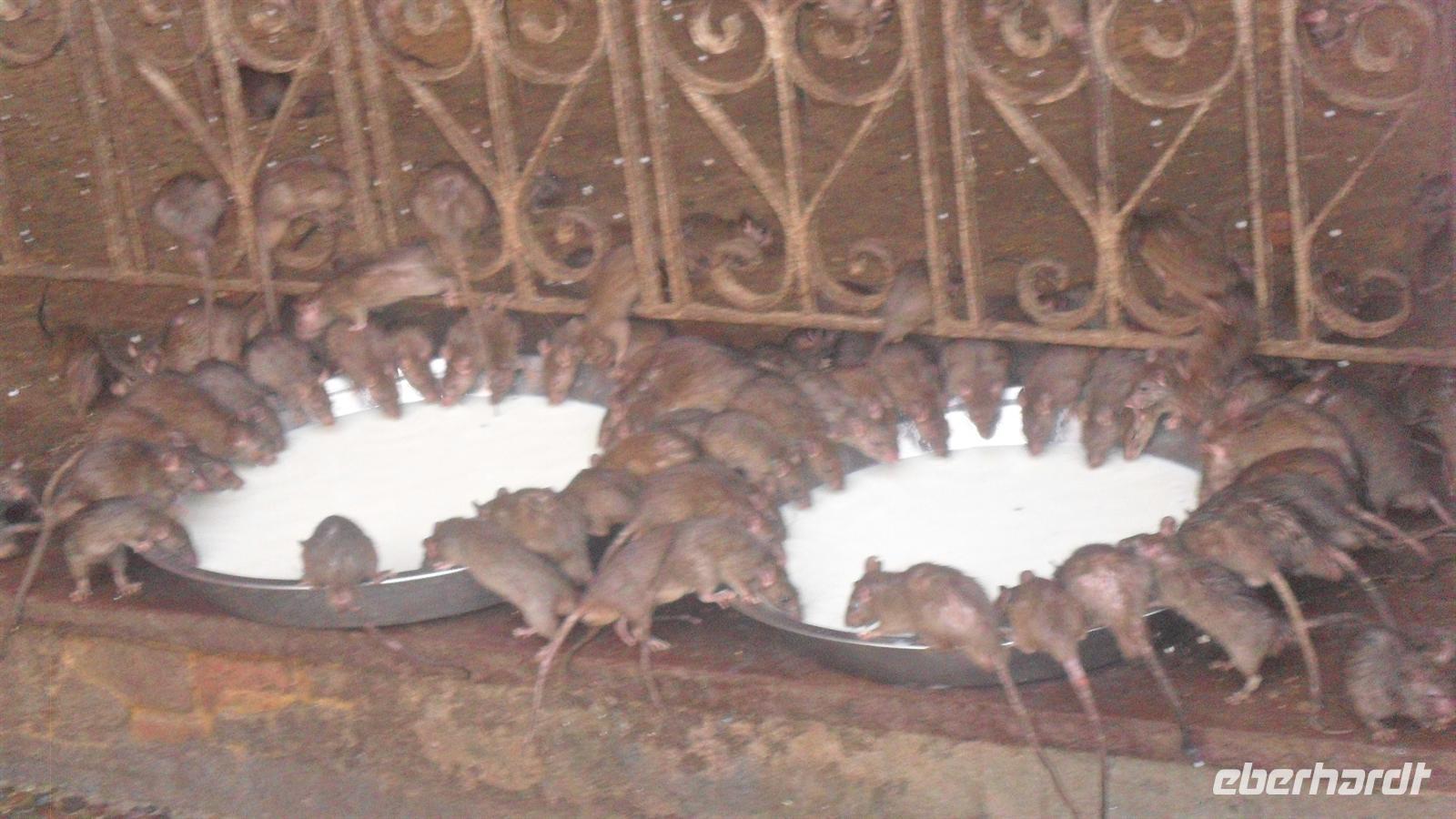 Der nächste Programmpunkt wurde wie immer vorher viel diskutiert, ist er doch durchaus für viele unserer Gäste etwas gewöhnungsbedürftig: der Besuch des „Rattentempels“ der Karni Mata. Etwa zwanzigtausend freilebende Ratten gibt es hier und die Legende sagt, dass sie nach ihrem Tod als Dichter wiedergeboren werden. Die Achtung der Hindus vor allem Leben läßt es nicht zu, dass Ratten ähnlich verachtet werden wie bei uns in Europa. Nunmehr können fast alle unsere Gäste zu Hause stolz erzählen, dass sie sich in ein komplett von Ratten belegtes Gebäude gewagt hatten