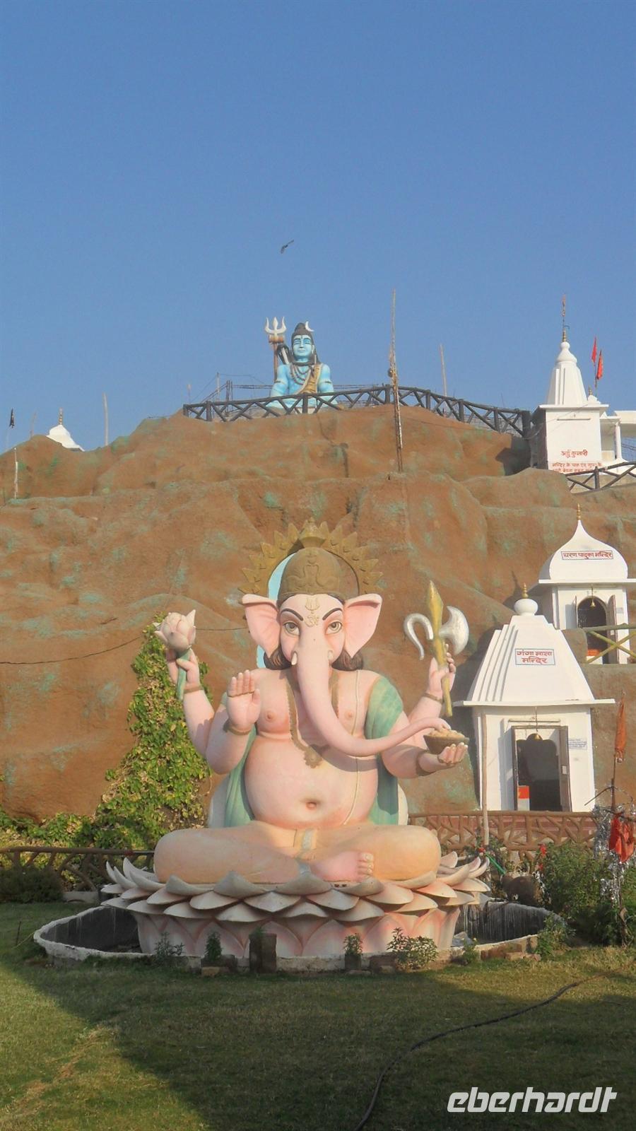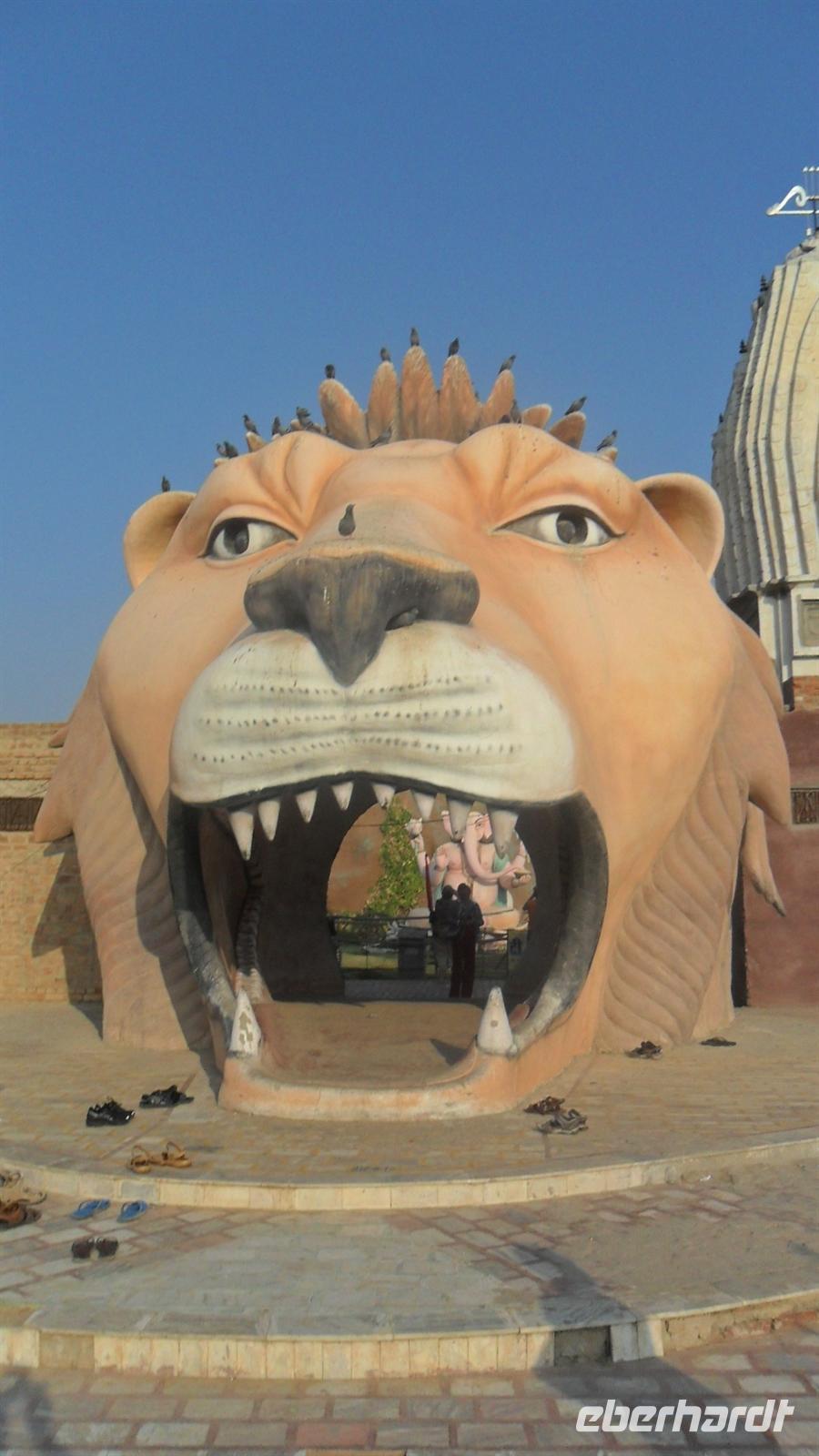 Vieles zu Indien können hier die Reiseleiter schon anhand „vorbeifliegender“ Eindrücke erklären und eigentlich gebe ich auch hier schon eine kleine Einführung in die doch recht komplizierte Hindu-Religion, die in Indien vorherrscht, denn kurz nach Fazirabad gibt ein Fotostop Gelegenheit für religiöse Erklärungen: fast dreißig Meter hoch ist die Statue des wichtigen Gottes Shiva, die hier auf freiem Feld steht. Brahma der Schöpfer, Vishnu der Bewahrer und Shiva der Zerstörer sind die wichtigsten Hindu-Götter, zusammen mit Durga, der Mutter- und Fruchtbarkeitsgöttin, dier in unglaublich vielen Inkarnationen und regionalen Varianten auftreten kann. Die Gelegenheit ist günstig, ein wenig über den Hinduismus, seine Götter und religiösen Fragen zu erzählen. Die religiösen Dinge sind und bleiben der wichtigste Schlüssel zum Verständnis der indischen Traditionen, Gedankenwelt und Lebensweise.