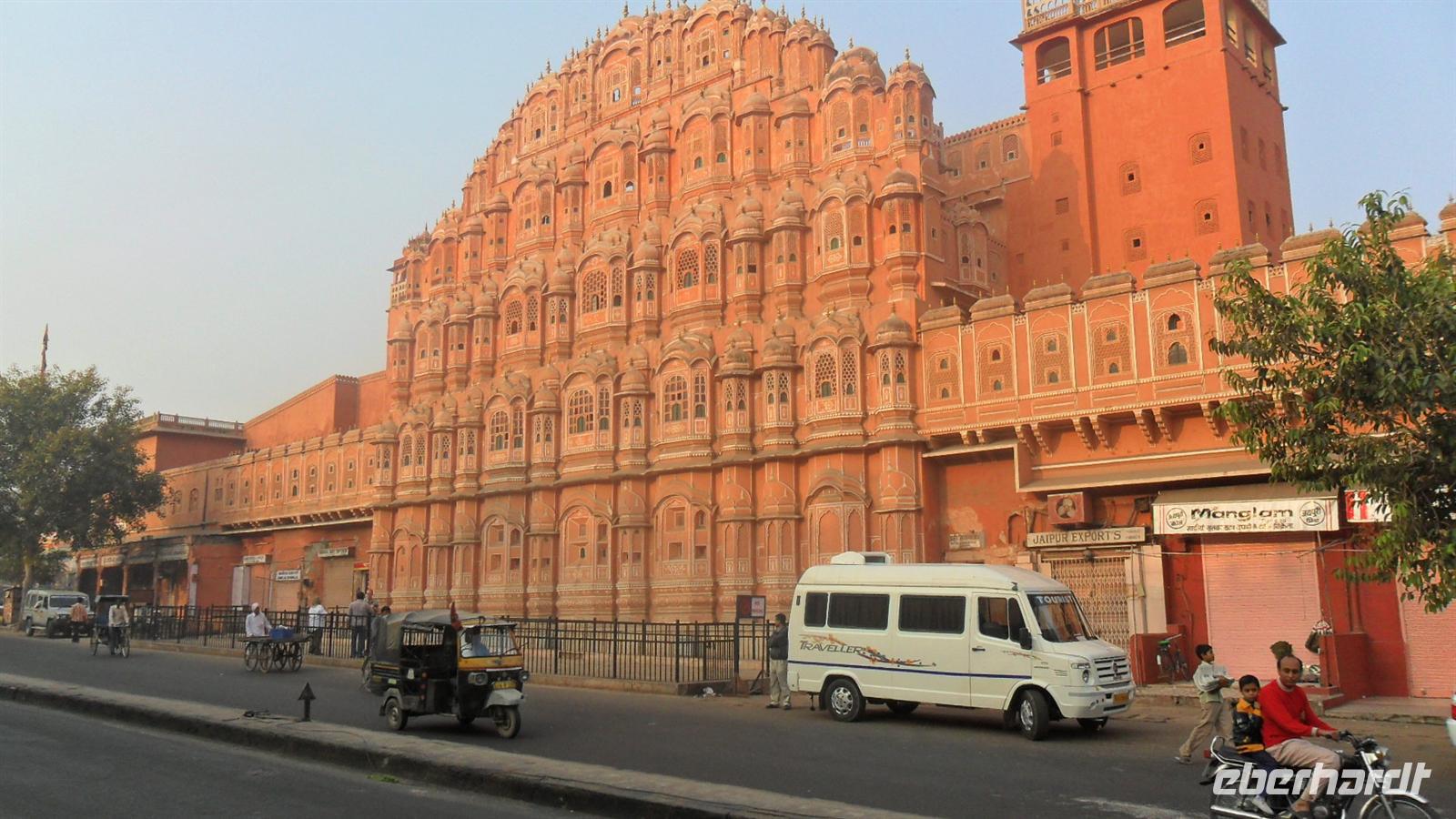 Der dreizehnte Tag unserer Reise, begann mit einer kurzen Fahrt zum Hawa Mahal, dem berühmten „Palast der Winde“ Manche behaupten, es sei das nach dem Taj Mahal bekannteste Bauwerk Indiens. Eigentlich ist es nur eine Fassade mit hunderten durch durchbrochene steinerne Blenden geschützte Fenster. Zahllose Händler wissen um die morgendlichen Fotostopps der Touristen - denn nur dann ist das Licht zum Fotografieren besonders günstig - und stehen mit allerlei Krimskrams bereit, um die Gunst der Stunde und den erhofften Kaufwillen der vielen hier für einen Moment versammelten Touristen zu nutzen. Hier trifft man meist auch Schlangenbeschwörer, die hier, vor dem Palast der Winde, gern mit ihren tanzenden Kobras fotografiert werden und dabei die besten Trinkgelder des Tages bekommen.