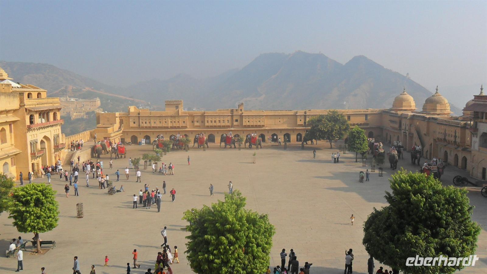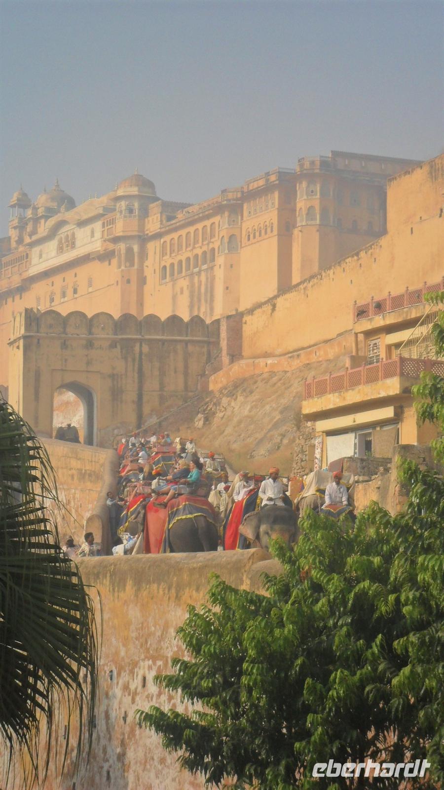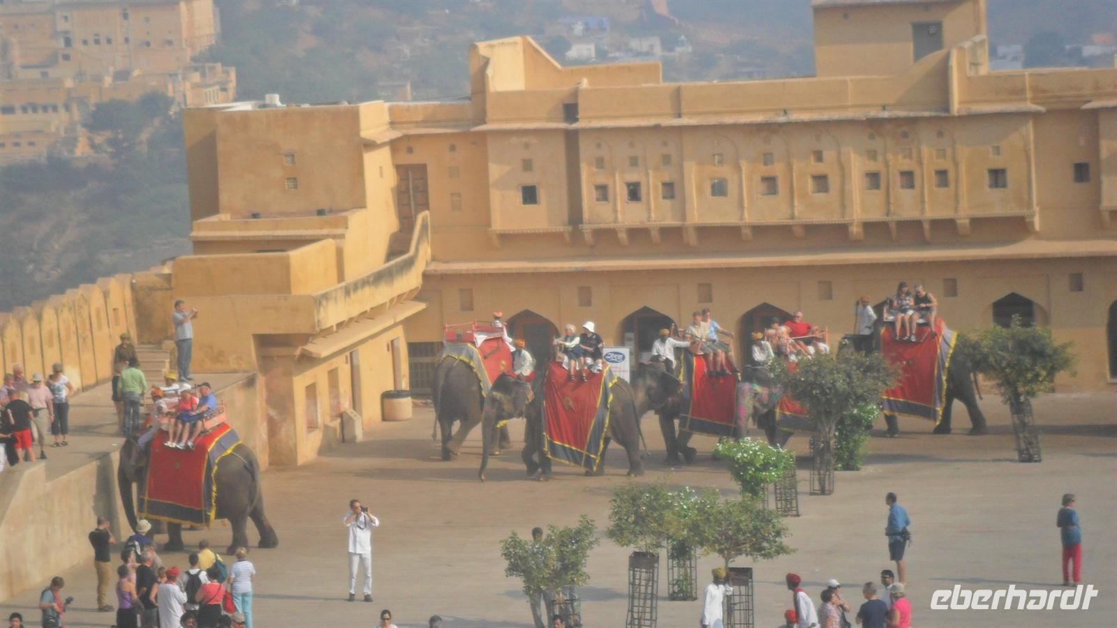 Nach dem Stopp setzten wir unseren Weg zur Festung Amber fort, wo wir uns auf den angekündigten Elefantenritt freuten. Deswegen mussten wir auch recht früh aufbrechen - da die (übrigens von deutschen TÜV Rheinland auf Einhaltung der Sicherheitsnormen überprüften) Elefanten vom Amber-Fort nur wenige Stunden am Tag arbeiten und Touristen den steilen Burgberg hinauf befördern dürfen, ist die Warteschlange recht lang. Mehr als eine halbe Stunde mussten wir trotz frühem Aufbruch stehen, aber wir taten’s mit Gelassenheit - denn gerade der Elefantenritt ist doch einer der Höhepunkte der Reise! Aus Sicherheitsgründen dürfen immer nur noch zwei Personen (statt früher vier) auf dem Podest Platz nehmen, das auf den Elefantenrücken gebunden ist und auf dem man den etwa zwölf- bis fünfzehnminütigen Weg hoch zum Palast schaukelt - für viele Indien-Touristen der vielleicht einzige Kontakt mit einem Elefanten.