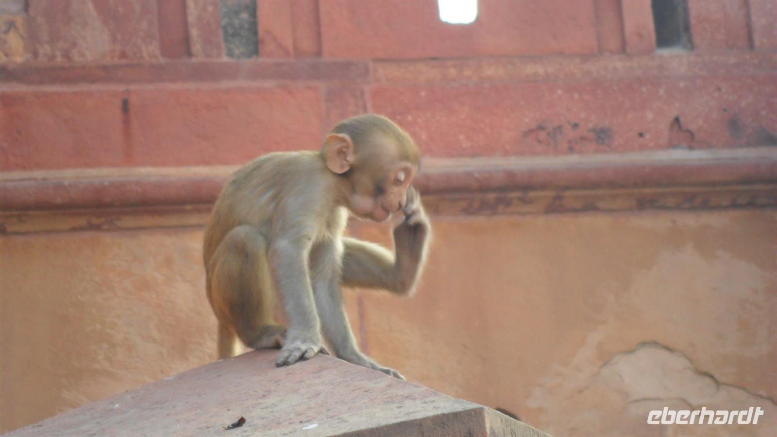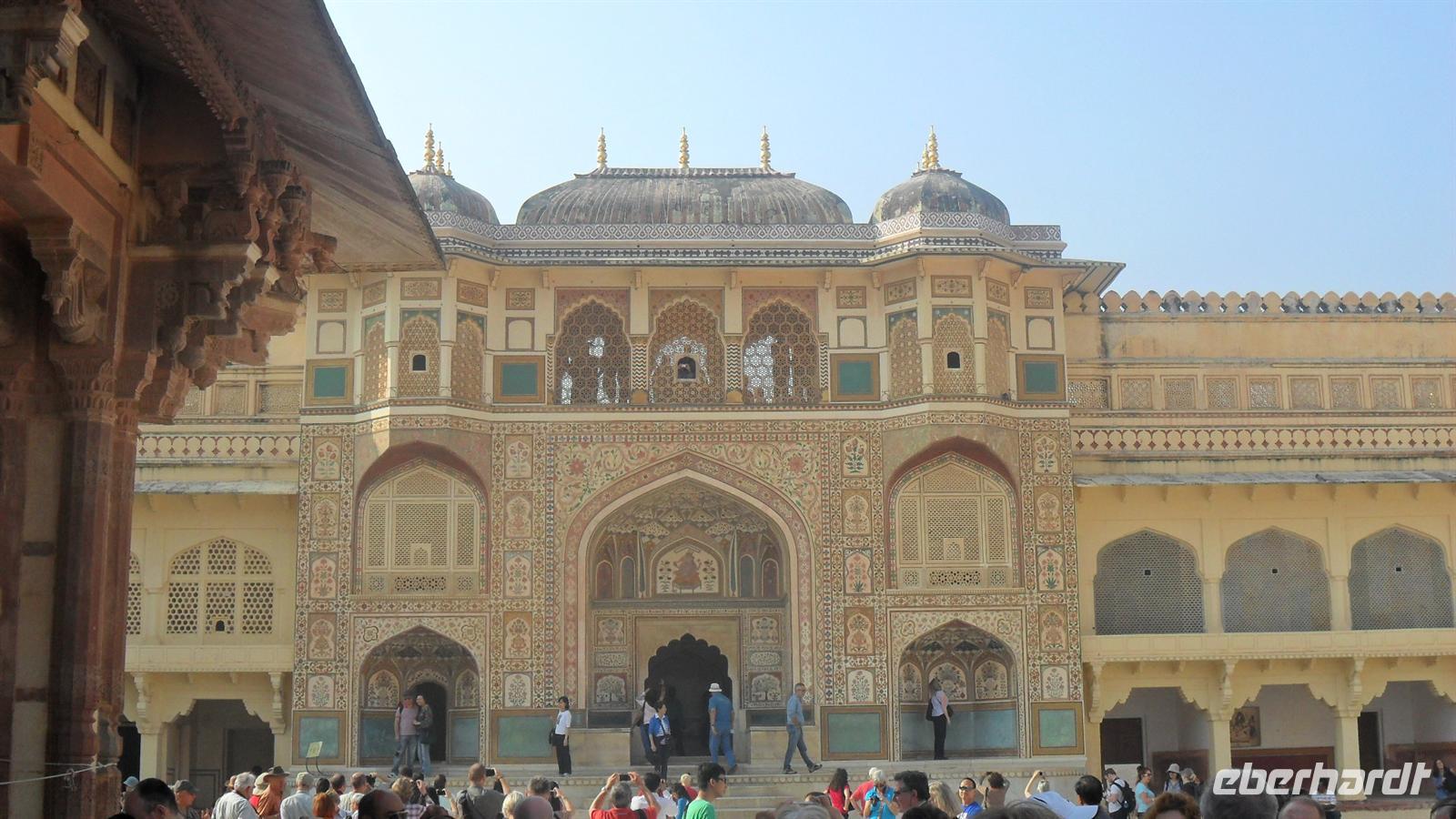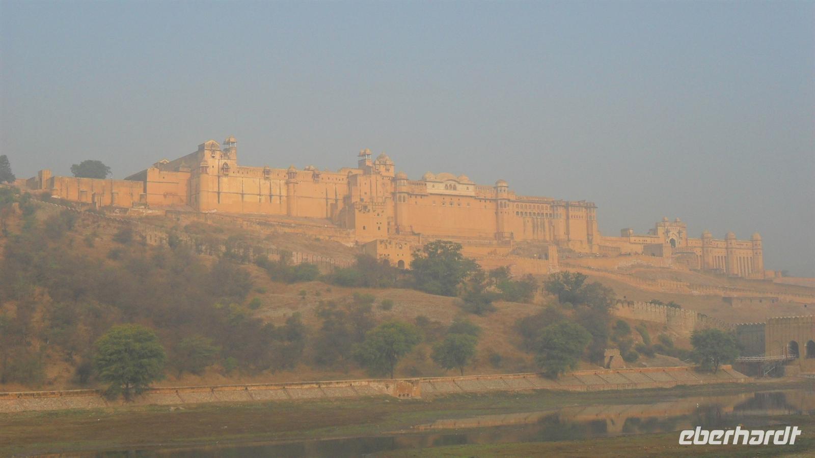 Nach dem Stopp setzten wir unseren Weg zur Festung Amber fort, wo wir uns auf den angekündigten Elefantenritt freuten. Deswegen mussten wir auch recht früh aufbrechen - da die (übrigens von deutschen TÜV Rheinland auf Einhaltung der Sicherheitsnormen überprüften) Elefanten vom Amber-Fort nur wenige Stunden am Tag arbeiten und Touristen den steilen Burgberg hinauf befördern dürfen, ist die Warteschlange recht lang. Mehr als eine halbe Stunde mussten wir trotz frühem Aufbruch stehen, aber wir taten’s mit Gelassenheit - denn gerade der Elefantenritt ist doch einer der Höhepunkte der Reise! Aus Sicherheitsgründen dürfen immer nur noch zwei Personen (statt früher vier) auf dem Podest Platz nehmen, das auf den Elefantenrücken gebunden ist und auf dem man den etwa zwölf- bis fünfzehnminütigen Weg hoch zum Palast schaukelt - für viele Indien-Touristen der vielleicht einzige Kontakt mit einem Elefanten.