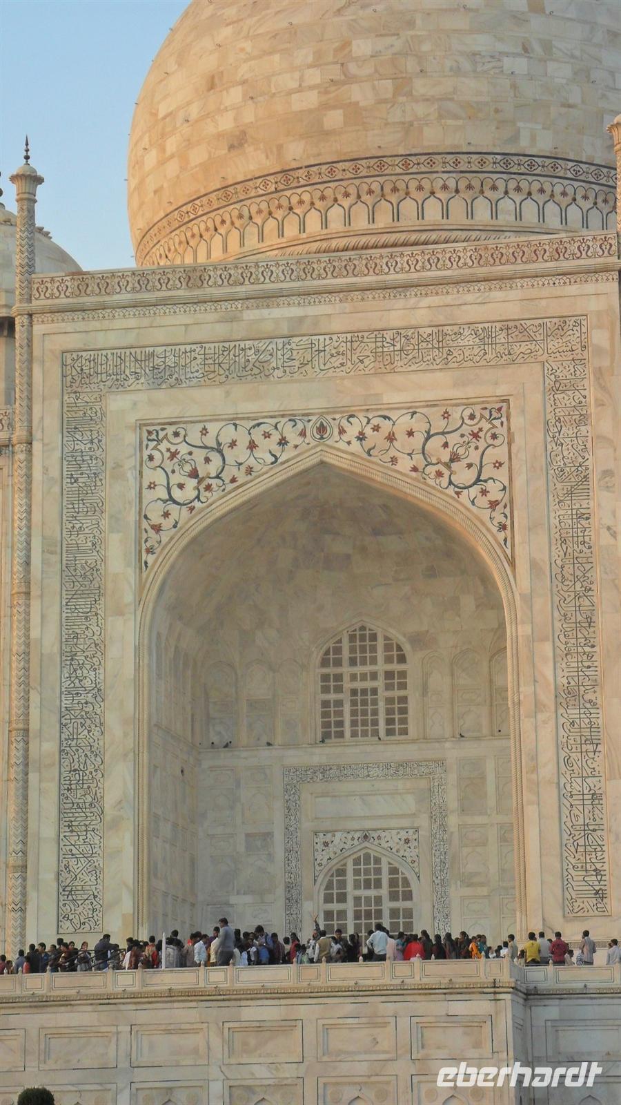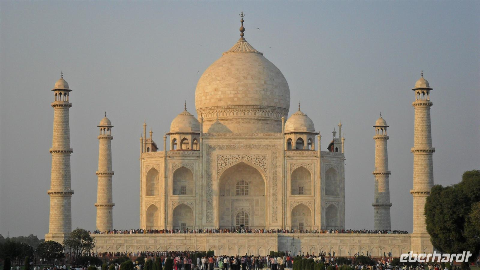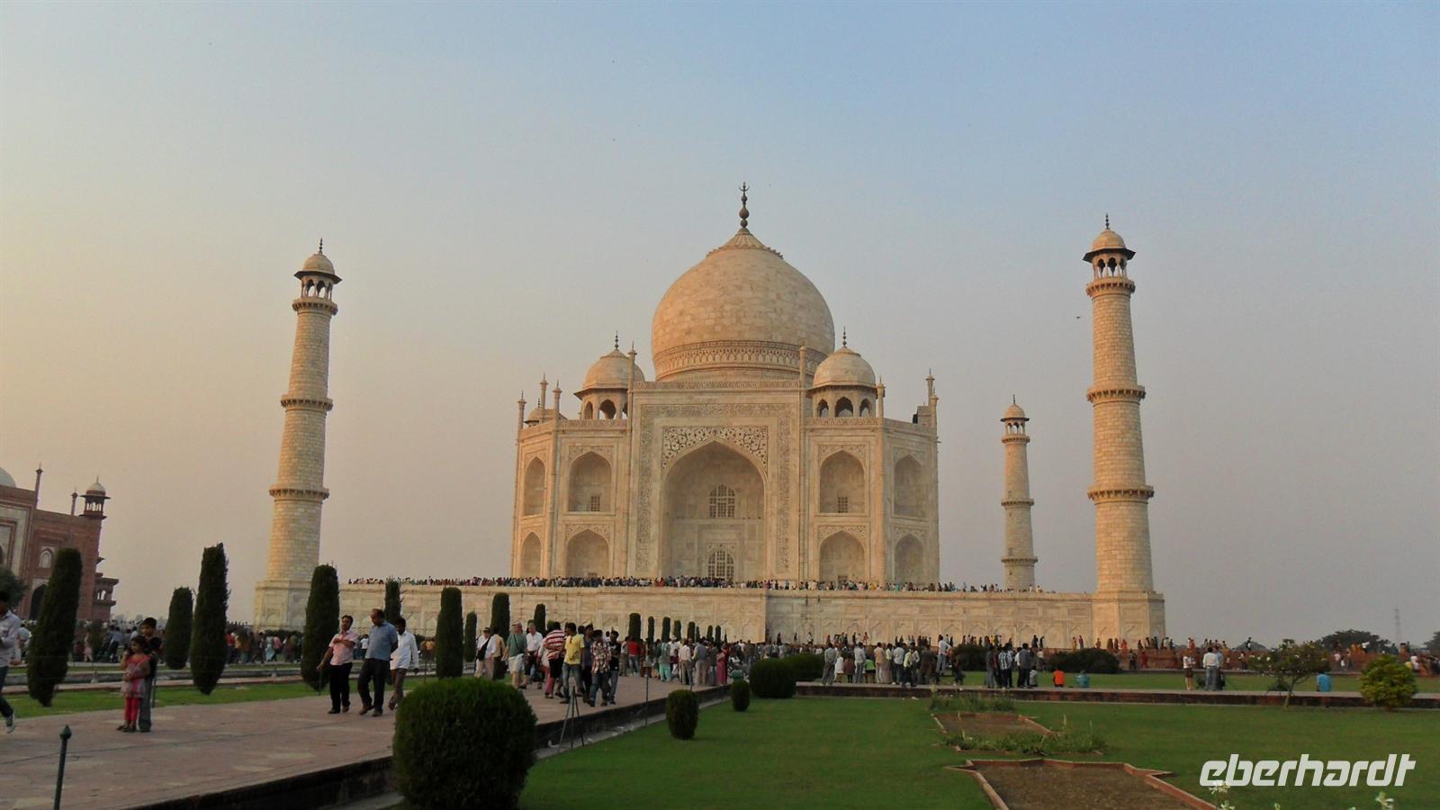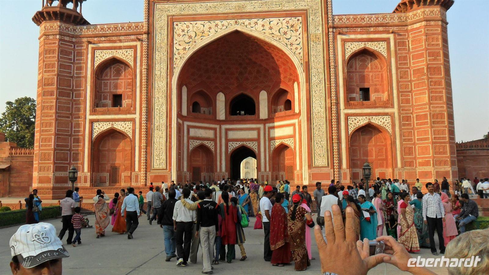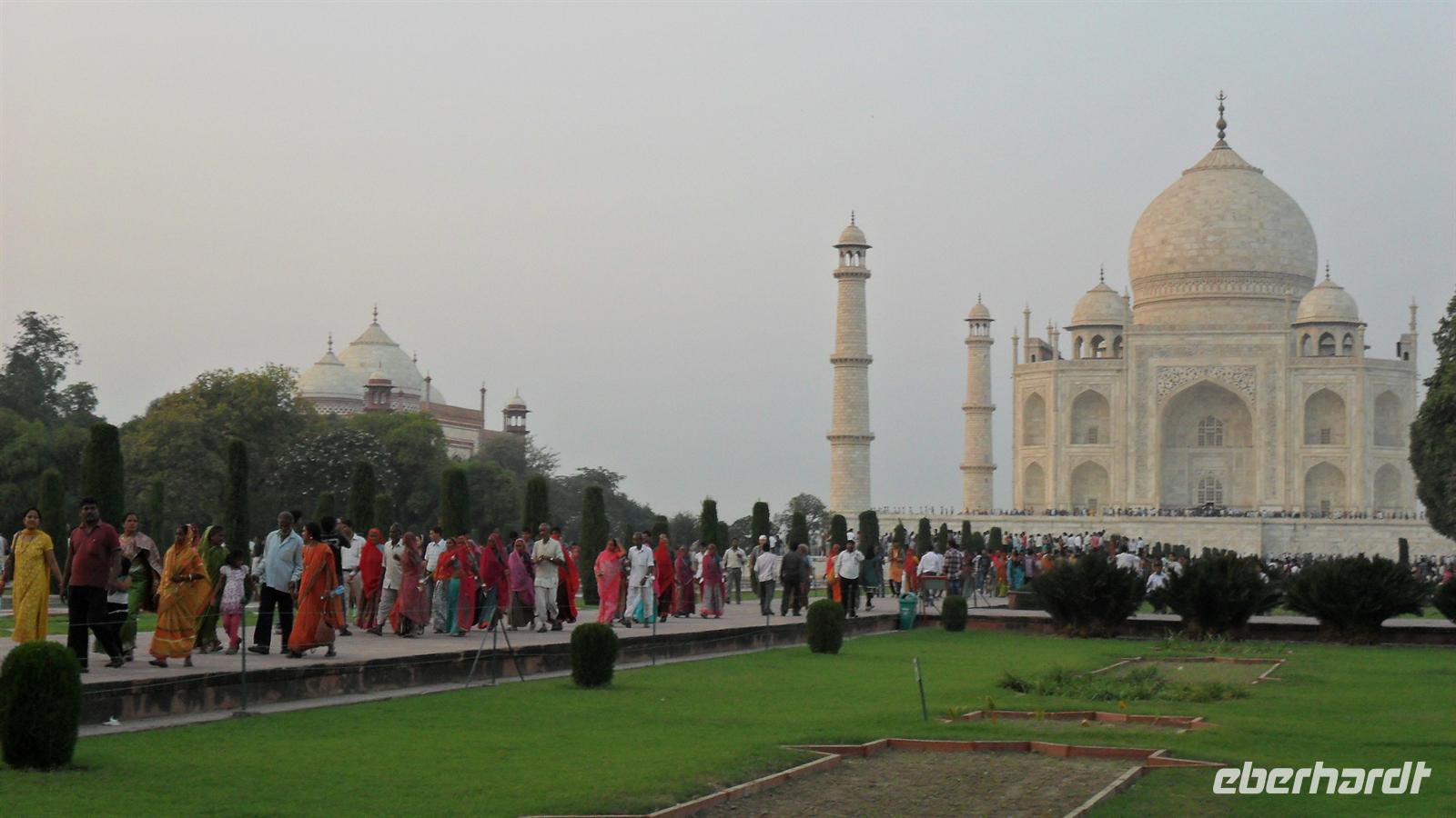 Der ersten große Höhepunkt der Reise, der Besuch des Taj Mahalist zweifellos DAS Ziel des Tages und gehört zu den bekanntesten und meistfotografierten indischen Sehenswürdigkeiten. Auch Einheimische besuchen dieses unglaubliche Bauwerk gern - wovon die unglaublichen Scharen der farbenfroh gekleideten indischen Besucher beredtes Zeugnis ablegen.