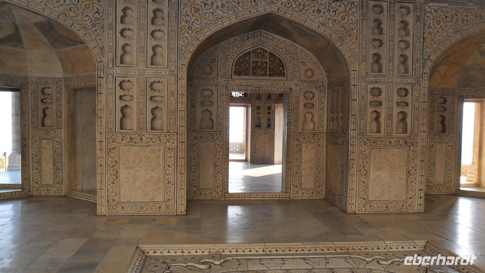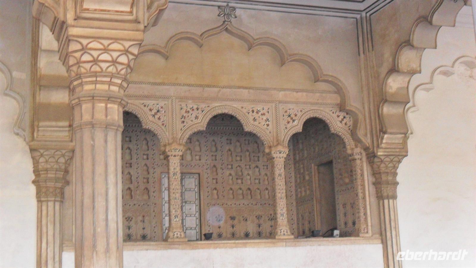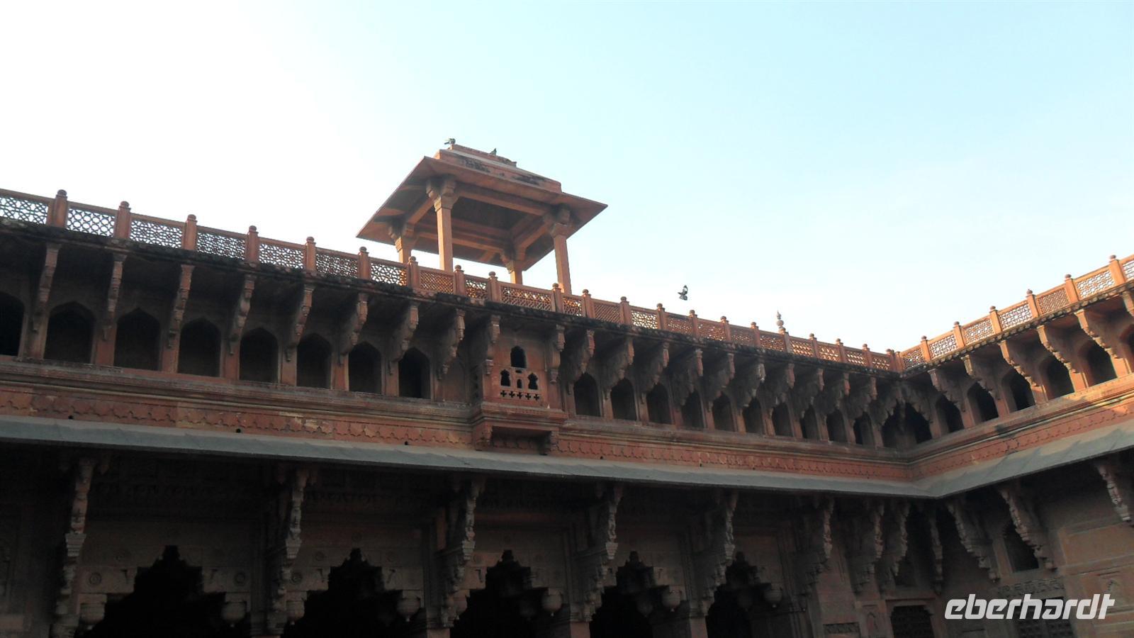Der vierte Reisetag begann mit dem morgendlichen Frühstück und danach der Fahrt zum Besuch des berühmten Roten Forts von Agra. Die Festung - ähnlich gebnaut wie das rote Fort von Delhi - ist eine der größten Festungsanlagen des indischen Subkontinents und wird nochh heute teiulweise vom indischen Militär genutzt. Die Anlage ist gewaltig, umfangreich und der alte Palastteil - den man komplett besichtigen kann - ist überaus beeindruckend: In der großen äußeren Audienzhalle hielten die muslimischen Kaiser Indiens, die Moguln, Hof und Gericht. Als besonders aufregend gilt die Geschichte vom Lieblingselefanten des Mogul Akhbar: angeblich durfte dieser Elefant zu Zeiten Akhbars als Richter entscheiden: verurteilte Schwerverbrecher wurden vor den Elefanten gelegt und nach seiner Reaktion wurden sie zertrampelt oder verschont. Die weiteren Paläste, Marmor- und Sandsteinhallen und wundervolle Höfe mit Gartenanlagen und Wasserspielen sind die sehenswerten Attraktionen des Roten Forts von Agra.