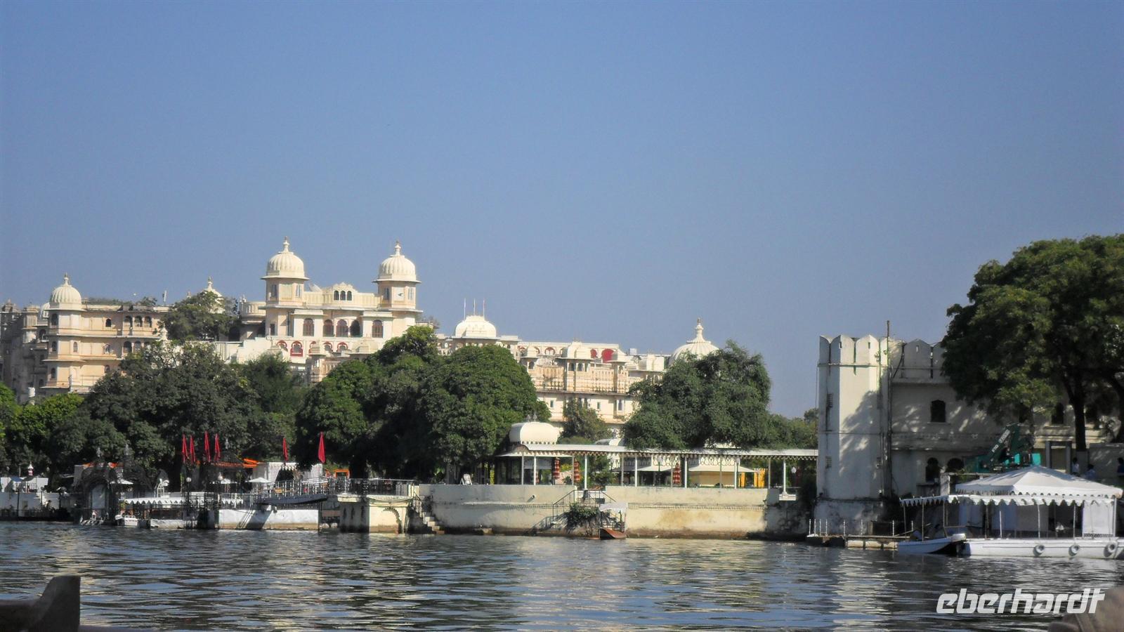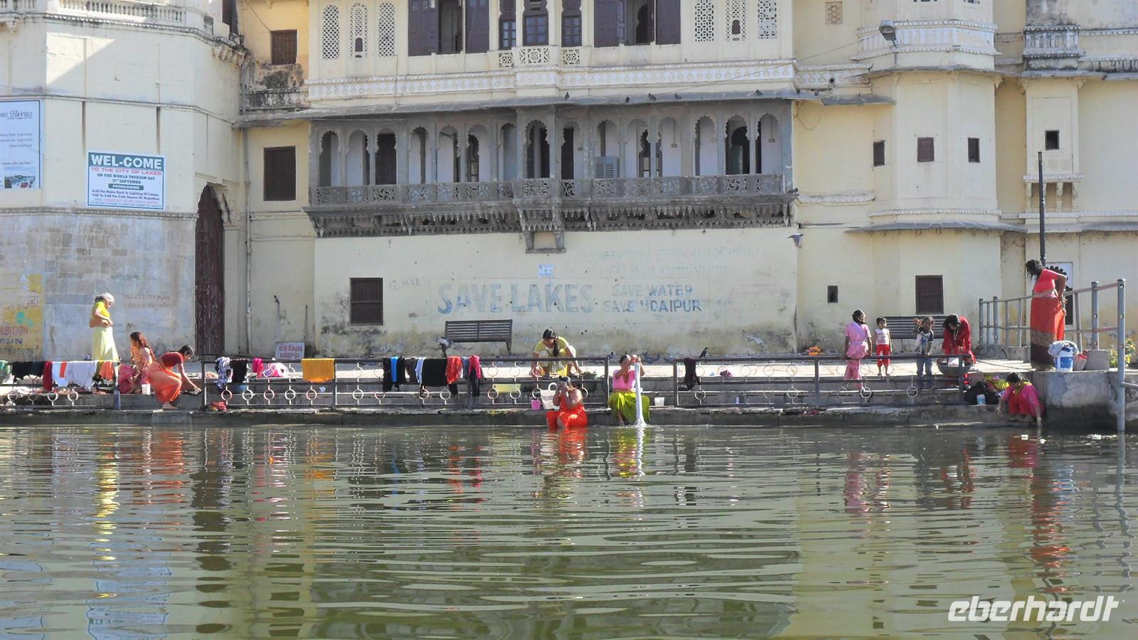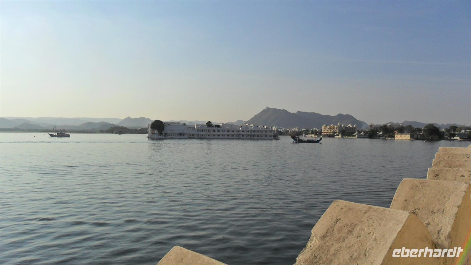 Die am Vorabend wegen Geburtstagsparty verlegte Bootsfahrt schloß sich an - und das Erlebnis des Hingleitens auf dem gut mit Wasser gefüllten Pichola-See war wie immer ein Genuß. Begeisterte Ausrufe kommentierten denn auch die herrlichen Ansichten vom Stadtschloß, das sich im Wasser spiegelt, von den Waschplätzen am See, an denen die Frauen Wäsche auf den Steintreppen waschen, die Vorbeifahrt am „Wasserschloß-Hotel“, das auf einer Insel liegt. Reed’s Nobelhotel ist heute eines der teuersten in Indien und kann von sich behaupten, eine berühmte Filmkulisse zu sein: Teile des achten James-Bond-Films „Octopussy“ wurden hier gedreht.