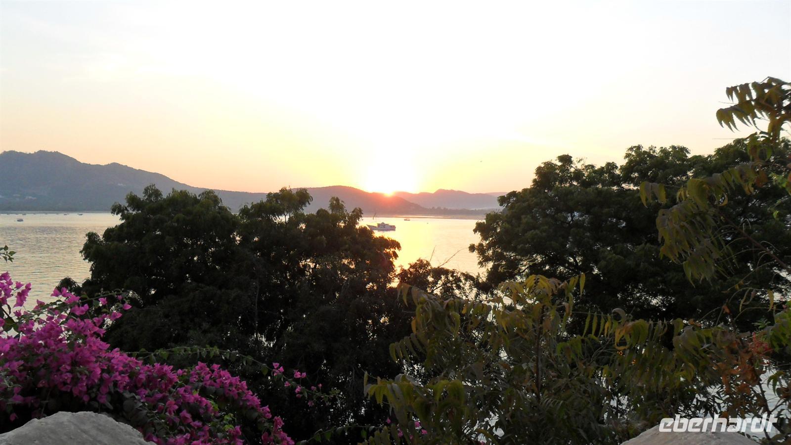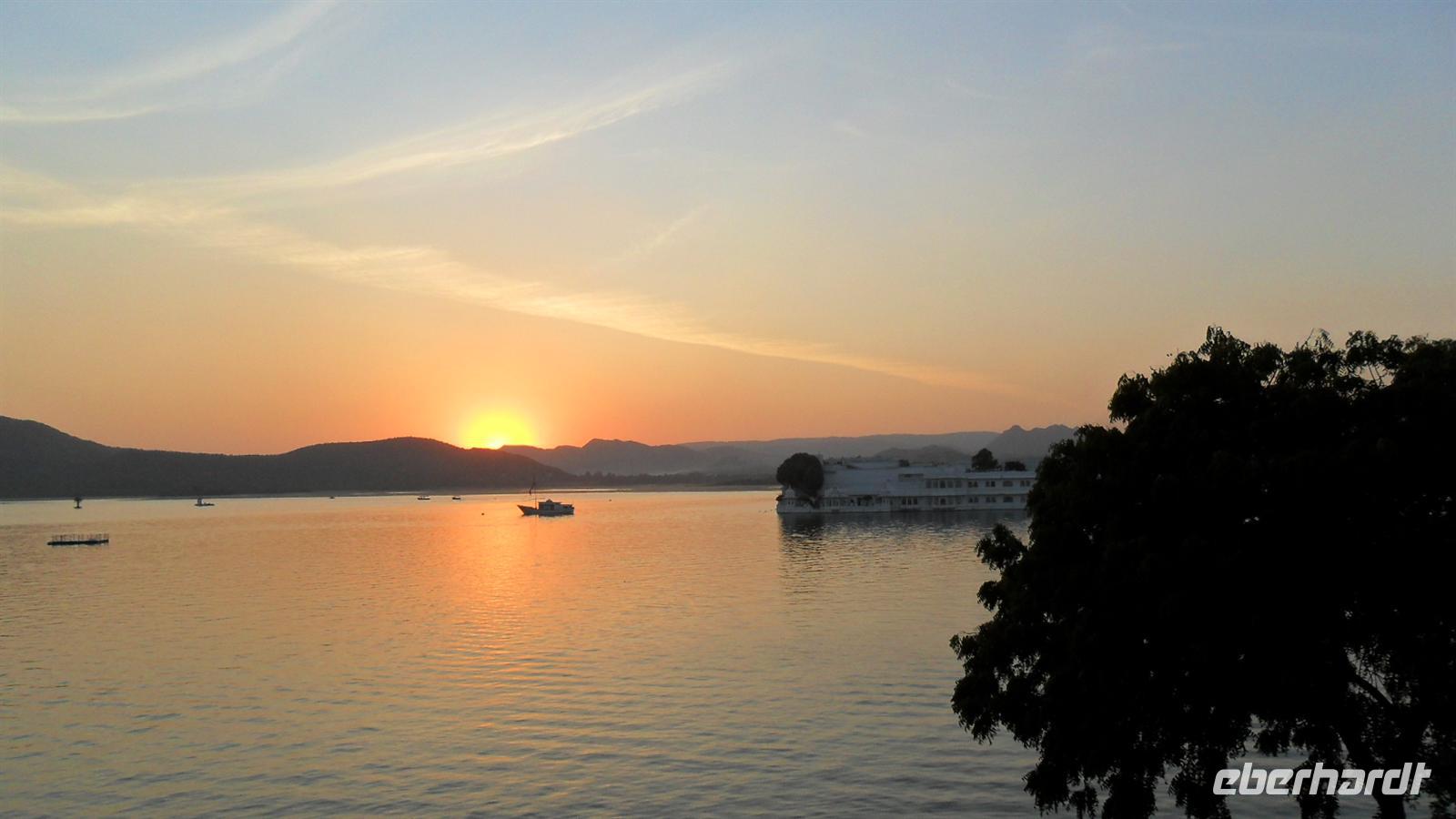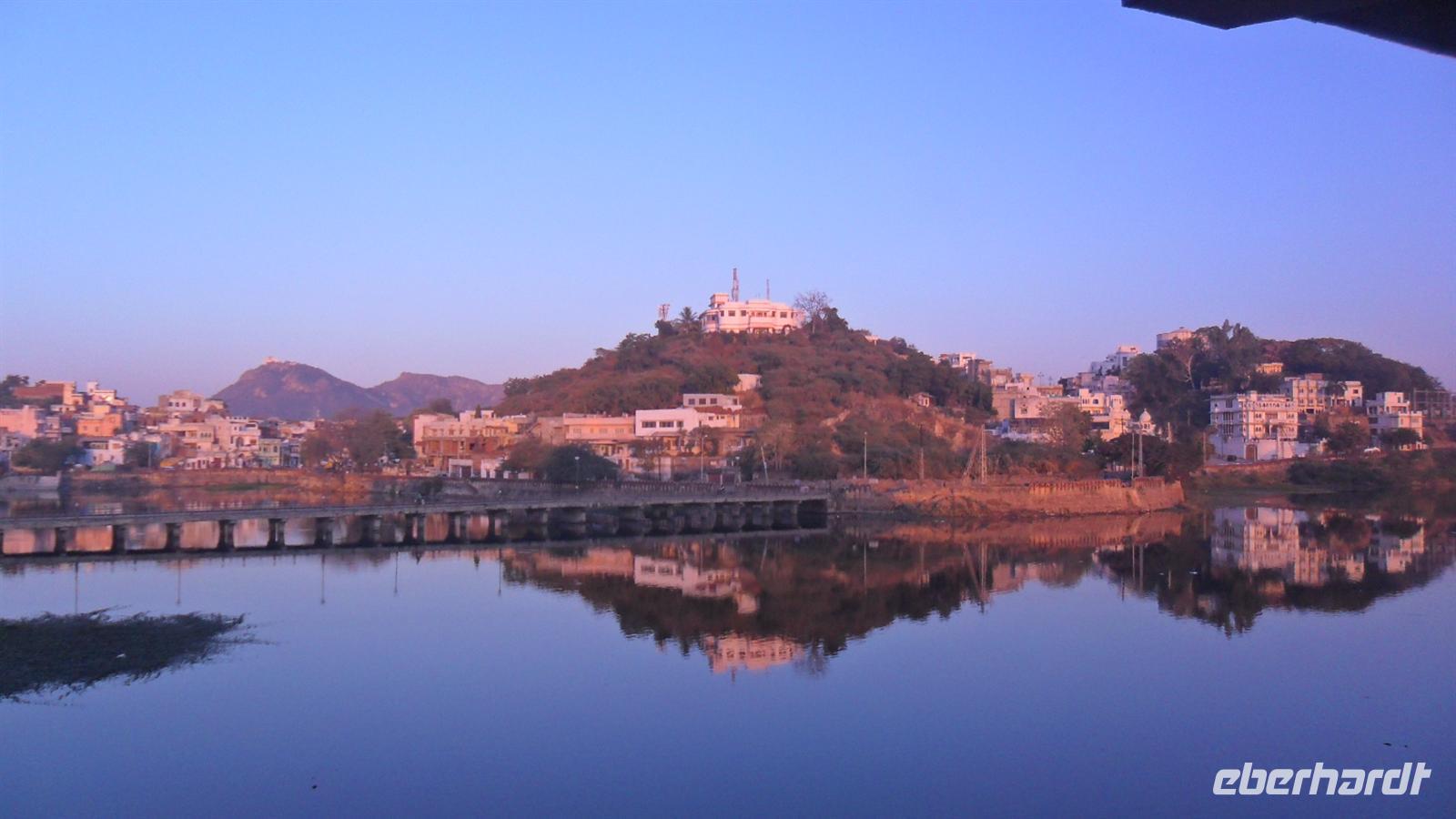 Die am Vorabend wegen Geburtstagsparty verlegte Bootsfahrt schloß sich an - und das Erlebnis des Hingleitens auf dem gut mit Wasser gefüllten Pichola-See war wie immer ein Genuß. Begeisterte Ausrufe kommentierten denn auch die herrlichen Ansichten vom Stadtschloß, das sich im Wasser spiegelt, von den Waschplätzen am See, an denen die Frauen Wäsche auf den Steintreppen waschen, die Vorbeifahrt am „Wasserschloß-Hotel“, das auf einer Insel liegt. Reed’s Nobelhotel ist heute eines der teuersten in Indien und kann von sich behaupten, eine berühmte Filmkulisse zu sein: Teile des achten James-Bond-Films „Octopussy“ wurden hier gedreht.