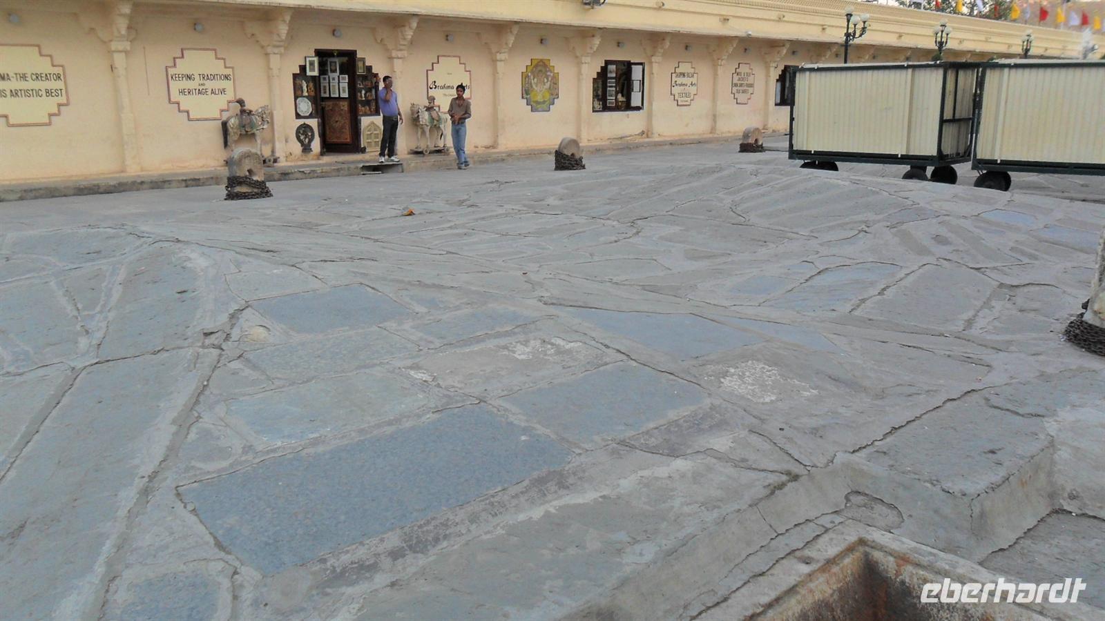Am fünften Reisetag legten wir eine besonders lange Strecke zurück. Unser Bus entsprach indiascher Norm und Tradition, aber nicht unbedingt der Vorstellungswelt der Europäer. Eines haben fast alle indischen Busse gemeinsam: die Klimaanlage, auf die man bei den subtropischen Temperaturen im allgemeinen nicht verzichten kann, scheint immer etwas zugig zu sein. So behalfen wir uns - wie bei fast jeder Indien-Tour üblich - mit dem Zukleben diverser Ritzen mittels eigens dazu mitgebrachten Klebebandes. Im Tagesverlauf erfuhren wir dann, dass die geplante abendliche Bootsfahrt nicht stattfinden könne, da der Maharadscha von Udaipur den See wegen einer Geburtstagsparty gesperrt habe. Wir ließen uns davon nicht beirren - rechtzeitig in Udaipur angekommen, zogen wir die Besichtigung des Stadtpalastes vor, und der Programmpunkt Bootsfahrt: musste auf den kommenden Morgen verschoben werden.