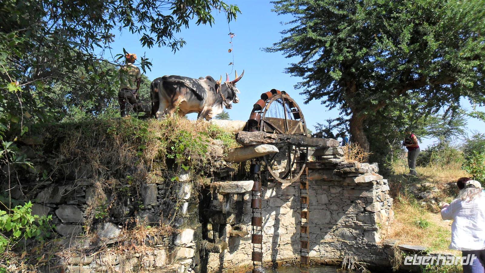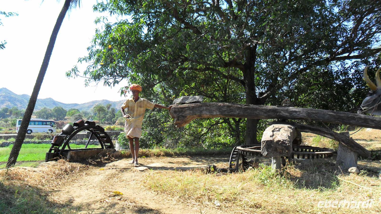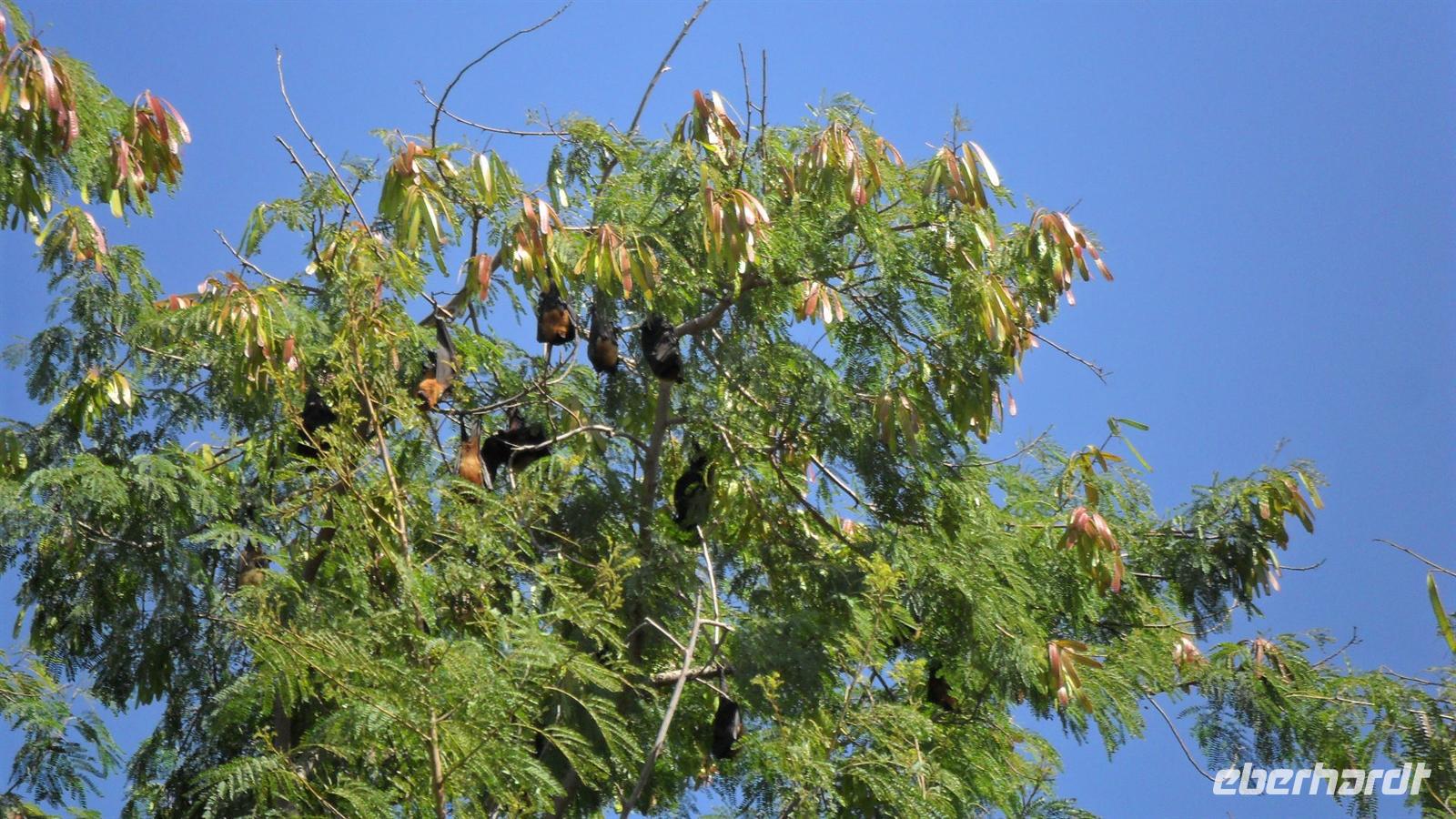 Nach der Bootsfahrt setzten wir die Indien-Tour im Bus fort - nach Ranakpur mit Fotostopps an den historischen Wasserschöpf-Anlagen im interessanten Aravalli-Gebirge und an einem Baum, in dem tagsüber zahlreiche Flughunde von ihren nächtlichen Aktivitäten ausruhen.