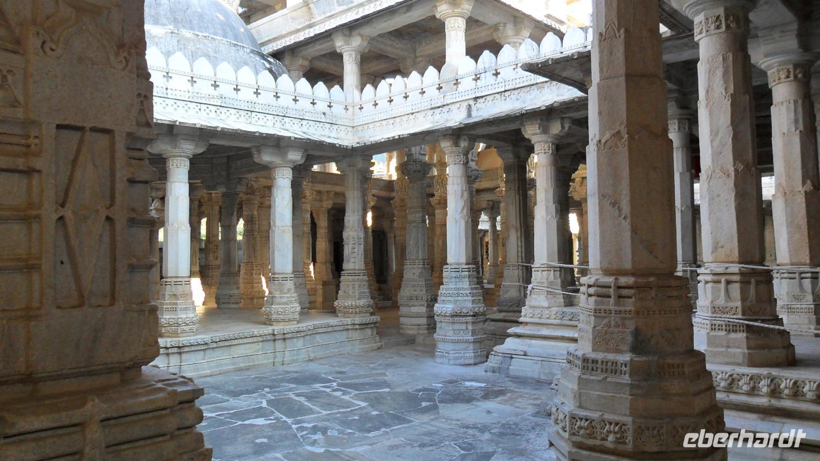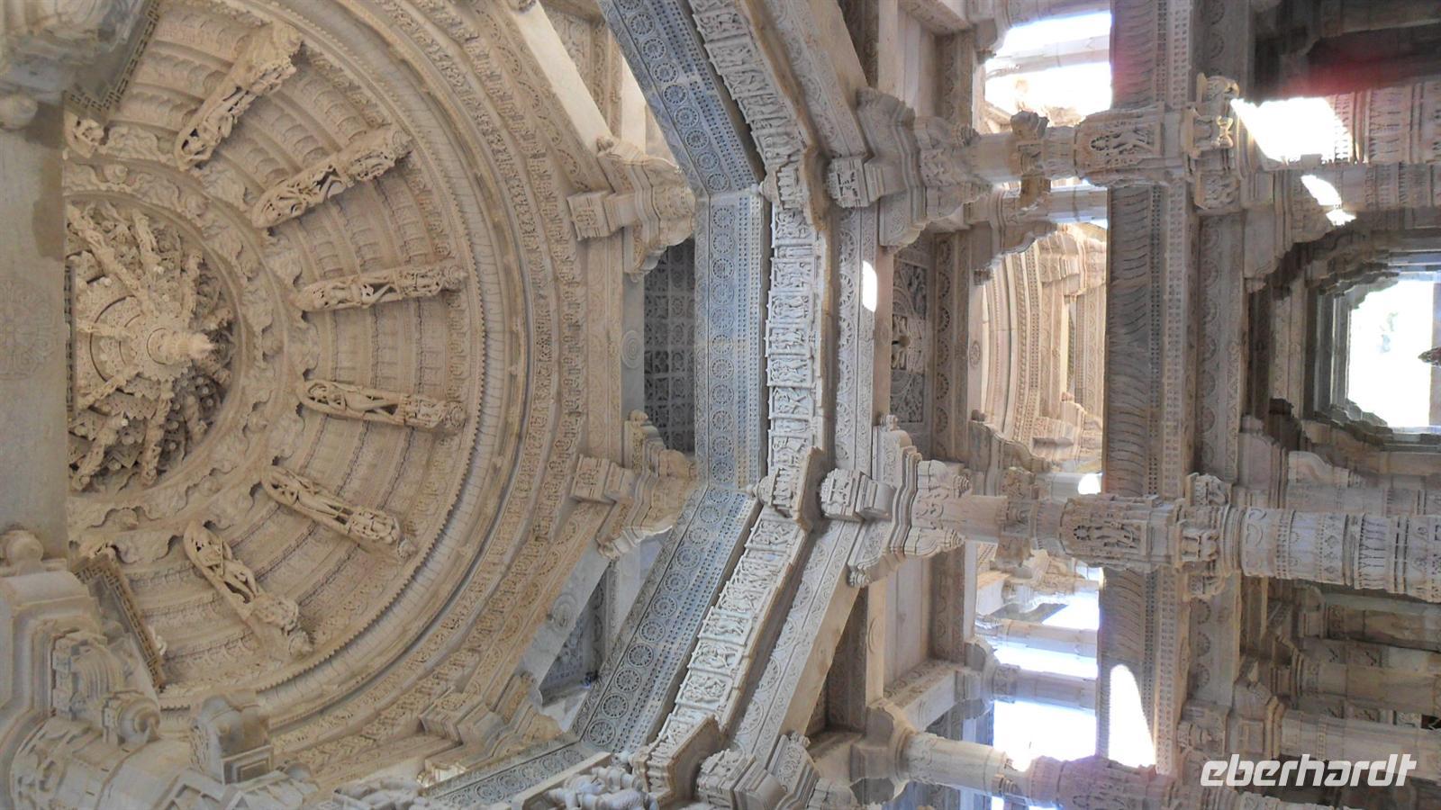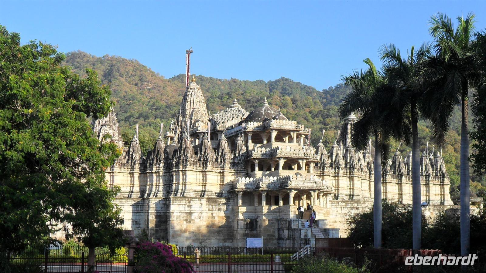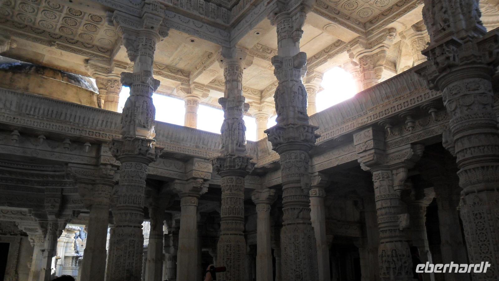 Höhepunkt des Tages ist aber zweifellos die Besichtigung der Jain-Tempelanlage von Ranakpur. Von außen unscheinbar, wartet der Haupttempel im Inneren mit überwältigenden 1440 mit Kerbschnitzerei versehenen weißen Marmorsäulen auf. Neben Dutzenden anderer Bilddarstellungen sind sie ein Paradestück indischen Kunsthandwerks - eine einzigartige Leistung, deren Formenvielfalt bisher immer noch unbekannte Künstler in das harte Gestein gruben.