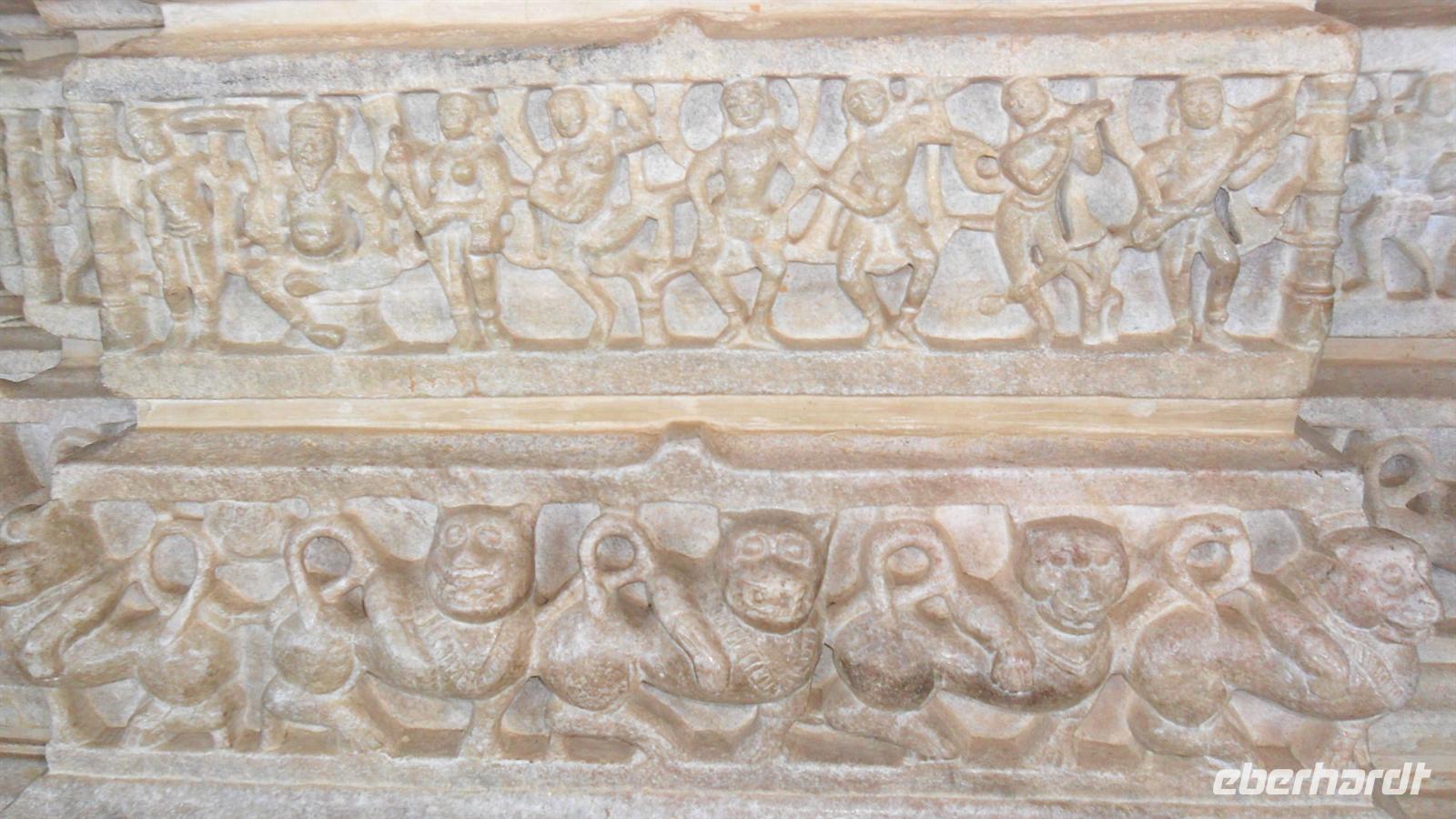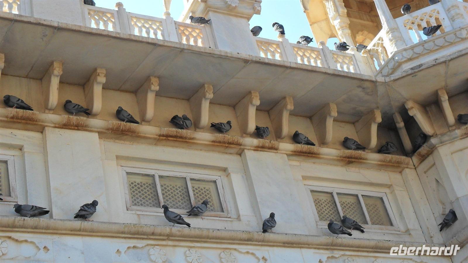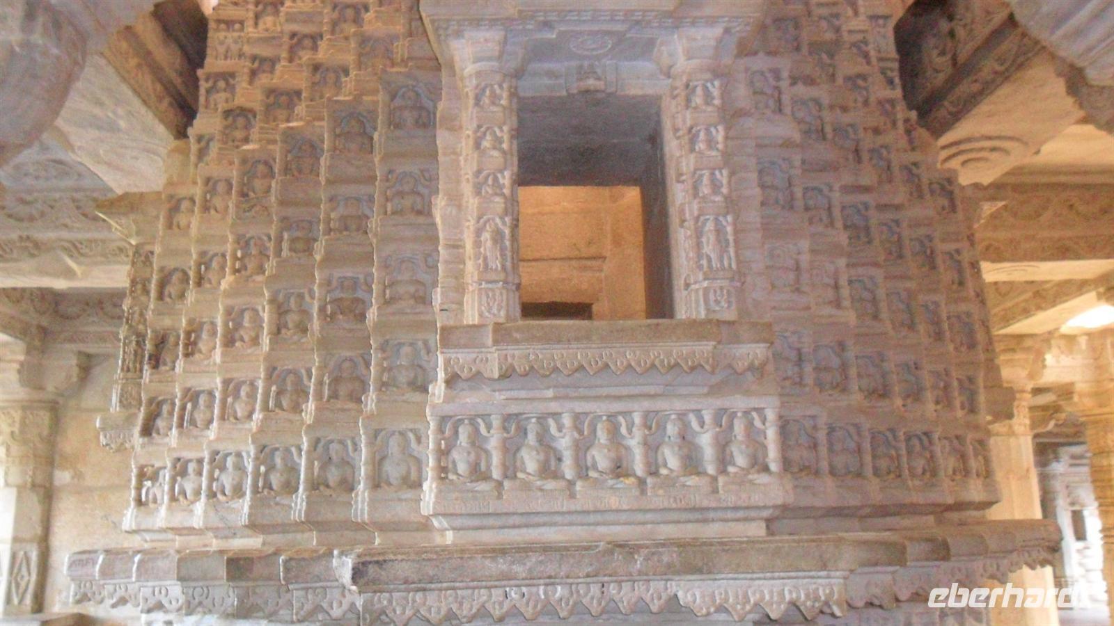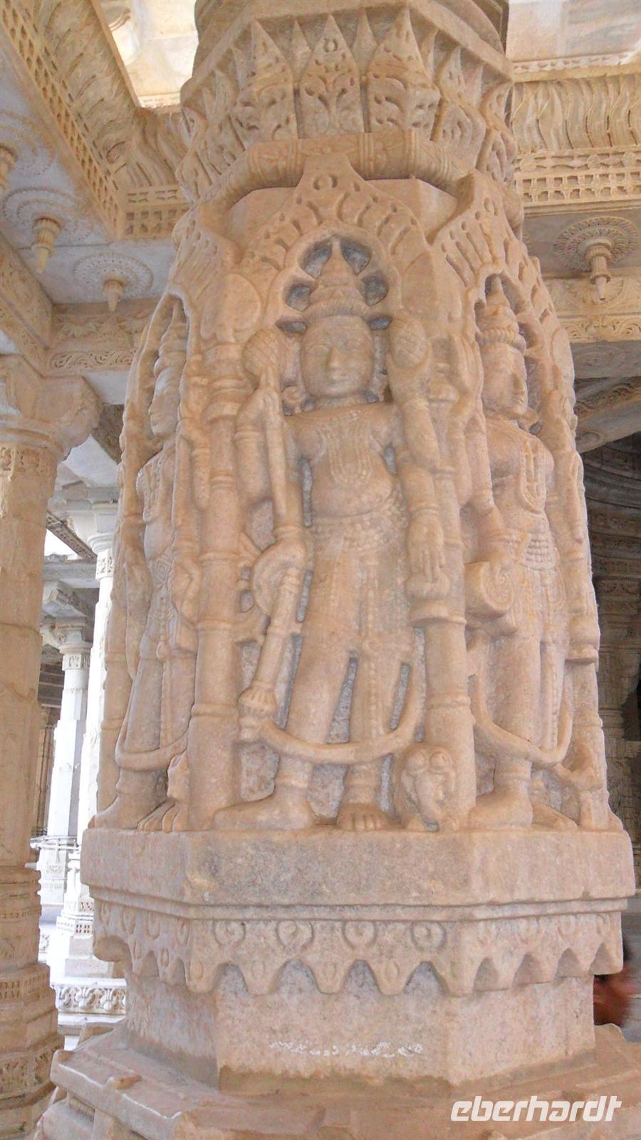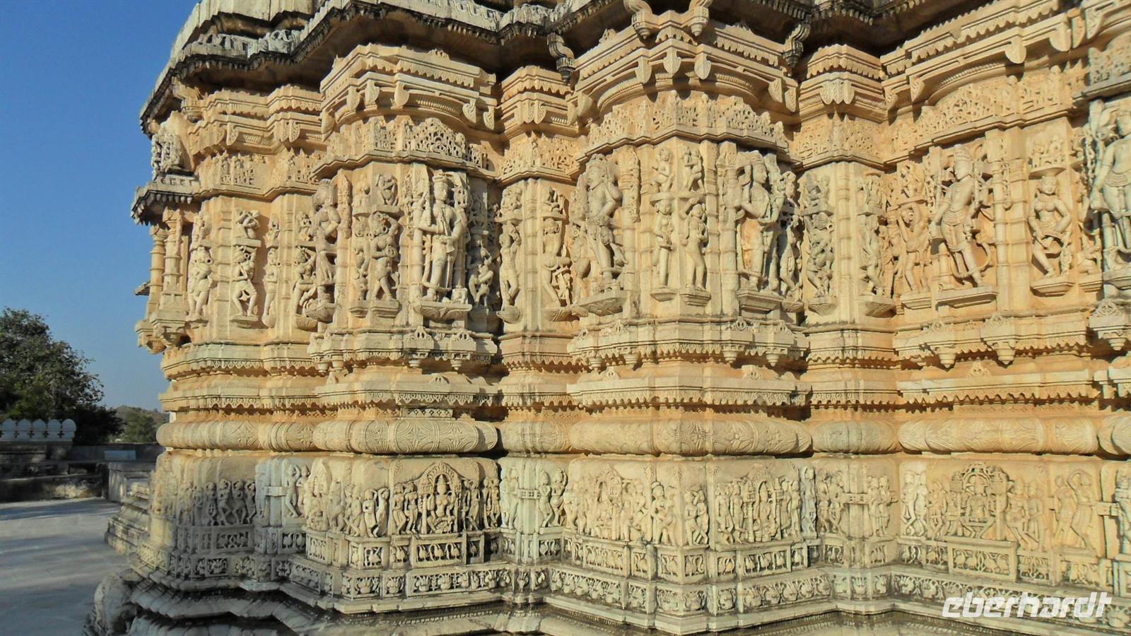 Höhepunkt des Tages ist aber zweifellos die Besichtigung der Jain-Tempelanlage von Ranakpur. Von außen unscheinbar, wartet der Haupttempel im Inneren mit überwältigenden 1440 mit Kerbschnitzerei versehenen weißen Marmorsäulen auf. Neben Dutzenden anderer Bilddarstellungen sind sie ein Paradestück indischen Kunsthandwerks - eine einzigartige Leistung, deren Formenvielfalt bisher immer noch unbekannte Künstler in das harte Gestein gruben.