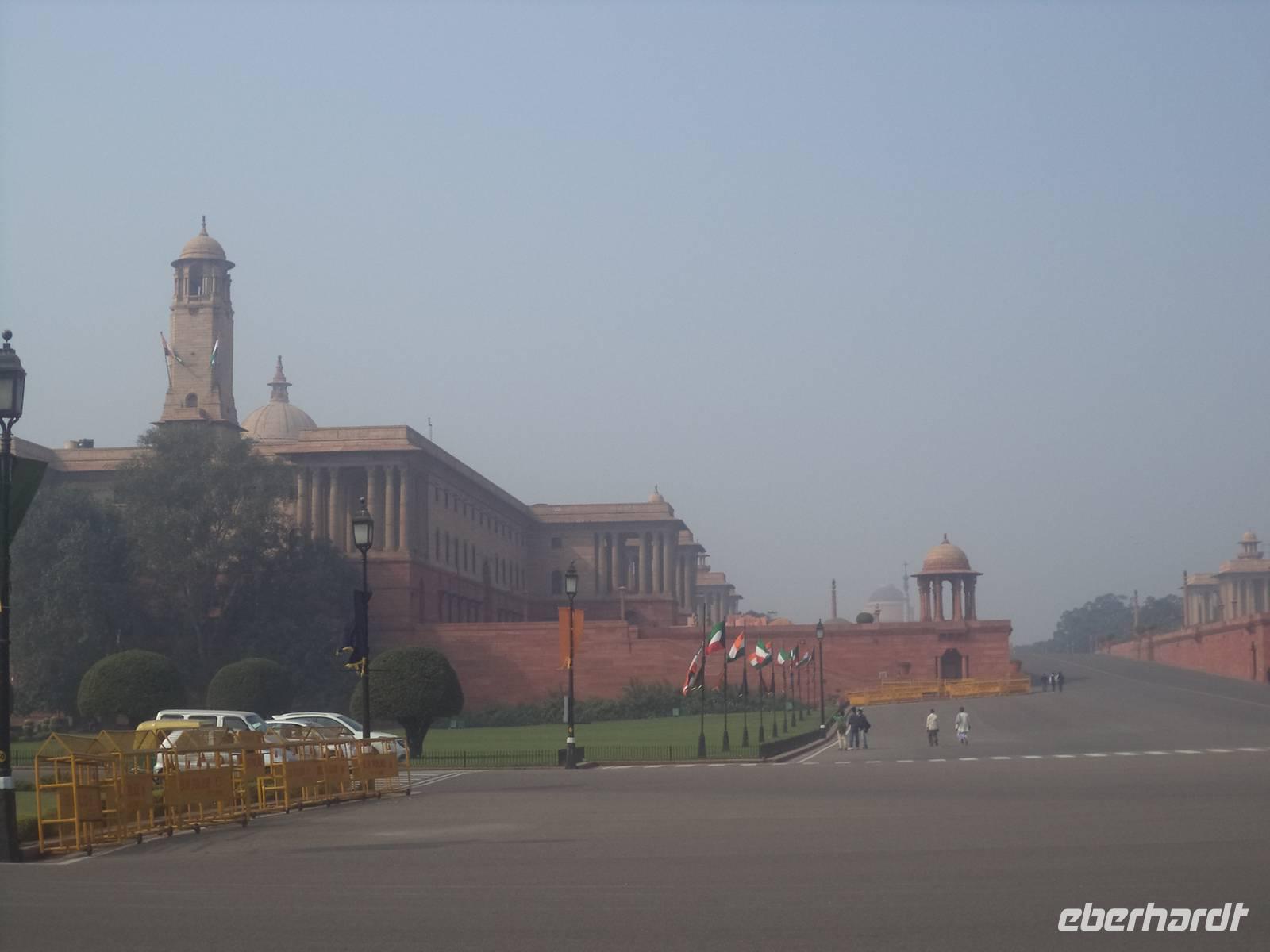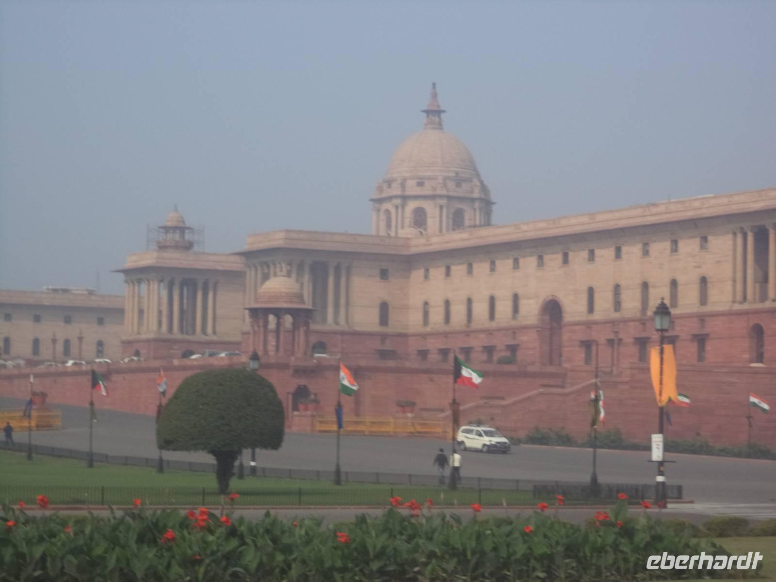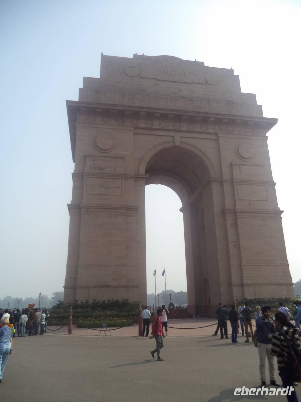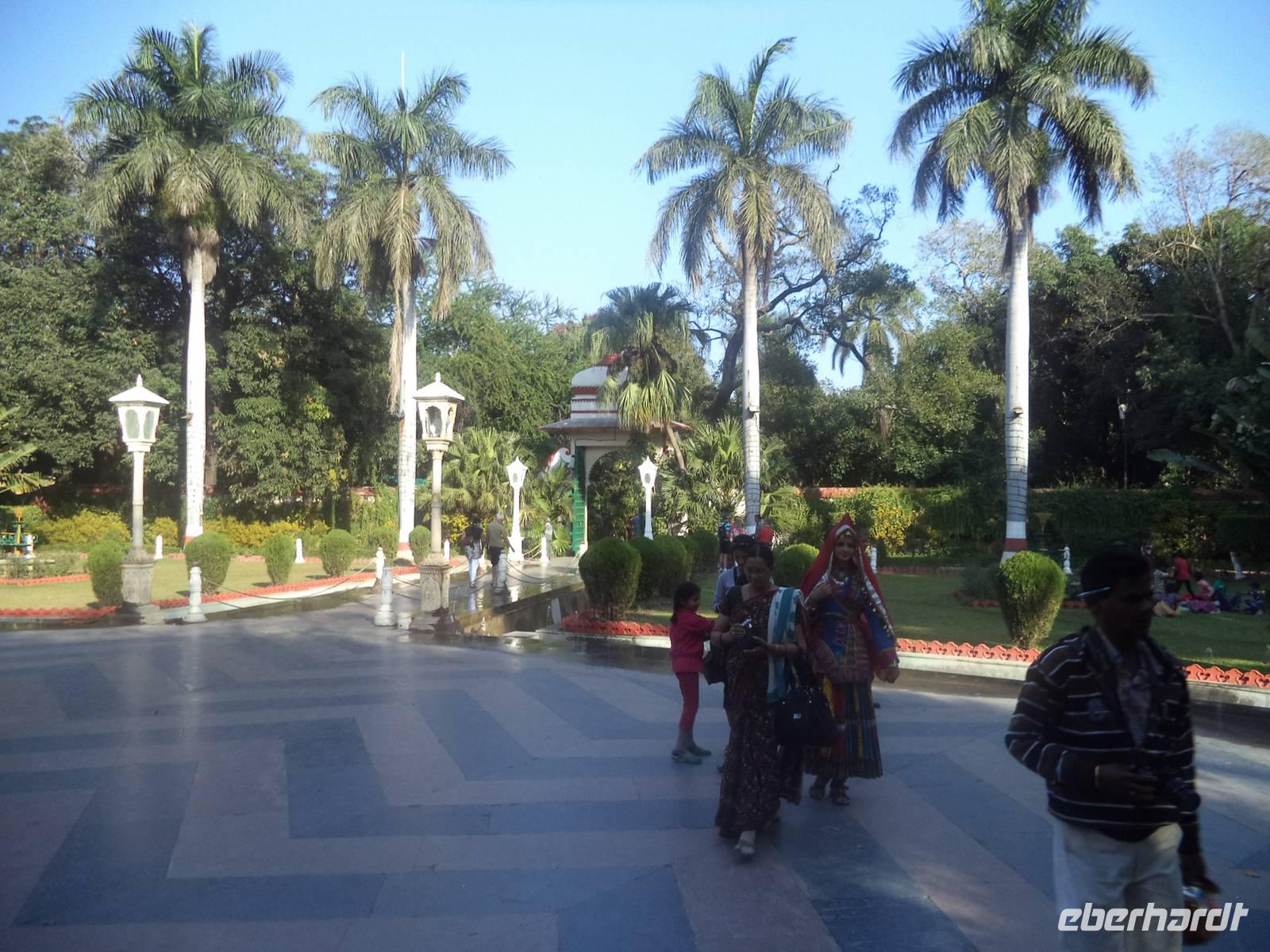 Wir starteten unsere Delhi-Tour zunächst mit einem Besuch in Neu Delhi, jenem Teil der Stadt, der ab 1911 in etwa 20 Jahren Bauzeit von den Briten als Verwaltungssitz ihrer Kolonie erbaut wurde und seit 1931 die Hauptstadt Kalkutta ablöste. Heute verwaltungsmäßig Teil der Millionenstadt Delhi ist das „Nationale Hauptstadt-Territorium Delhi" Regierungssitz der größten Demokratie der Welt, denn das ist Indien mit mehr als 1,2 Milliarden Einwohnern. Ganz nah kamen wir dieses Mal an den Palast des Präsidenten und des Vizepräsidenten und an das Parlament der „Bharat Ga?arajya" - wie die „Republik Indien" in der wichtigsten Landessprache Hindi heißt - heran. Dann fuhren wir zum „India Gate", dem 42 m hohen Triumphbogen, 1921 vom berühmten englischen Architekten Sir Edwin Landseer Lutyens entworfen und als Monument zum Gedenken an die indischen Kriegstoten des ersten Weltkrieges erbaut und mit 90.000 eingravierten Namen versehen. Hier ist immer etwas los, denn neben den buntgekleideten Wachen aus indischen Garderegimentern versammeln sich hier stets zahlreiche Besucher und viele indische Touristen.
