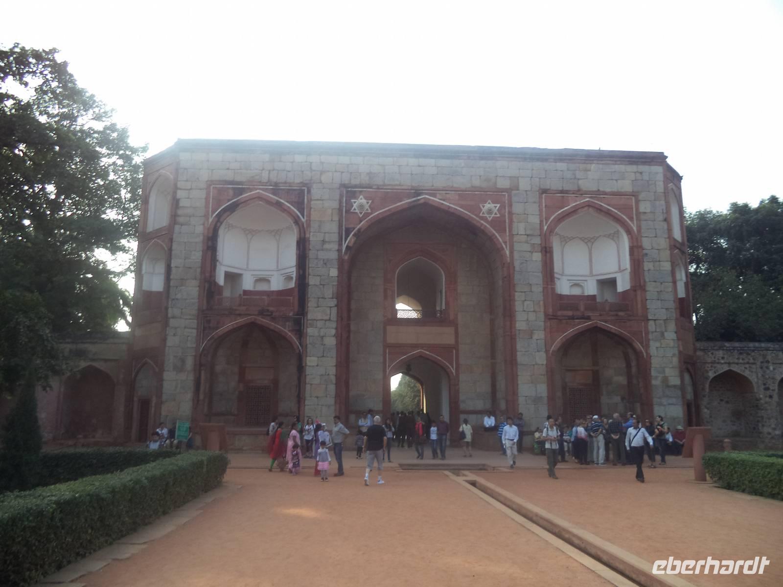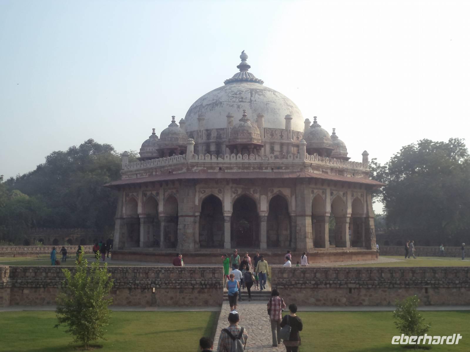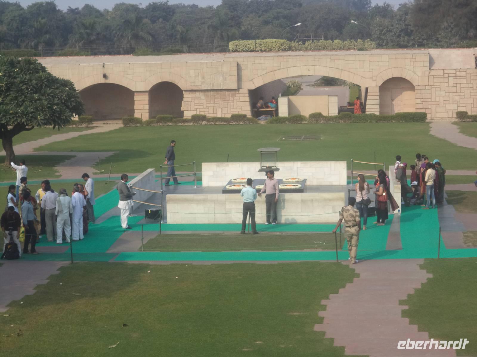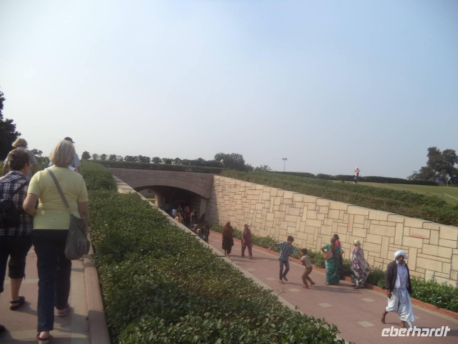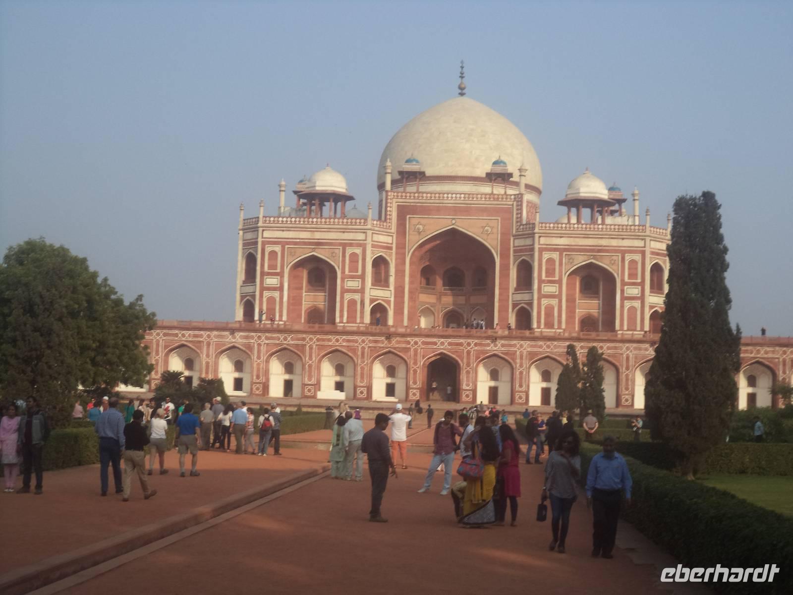 Unser nächster Besuch galt dem Rajghat, der Stätte, an der einst Mahatma Ghandis Körper nach Hindusitte dem Feuer übergeben wurde. Bis heute genießt der Gründer Indiens hier große Verehrung, was auch in seinem Beinamen „Mahatma" (="große Seele") manifestiert ist. Unser letzter Besichtigungspunkt für heute war dann das Grabmal des Humayun, des zweiten der bedeutenden Mogulherrscher. Der in rotem Sandstein gehaltene und mit weißem Marmor prächtig abgesetzte Bau gehört nicht nur zum UNESCO-Weltkulturerbe, er gilt unter Kennern mitunter auch als architektonischer Vorgänger des berühmtesten aller indischen Gebäude, des Taj Mahal, das wir am nächsten Tag sehen würden. Hier im Grabmal des Humayun wurde in der berühmten weißen Kuppel erstmal die damals neue und revolutionäre Technik der Doppelkuppel verwendet.